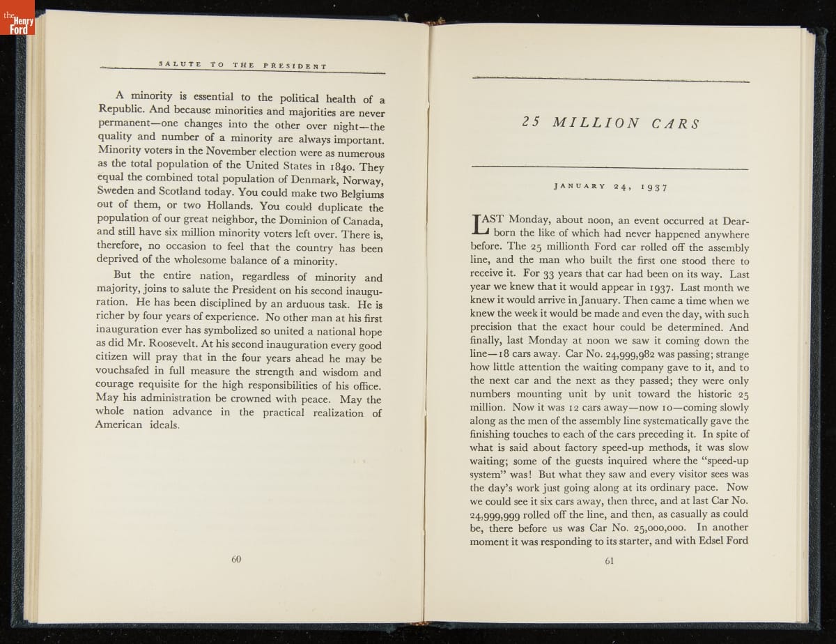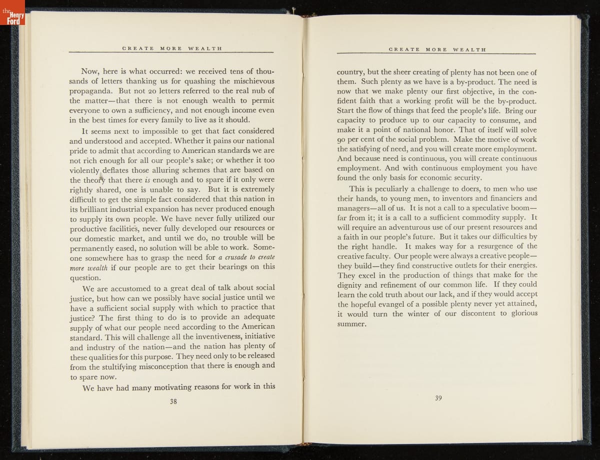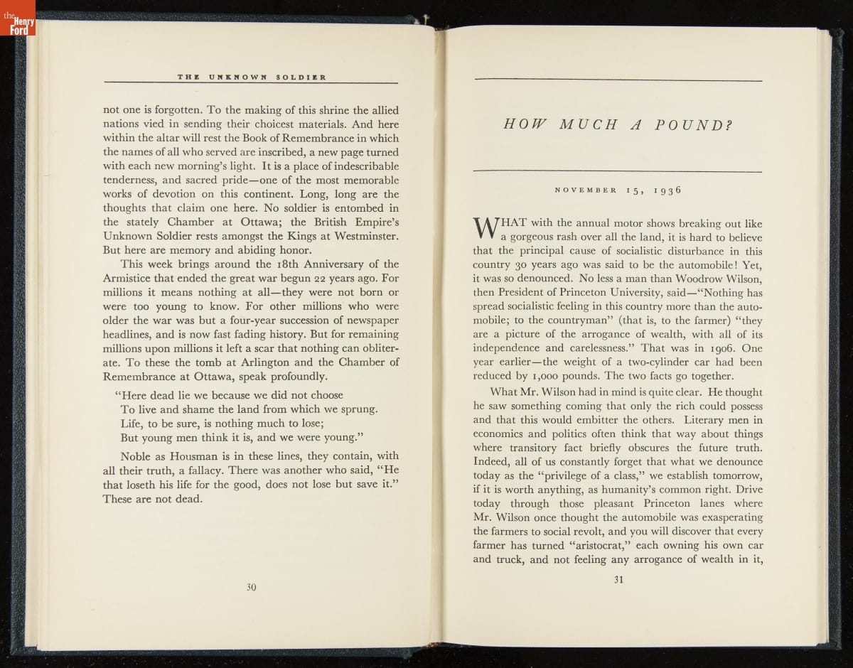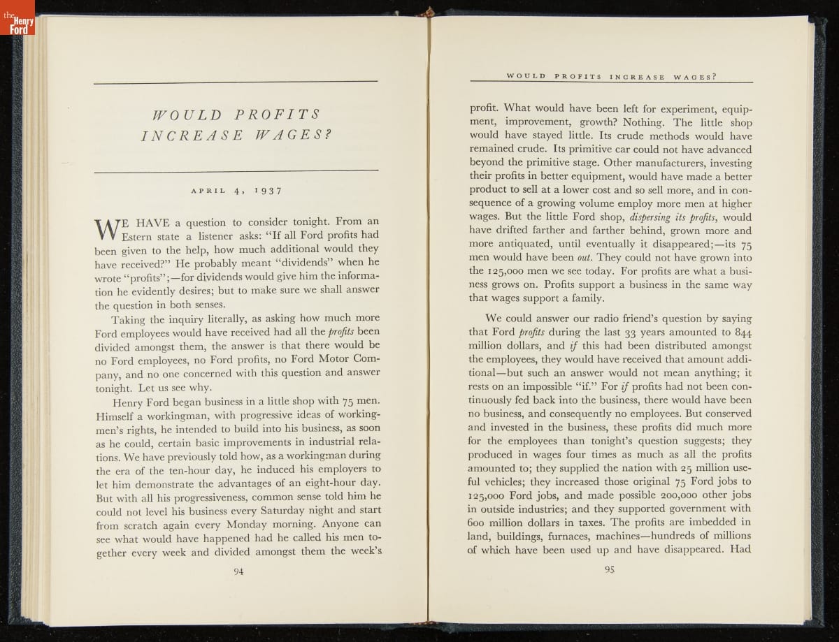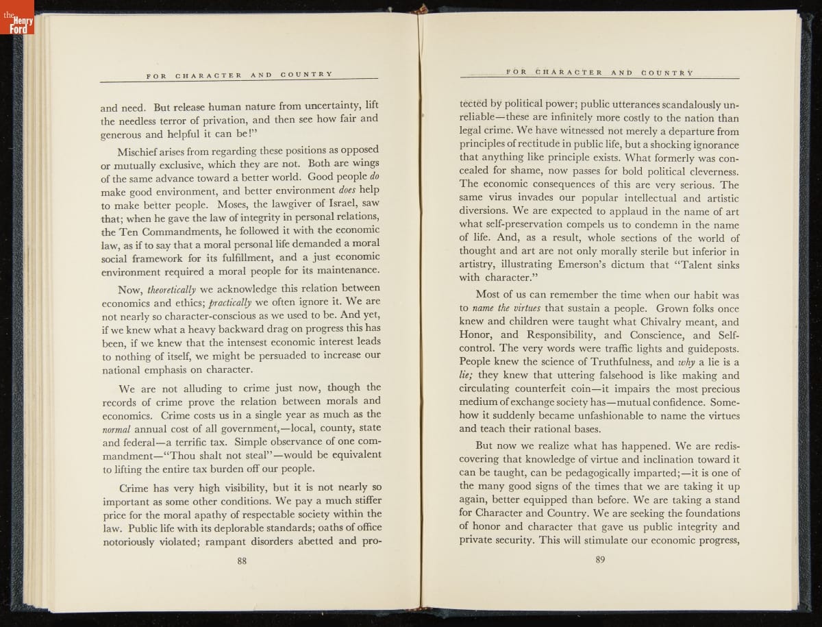 Launched in 1934, the Ford Sunday Evening Hour radio program featured classical music, guest soloists and conductors, and a weekly talk during intermission. Henry Ford asked his friend and advisor William J. Cameron to write and deliver these messages. Cameron, who composed the anti-Semitic articles for The Dearborn Independent, now peddled softer populist views--avoiding extremes and any direct attacks on politicians, ethnic groups, or Wall Street financiers.