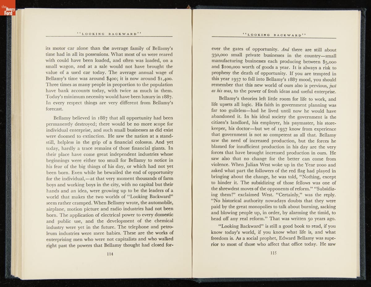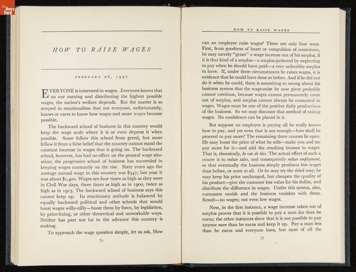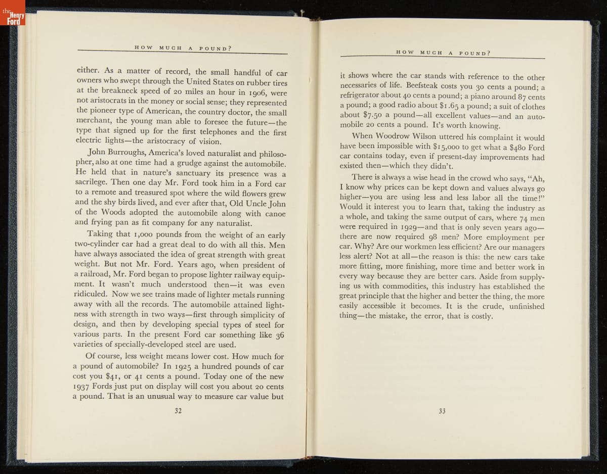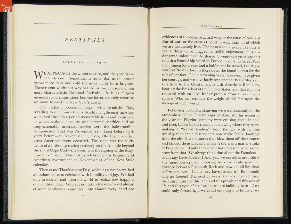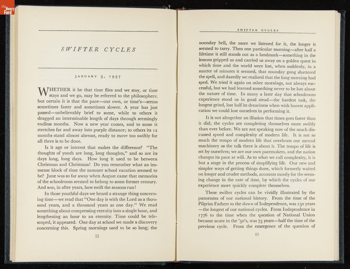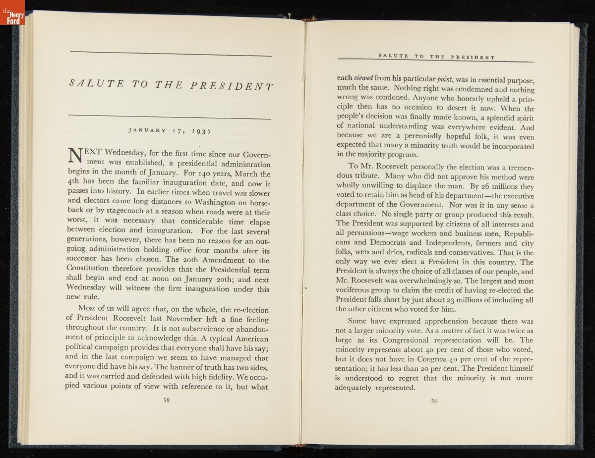 Launched in 1934, the Ford Sunday Evening Hour radio program featured classical music, guest soloists and conductors, and a weekly talk during intermission. Henry Ford asked his friend and advisor William J. Cameron to write and deliver these messages. Cameron, who composed the anti-Semitic articles for The Dearborn Independent, now peddled softer populist views--avoiding extremes and any direct attacks on politicians, ethnic groups, or Wall Street financiers.