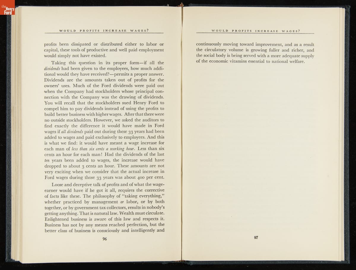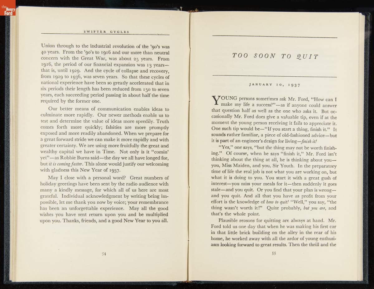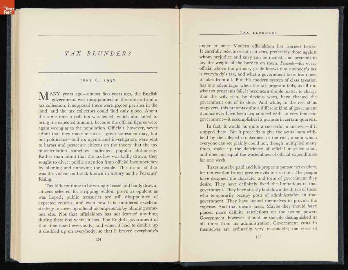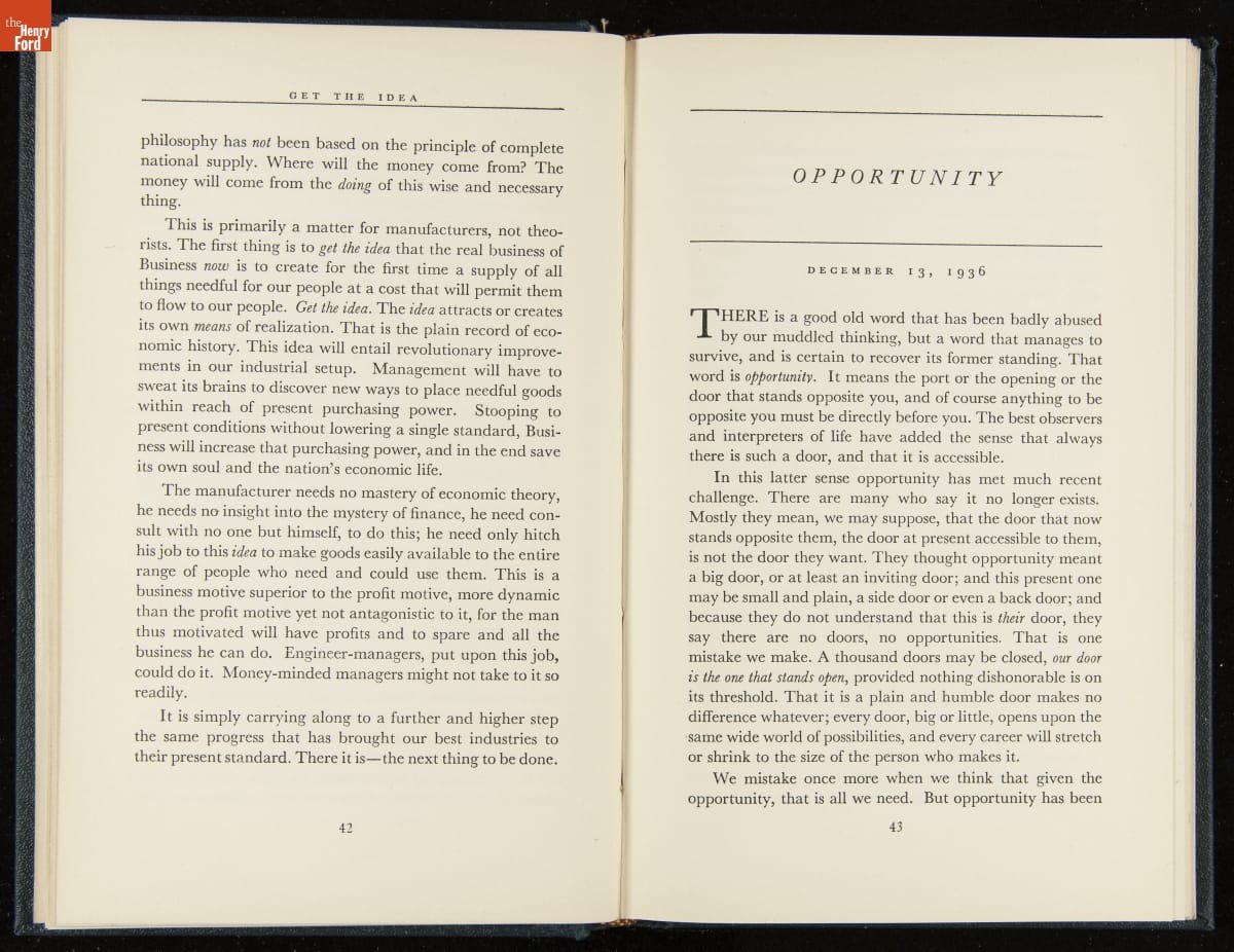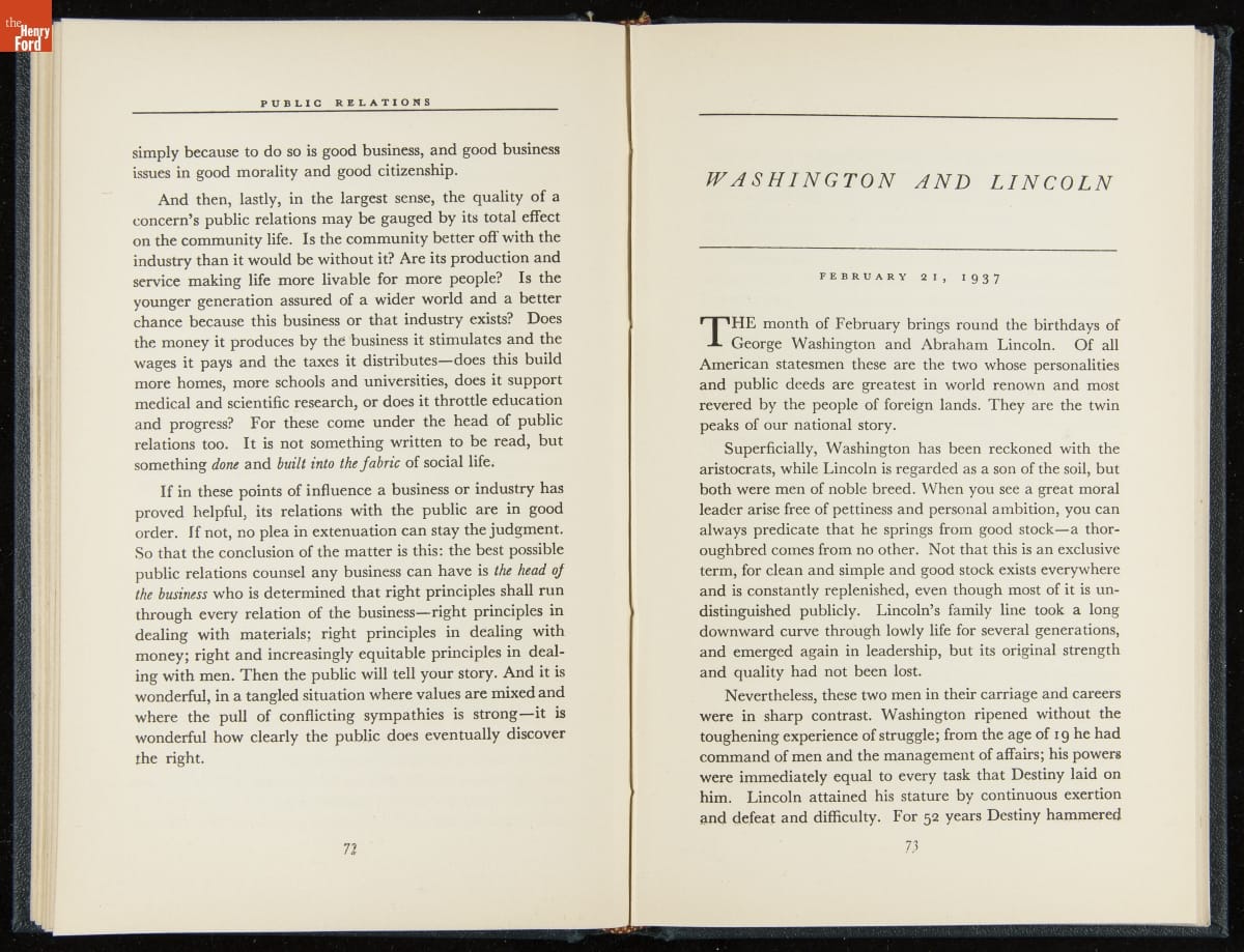 Launched in 1934, the Ford Sunday Evening Hour radio program featured classical music, guest soloists and conductors, and a weekly talk during intermission. Henry Ford asked his friend and advisor William J. Cameron to write and deliver these messages. Cameron, who composed the anti-Semitic articles for The Dearborn Independent, now peddled softer populist views--avoiding extremes and any direct attacks on politicians, ethnic groups, or Wall Street financiers.