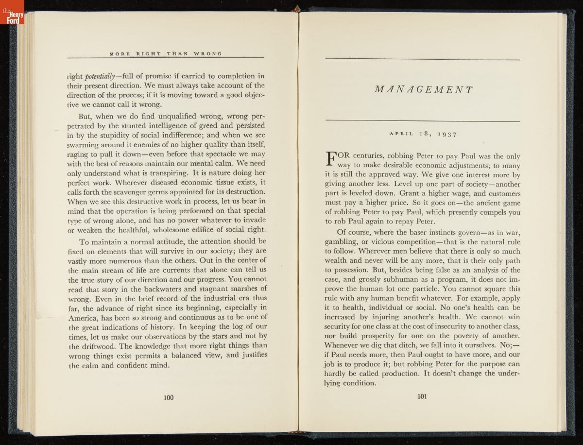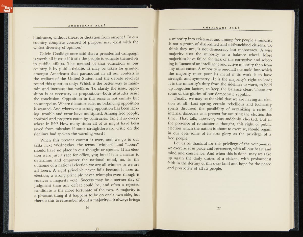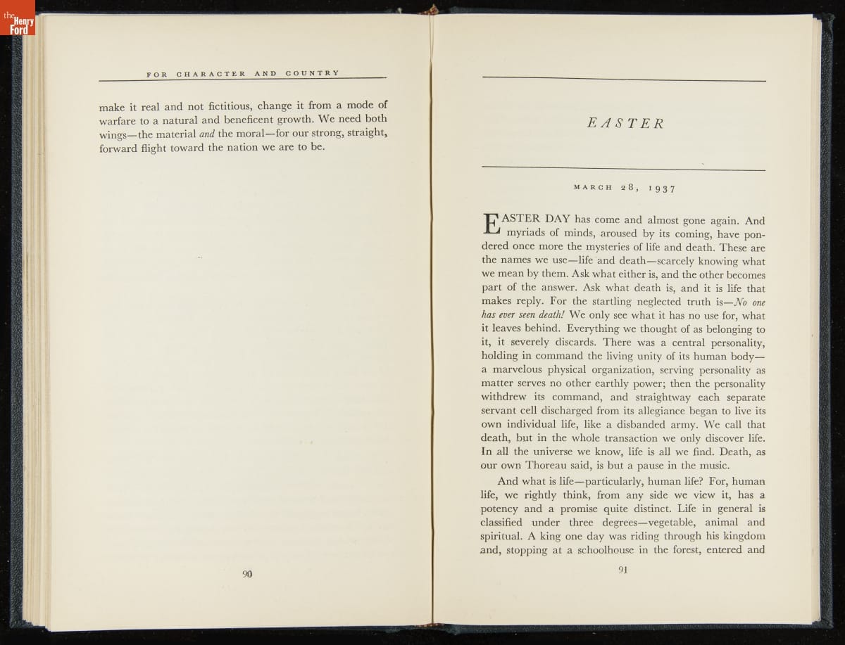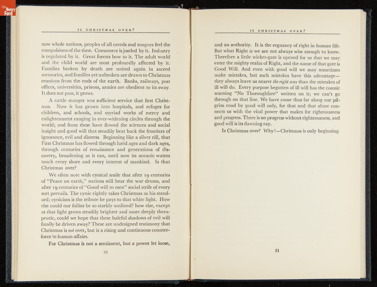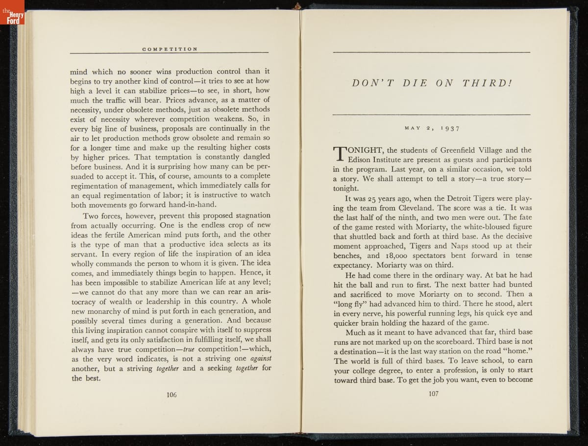 Launched in 1934, the Ford Sunday Evening Hour radio program featured classical music, guest soloists and conductors, and a weekly talk during intermission. Henry Ford asked his friend and advisor William J. Cameron to write and deliver these messages. Cameron, who composed the anti-Semitic articles for The Dearborn Independent, now peddled softer populist views--avoiding extremes and any direct attacks on politicians, ethnic groups, or Wall Street financiers.