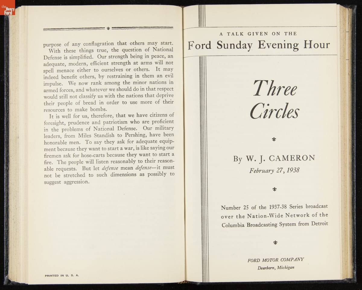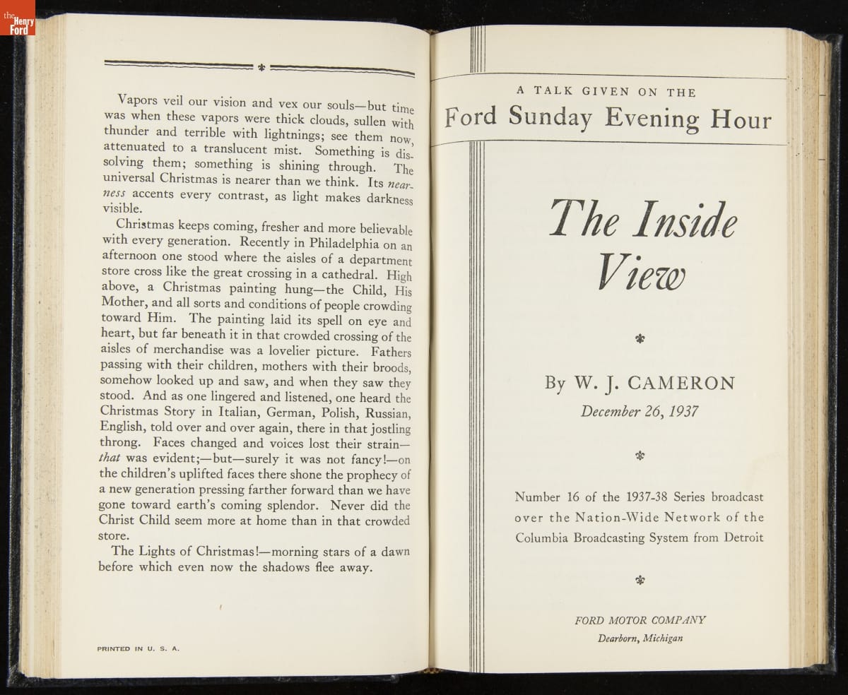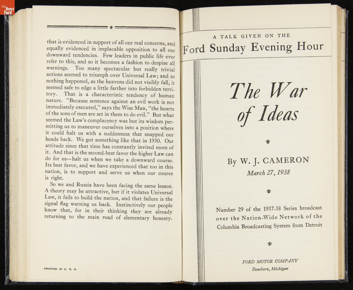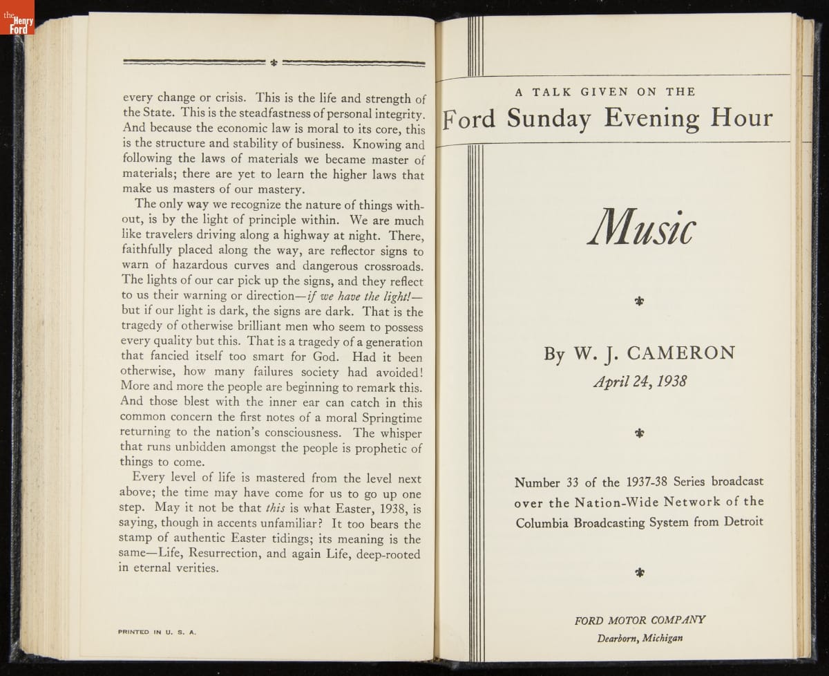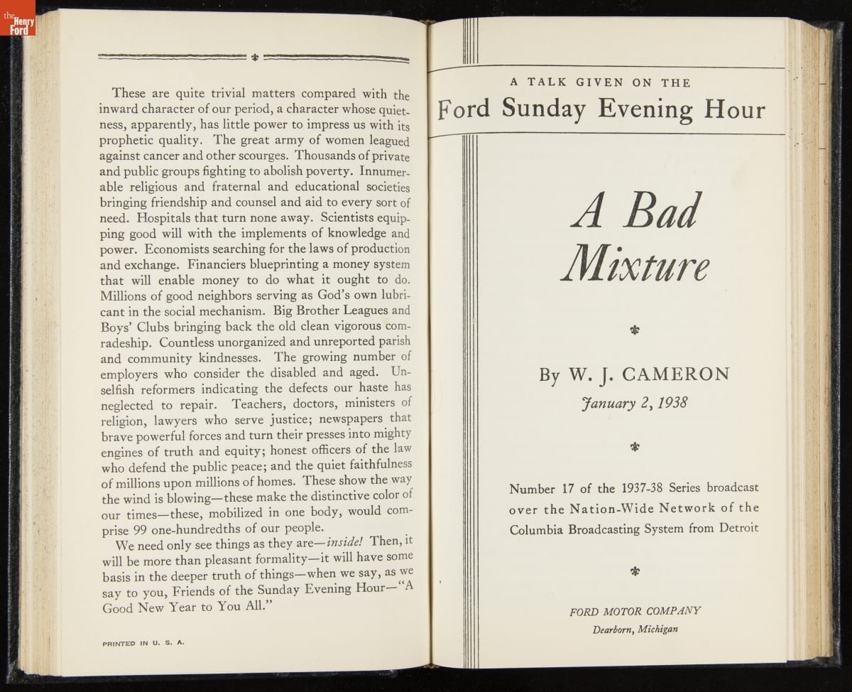 Launched in 1934, the Ford Sunday Evening Hour radio program featured classical music, guest soloists and conductors, and a weekly talk during intermission. Henry Ford asked his friend and advisor William J. Cameron to write and deliver these messages. Cameron, who composed the anti-Semitic articles for The Dearborn Independent, now peddled softer populist views--avoiding extremes and any direct attacks on politicians, ethnic groups, or Wall Street financiers.