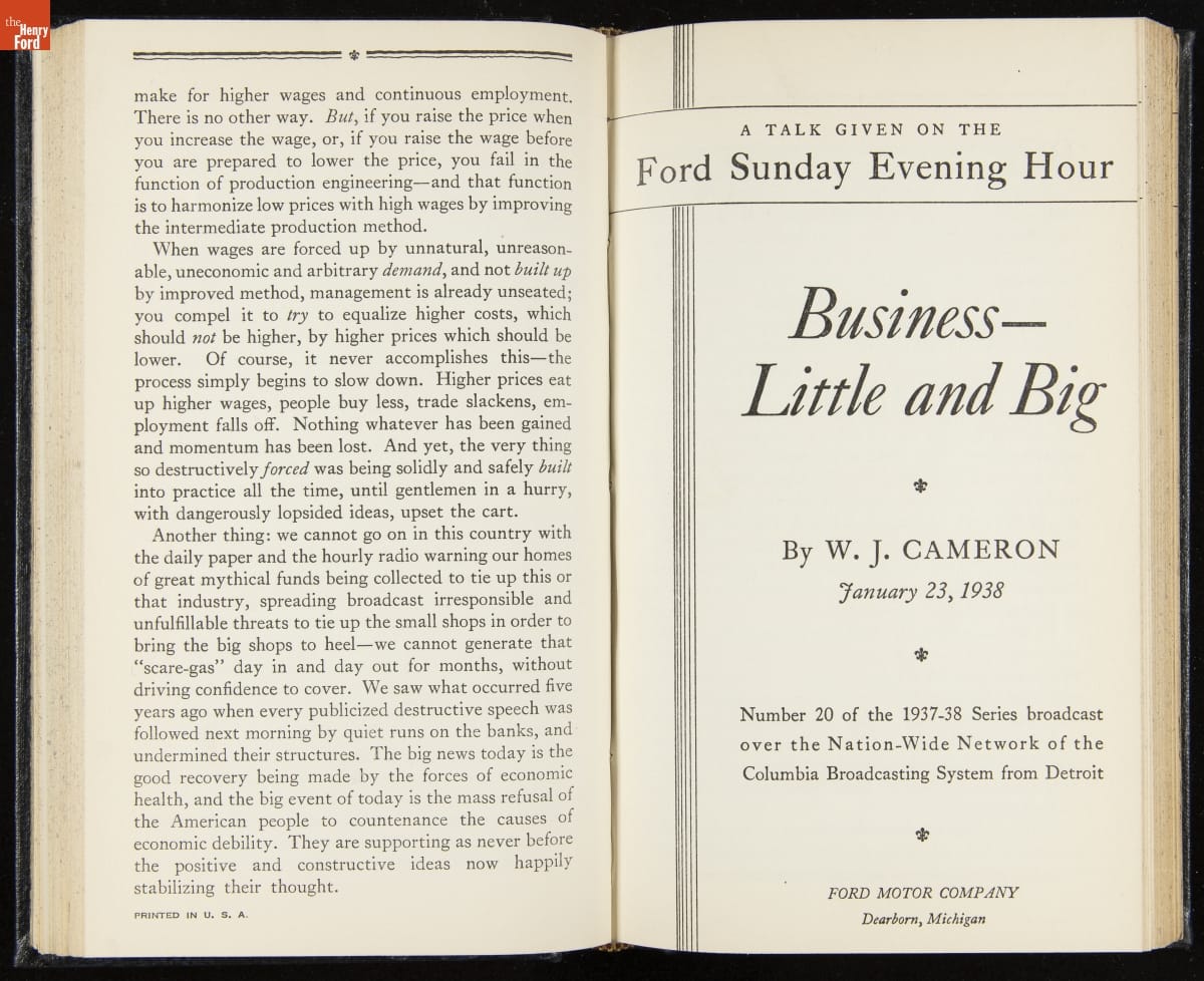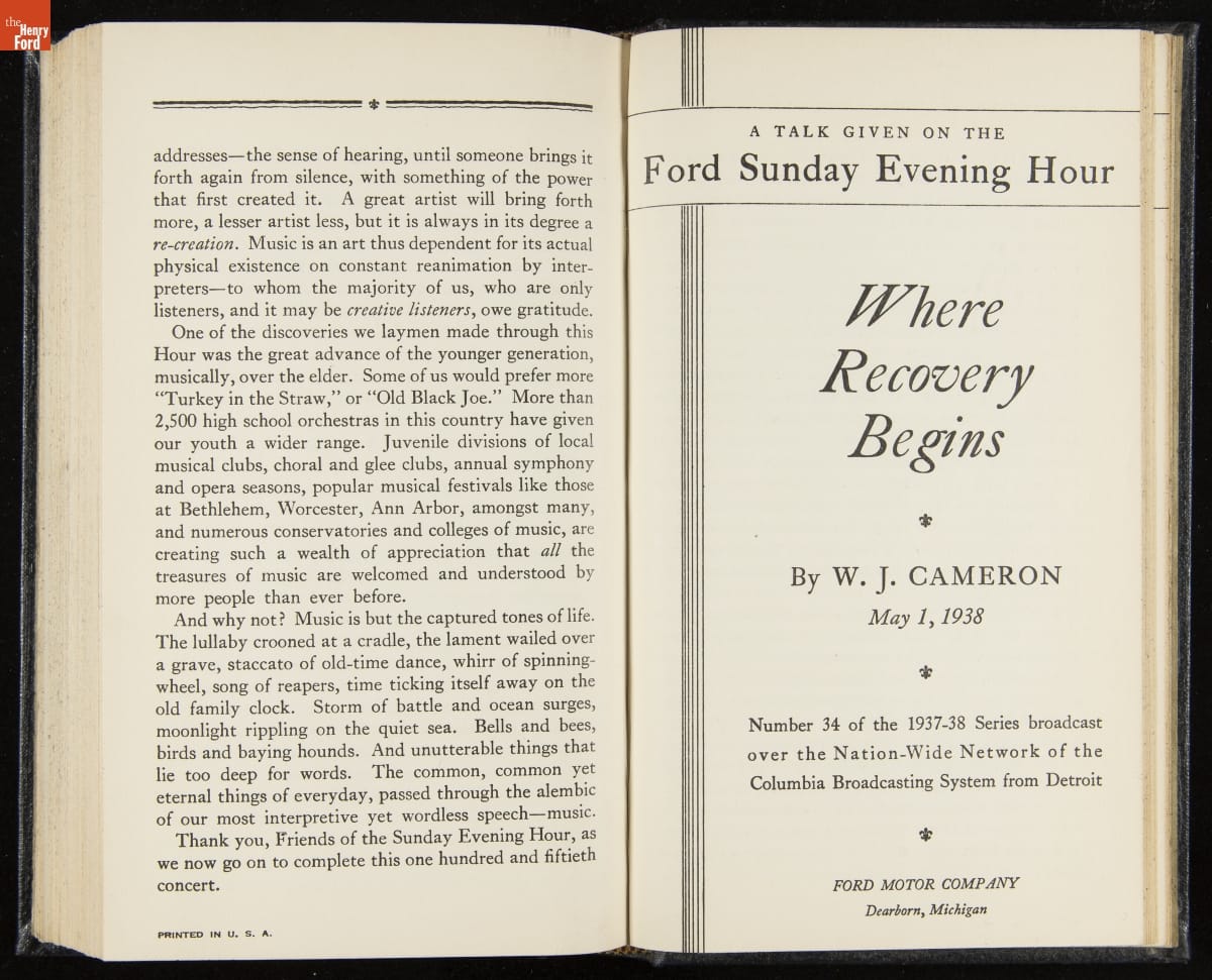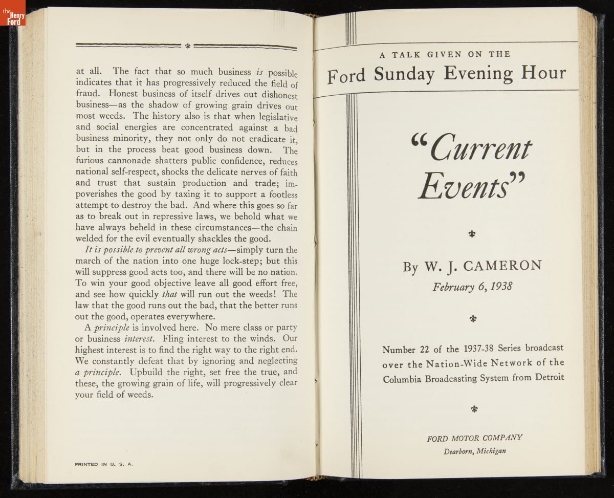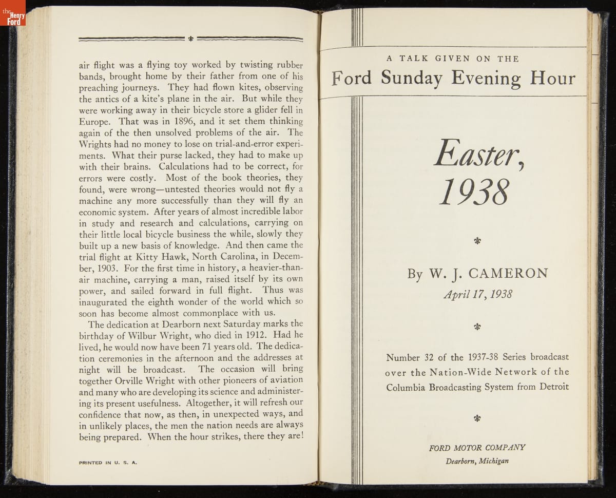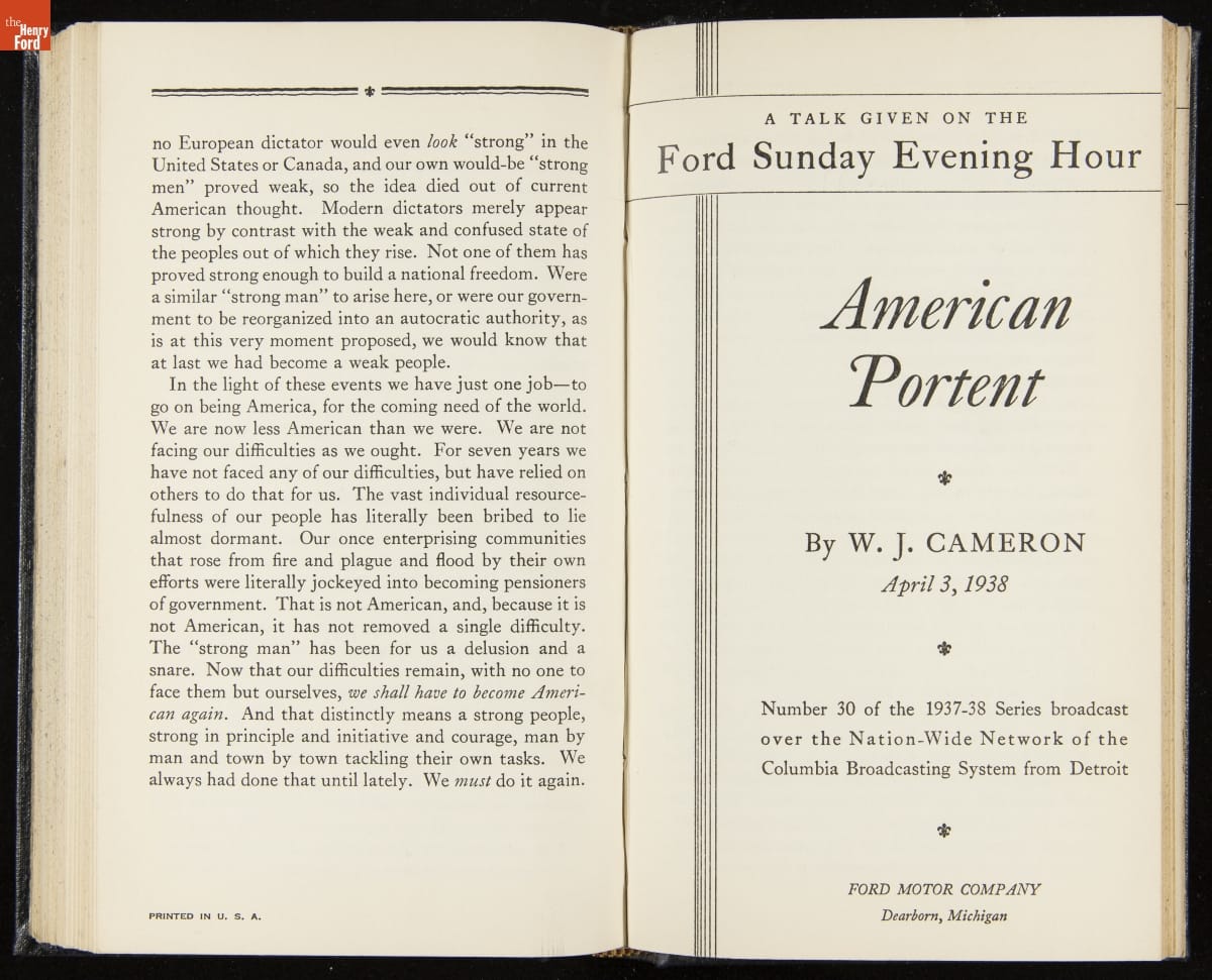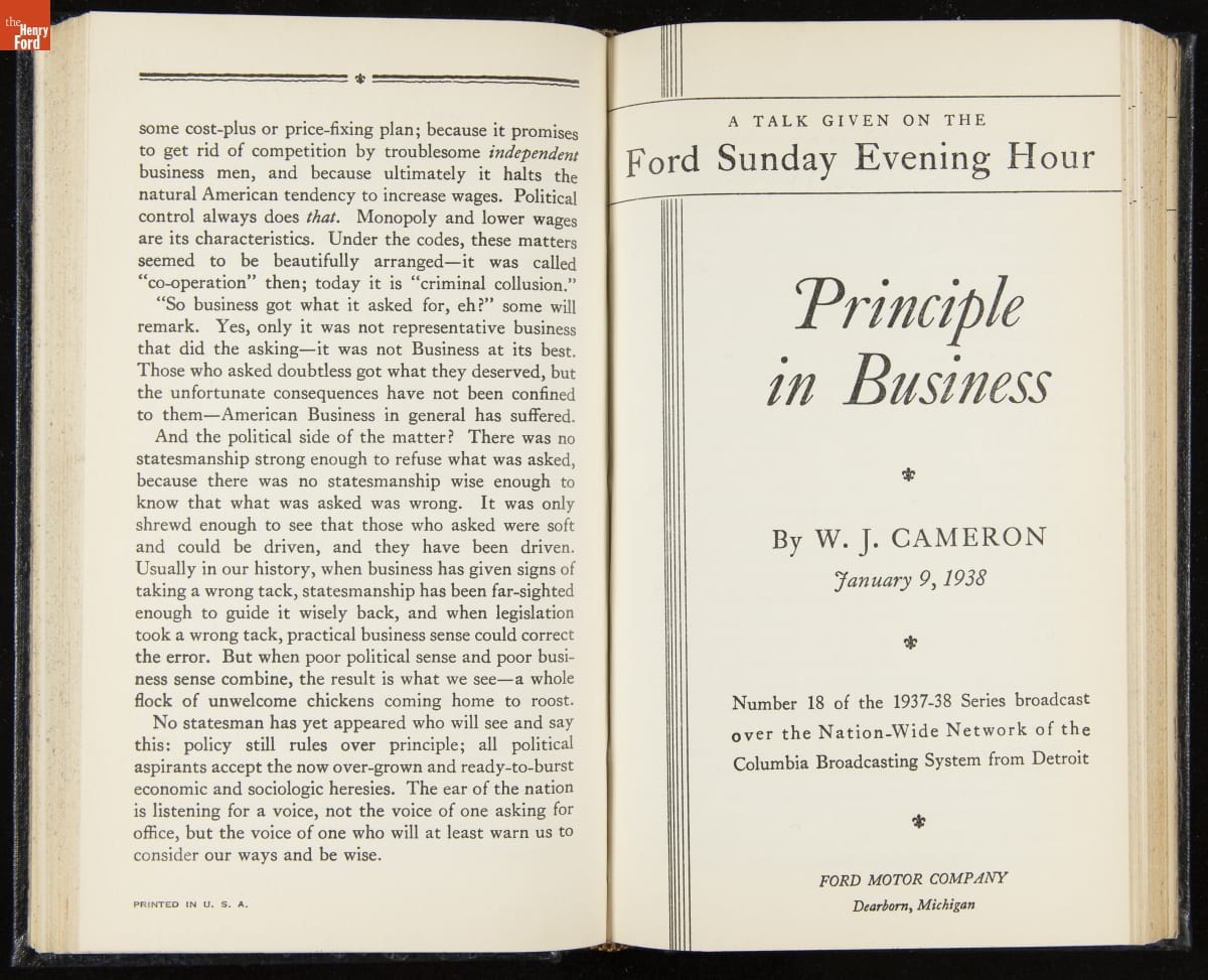 Launched in 1934, the Ford Sunday Evening Hour radio program featured classical music, guest soloists and conductors, and a weekly talk during intermission. Henry Ford asked his friend and advisor William J. Cameron to write and deliver these messages. Cameron, who composed the anti-Semitic articles for The Dearborn Independent, now peddled softer populist views--avoiding extremes and any direct attacks on politicians, ethnic groups, or Wall Street financiers.