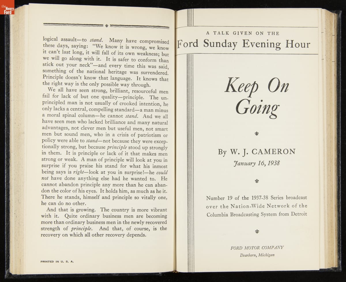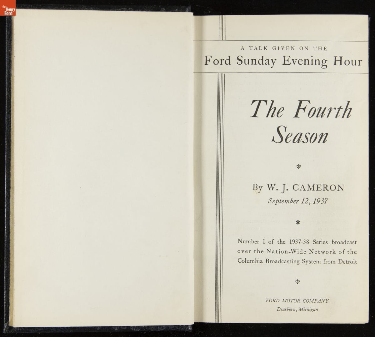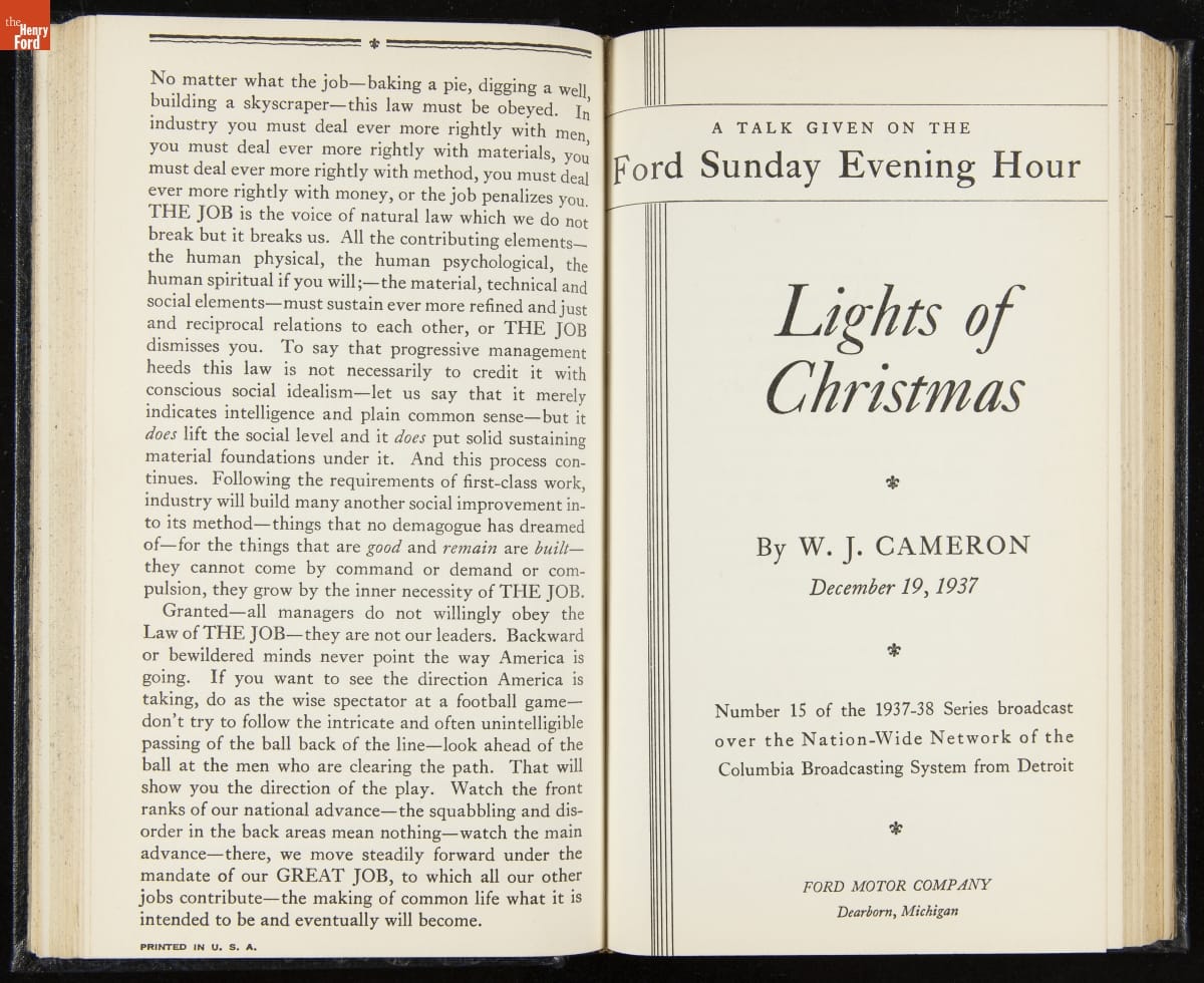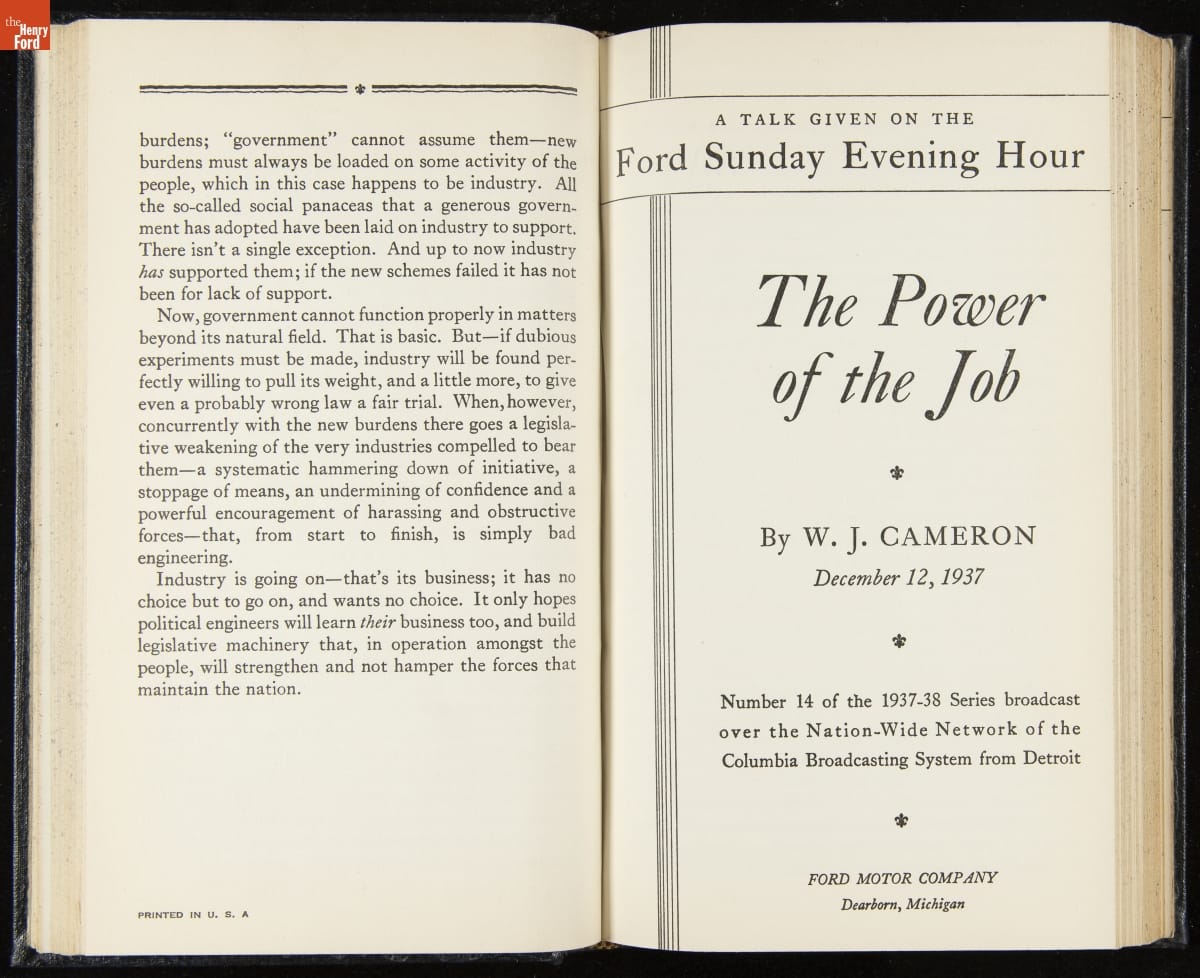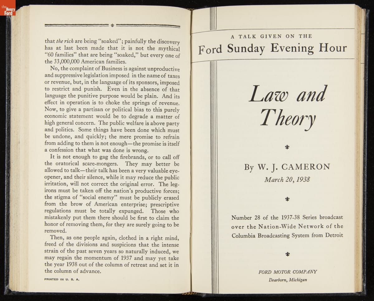 Launched in 1934, the Ford Sunday Evening Hour radio program featured classical music, guest soloists and conductors, and a weekly talk during intermission. Henry Ford asked his friend and advisor William J. Cameron to write and deliver these messages. Cameron, who composed the anti-Semitic articles for The Dearborn Independent, now peddled softer populist views--avoiding extremes and any direct attacks on politicians, ethnic groups, or Wall Street financiers.