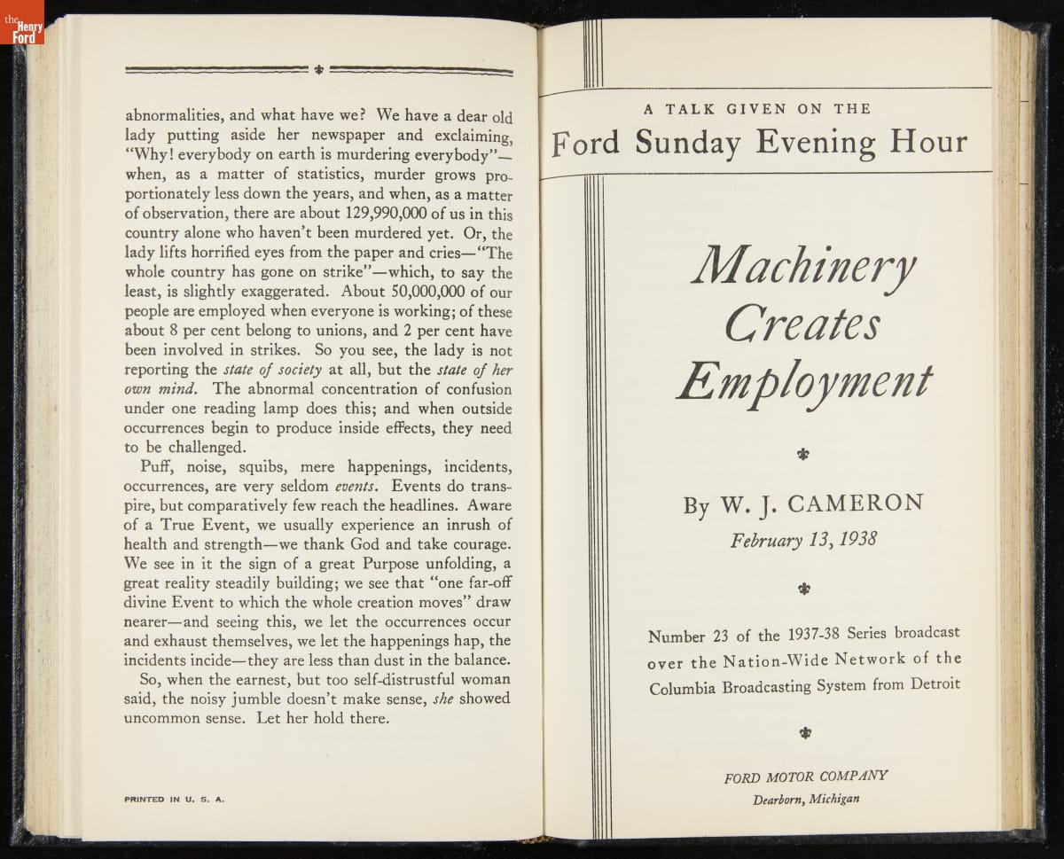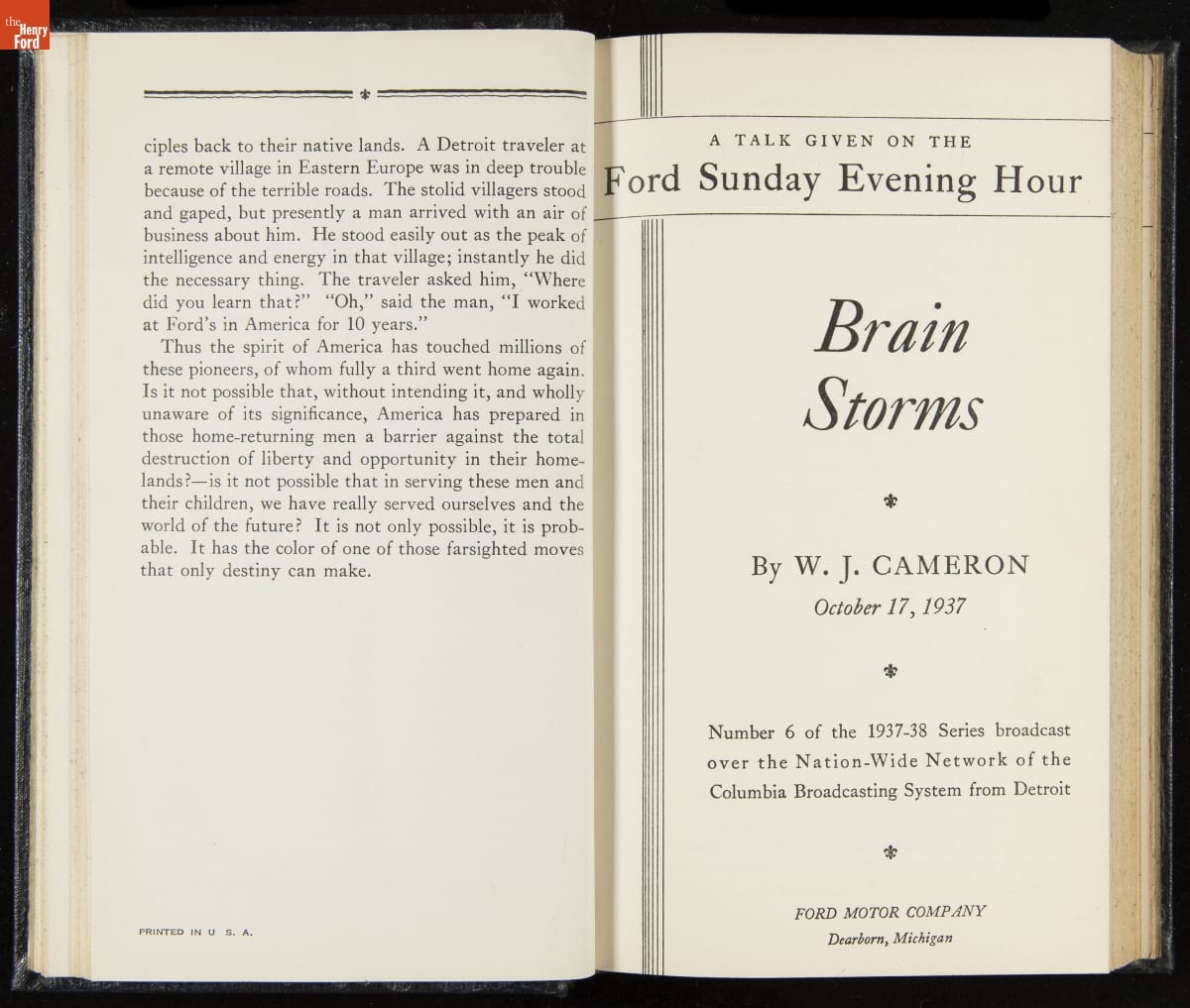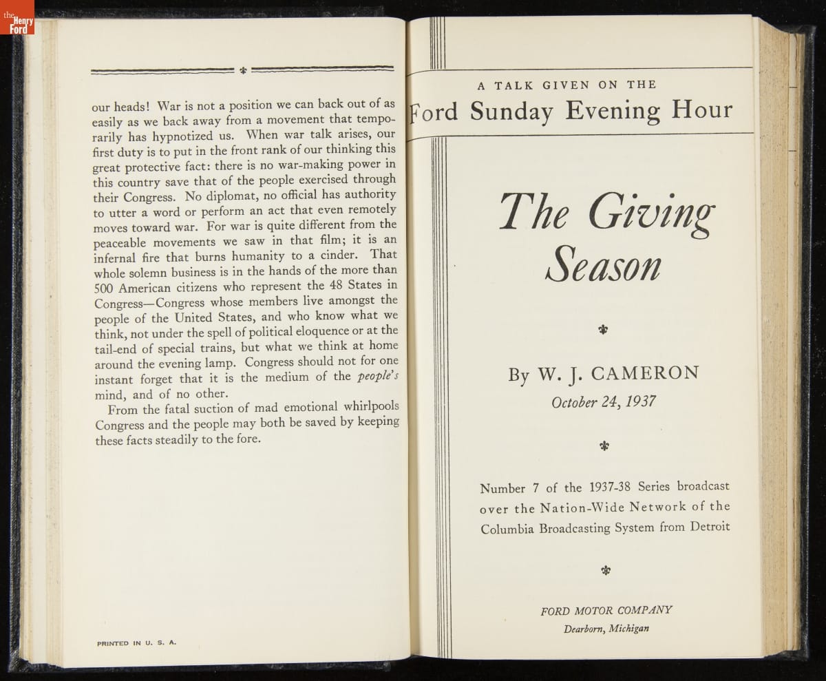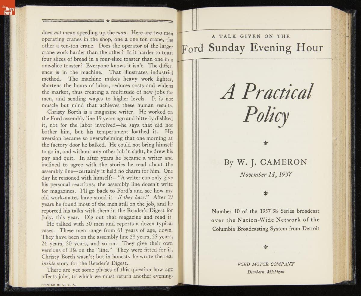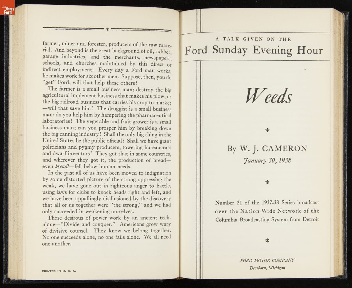 Launched in 1934, the Ford Sunday Evening Hour radio program featured classical music, guest soloists and conductors, and a weekly talk during intermission. Henry Ford asked his friend and advisor William J. Cameron to write and deliver these messages. Cameron, who composed the anti-Semitic articles for The Dearborn Independent, now peddled softer populist views--avoiding extremes and any direct attacks on politicians, ethnic groups, or Wall Street financiers.