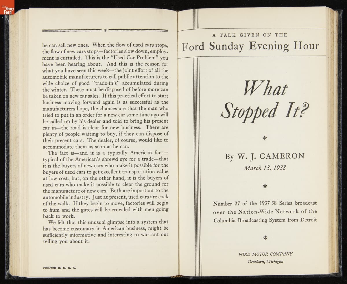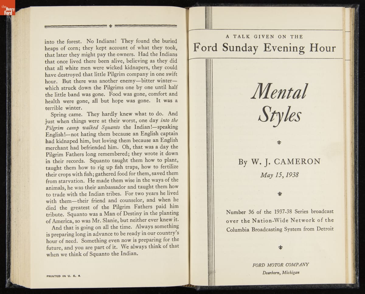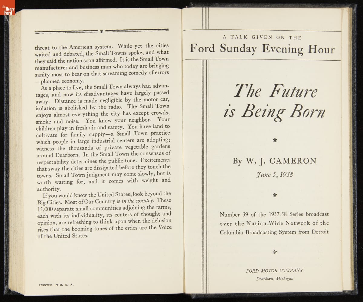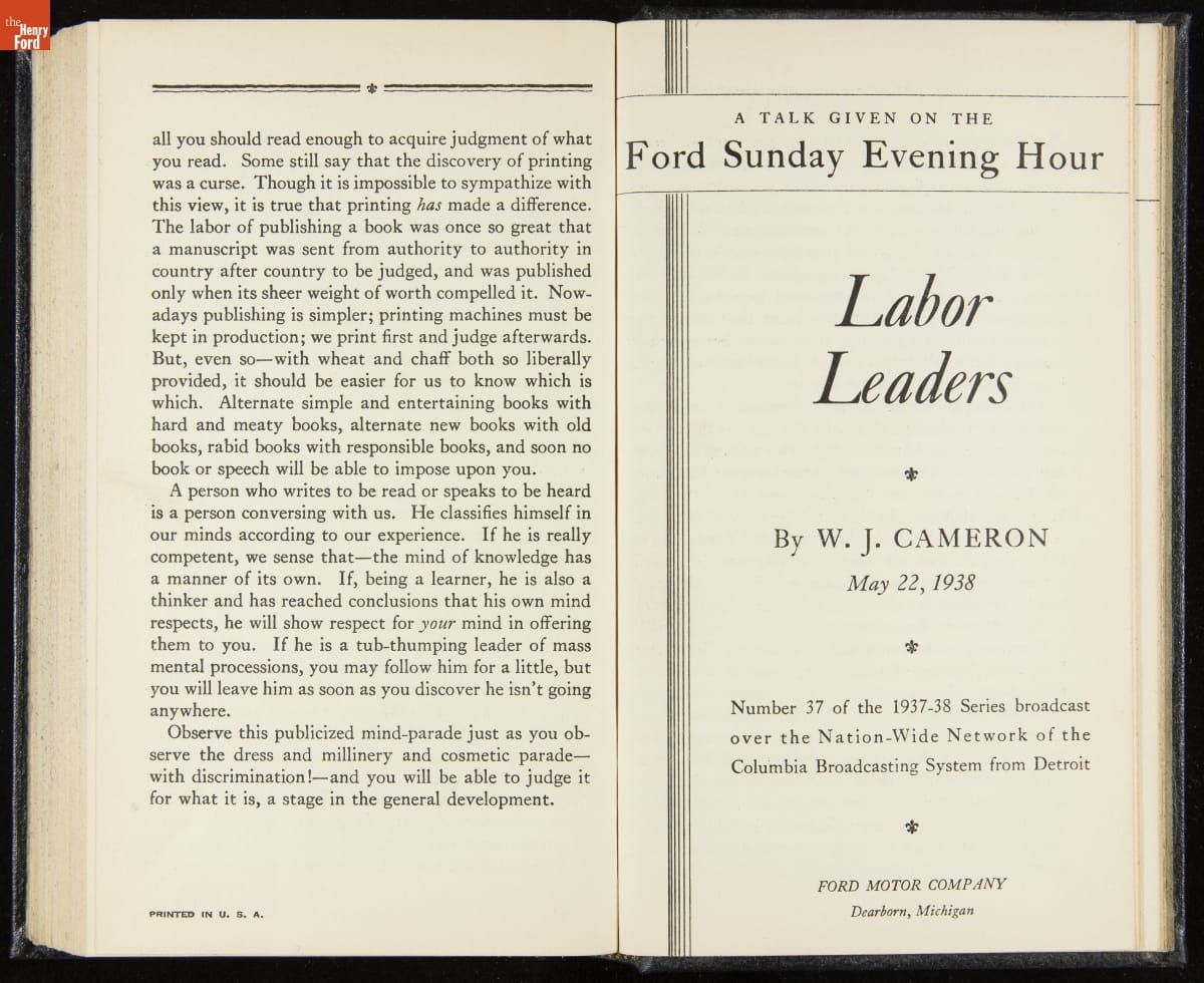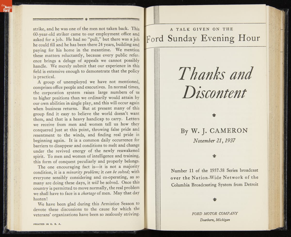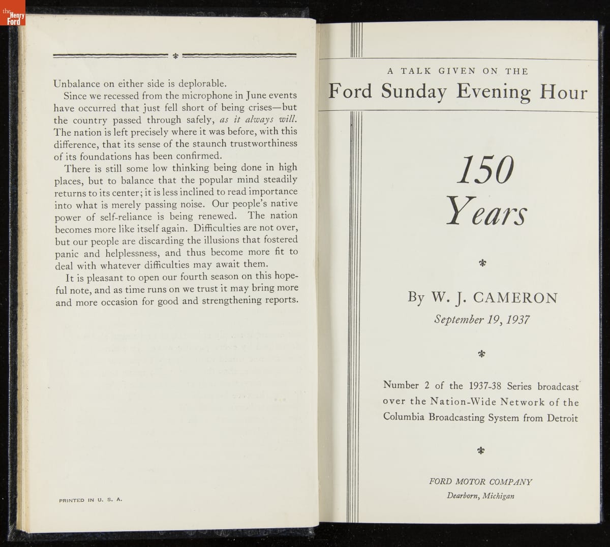 Launched in 1934, the Ford Sunday Evening Hour radio program featured classical music, guest soloists and conductors, and a weekly talk during intermission. Henry Ford asked his friend and advisor William J. Cameron to write and deliver these messages. Cameron, who composed the anti-Semitic articles for The Dearborn Independent, now peddled softer populist views--avoiding extremes and any direct attacks on politicians, ethnic groups, or Wall Street financiers.