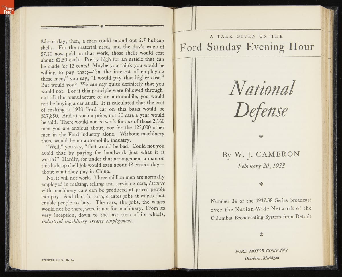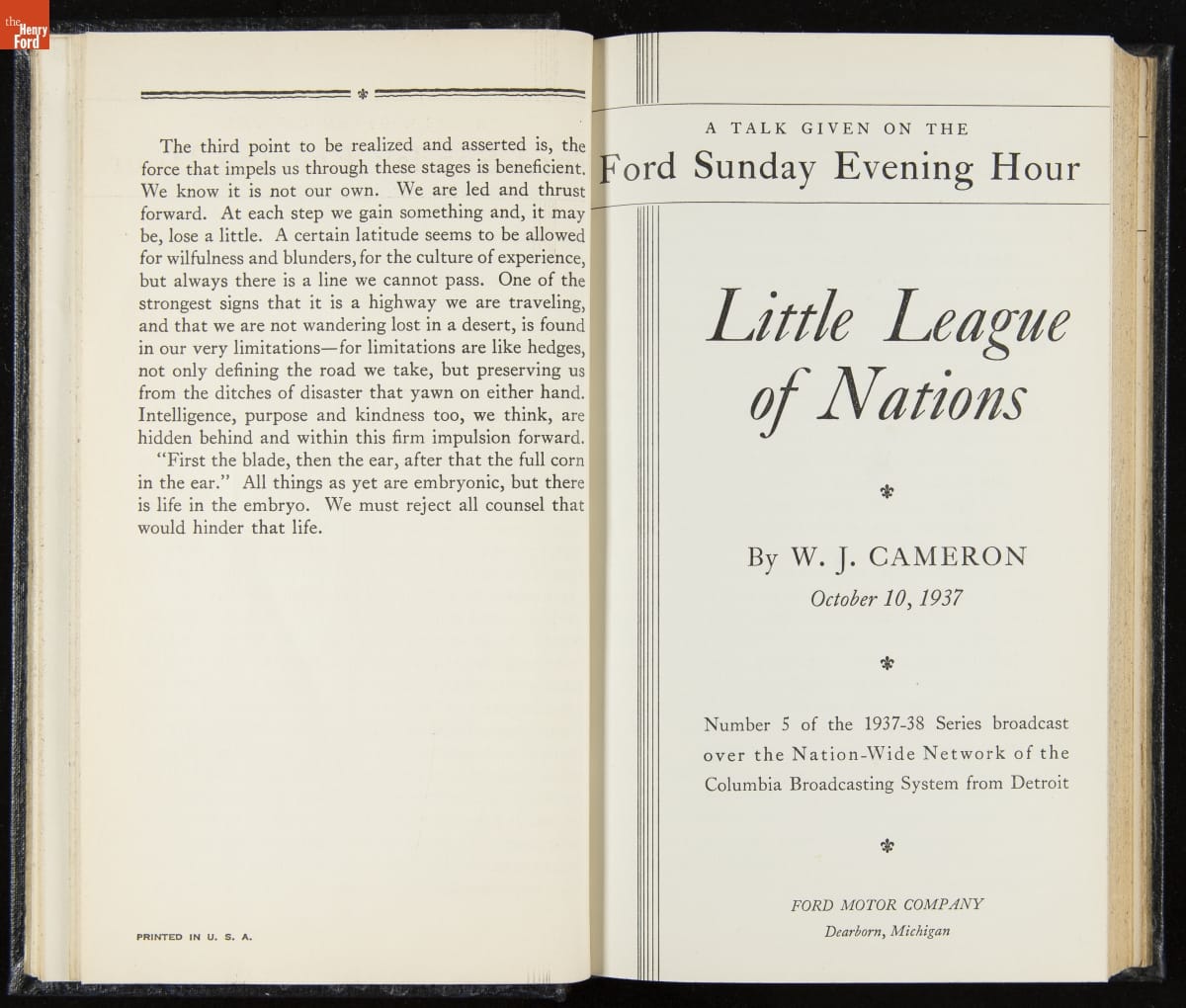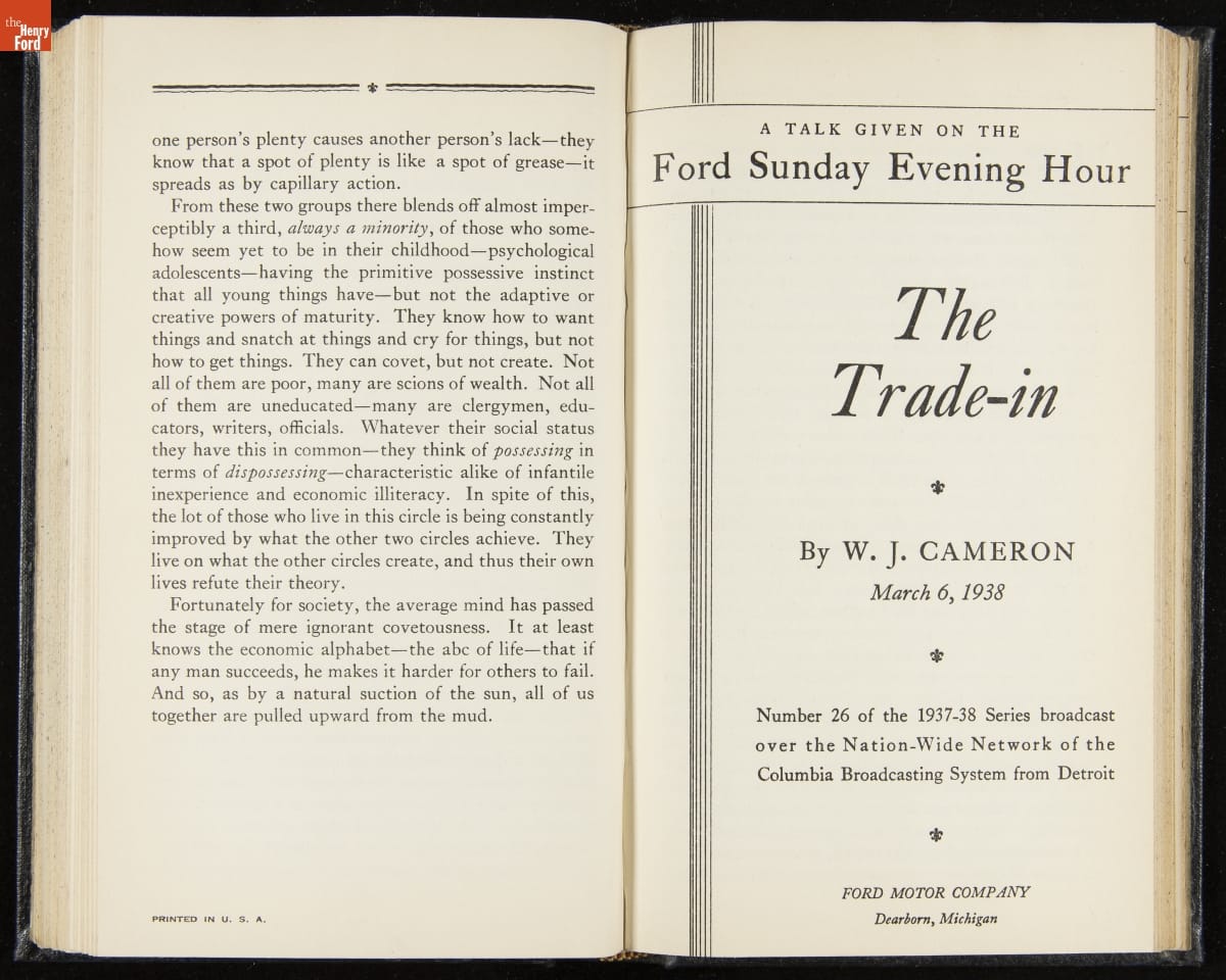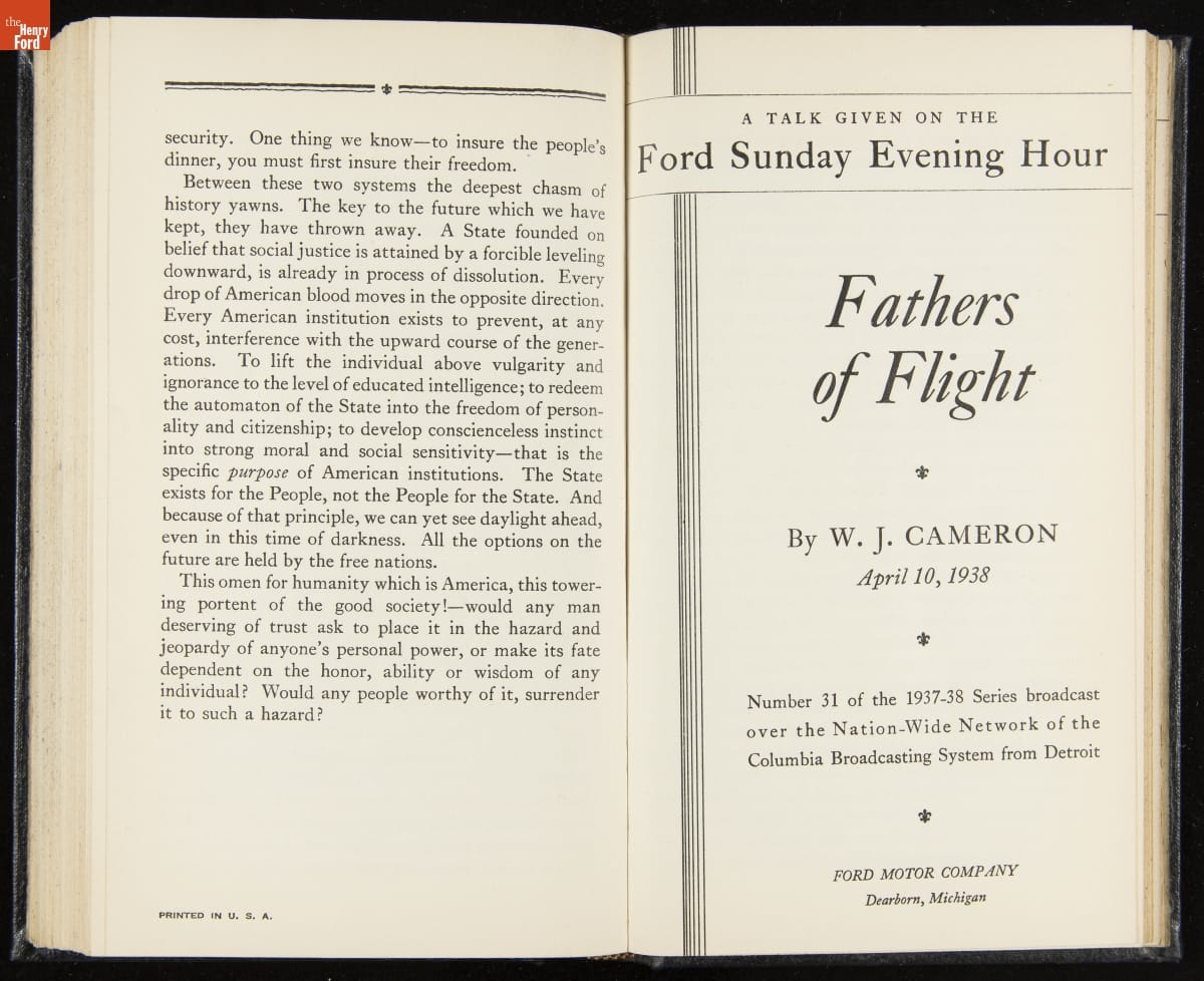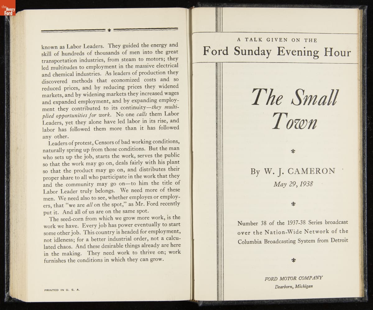 Launched in 1934, the Ford Sunday Evening Hour radio program featured classical music, guest soloists and conductors, and a weekly talk during intermission. Henry Ford asked his friend and advisor William J. Cameron to write and deliver these messages. Cameron, who composed the anti-Semitic articles for The Dearborn Independent, now peddled softer populist views--avoiding extremes and any direct attacks on politicians, ethnic groups, or Wall Street financiers.