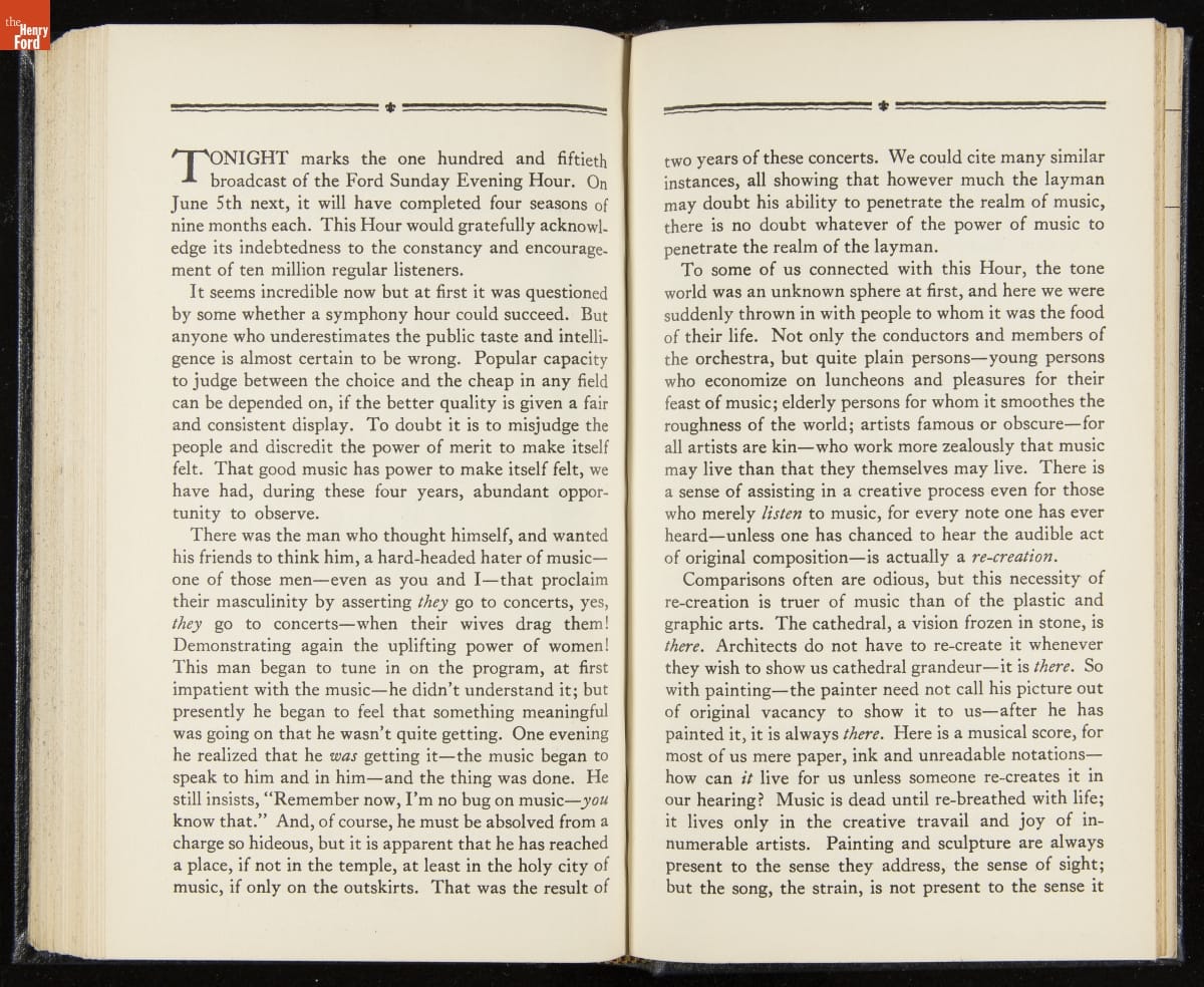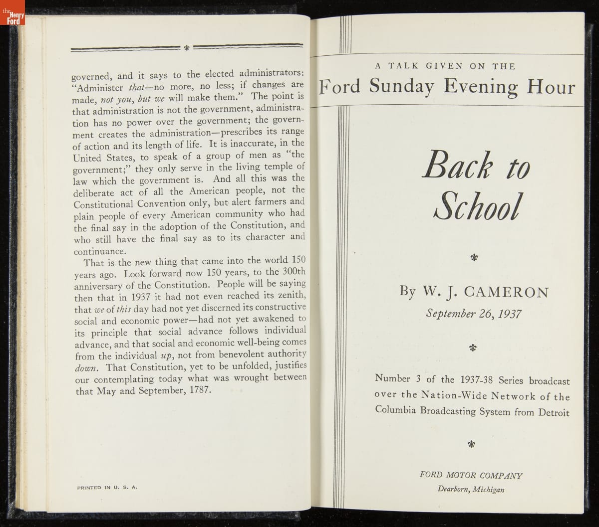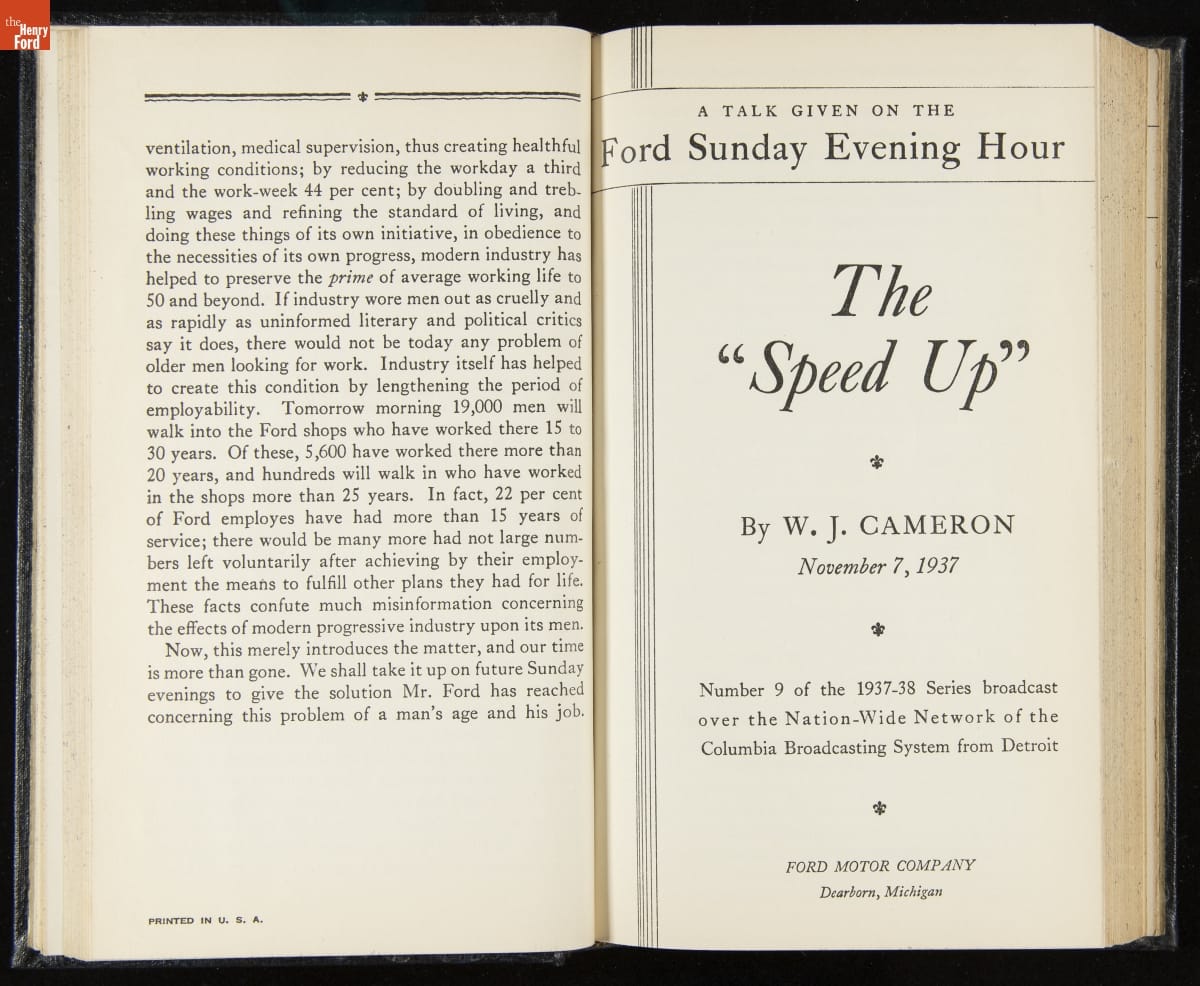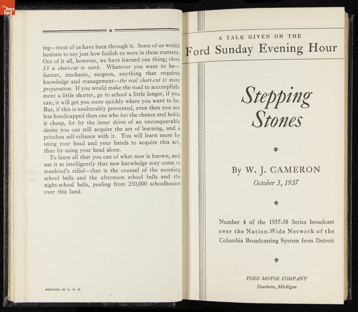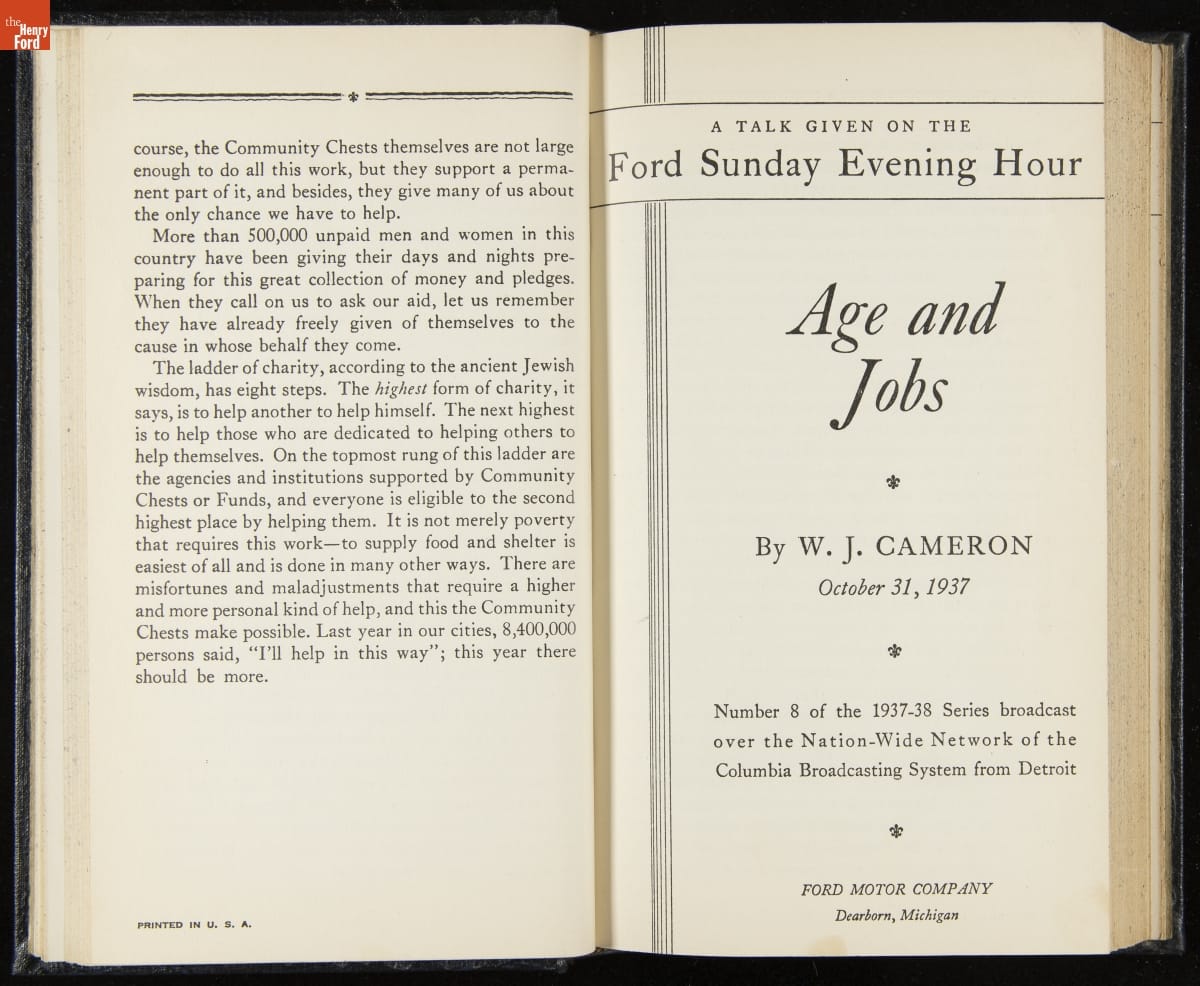 Launched in 1934, the Ford Sunday Evening Hour radio program featured classical music, guest soloists and conductors, and a weekly talk during intermission. Henry Ford asked his friend and advisor William J. Cameron to write and deliver these messages. Cameron, who composed the anti-Semitic articles for The Dearborn Independent, now peddled softer populist views--avoiding extremes and any direct attacks on politicians, ethnic groups, or Wall Street financiers.