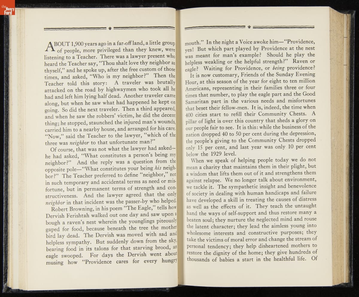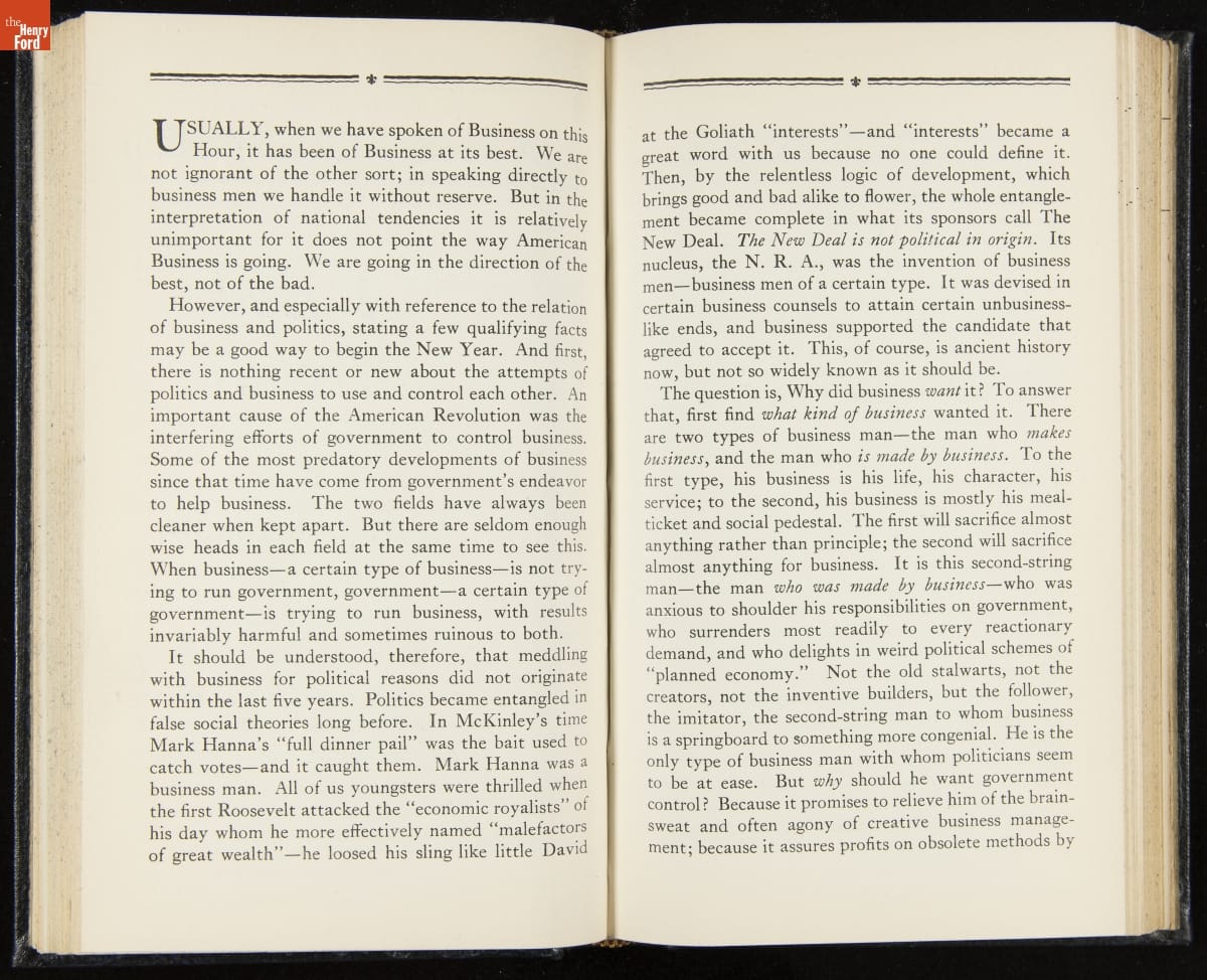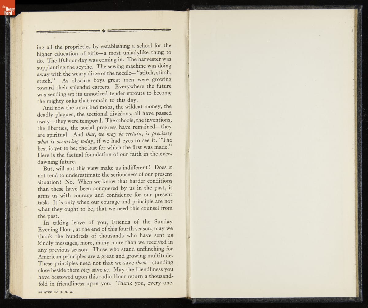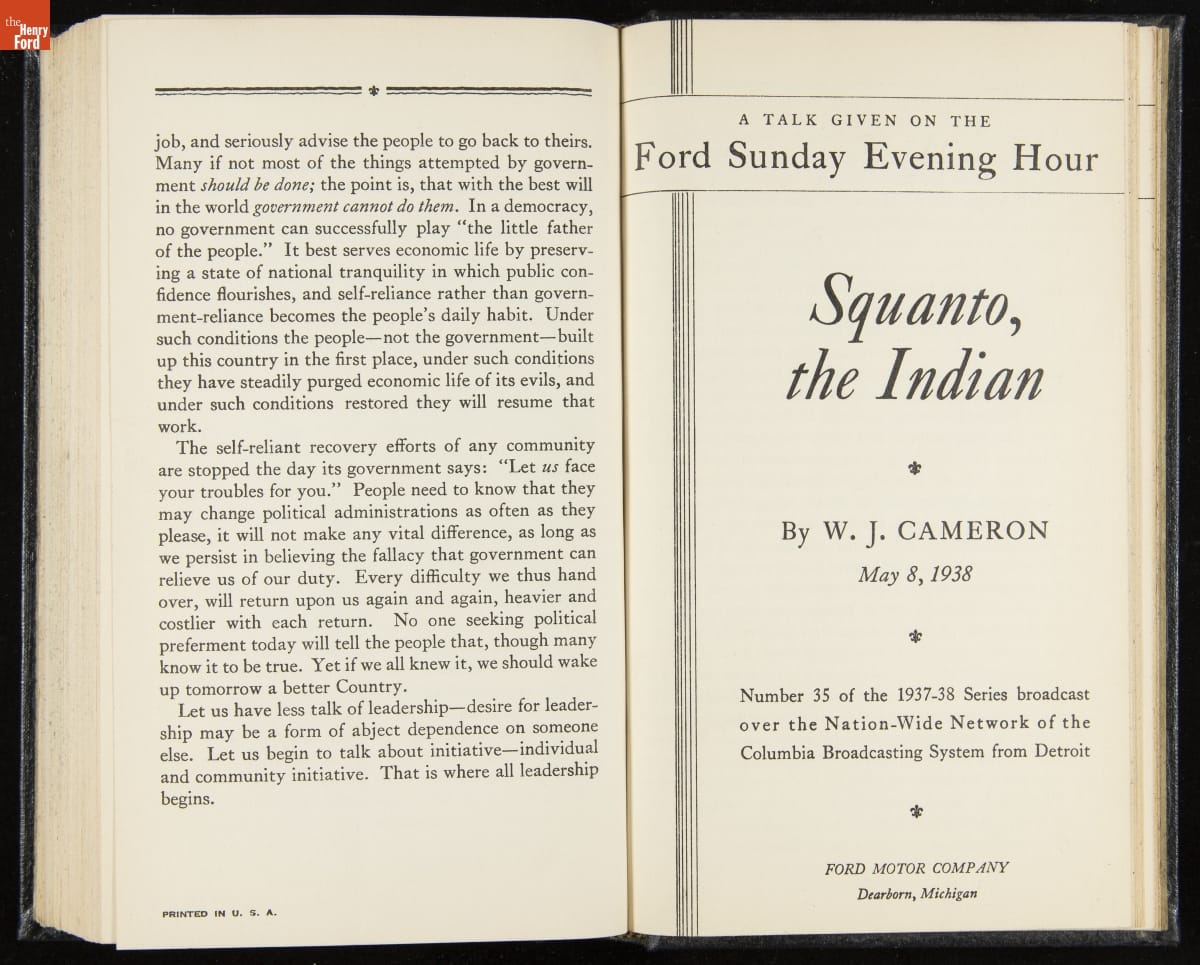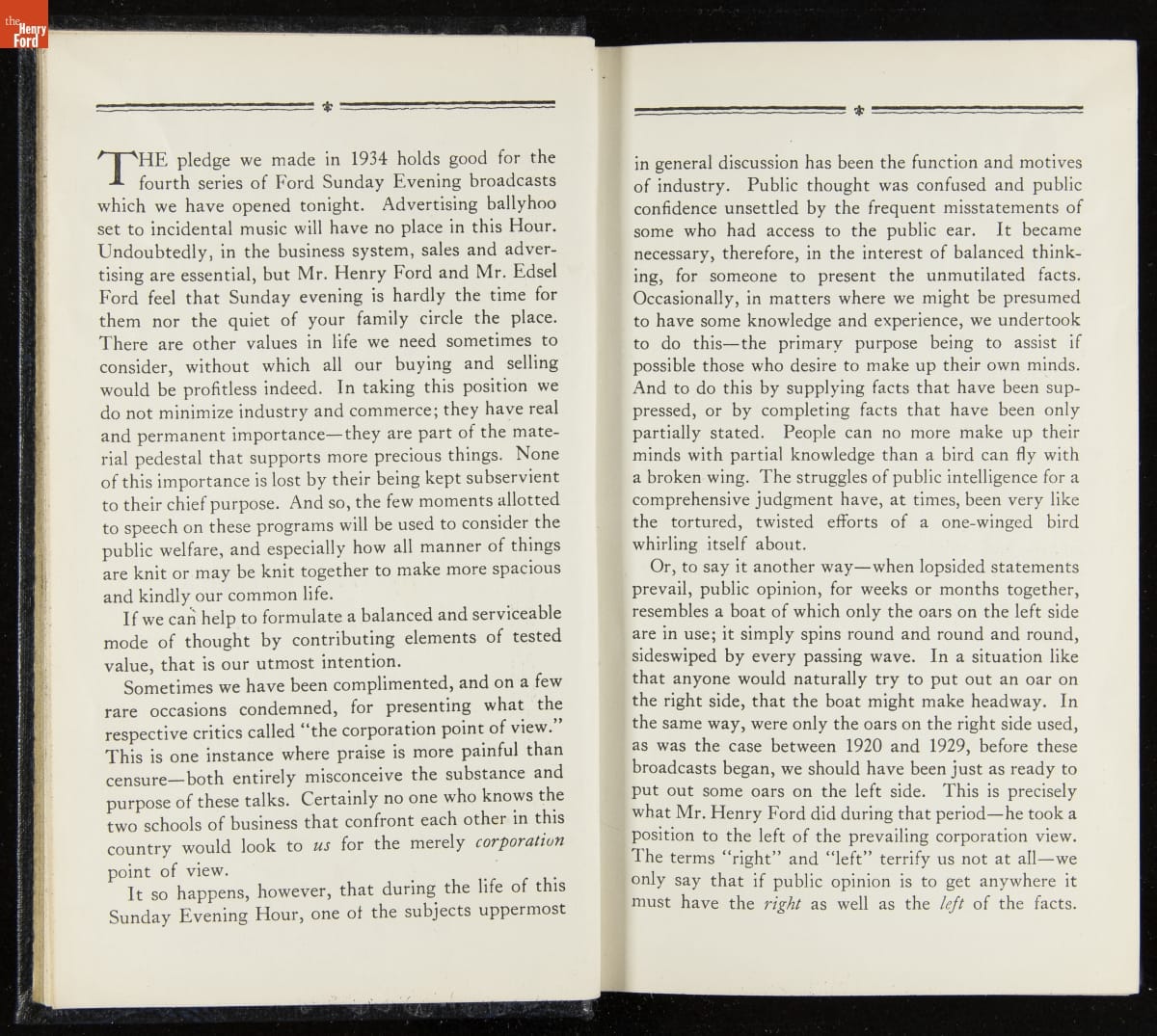 Launched in 1934, the Ford Sunday Evening Hour radio program featured classical music, guest soloists and conductors, and a weekly talk during intermission. Henry Ford asked his friend and advisor William J. Cameron to write and deliver these messages. Cameron, who composed the anti-Semitic articles for The Dearborn Independent, now peddled softer populist views--avoiding extremes and any direct attacks on politicians, ethnic groups, or Wall Street financiers.