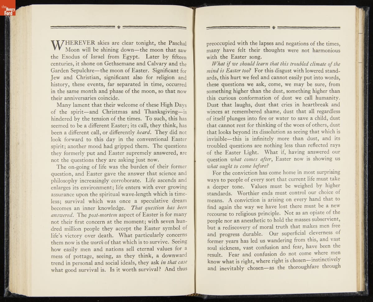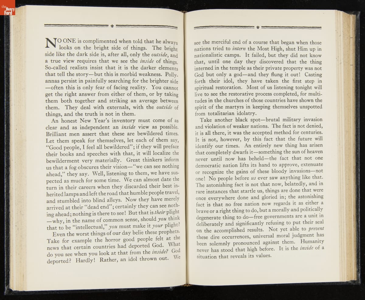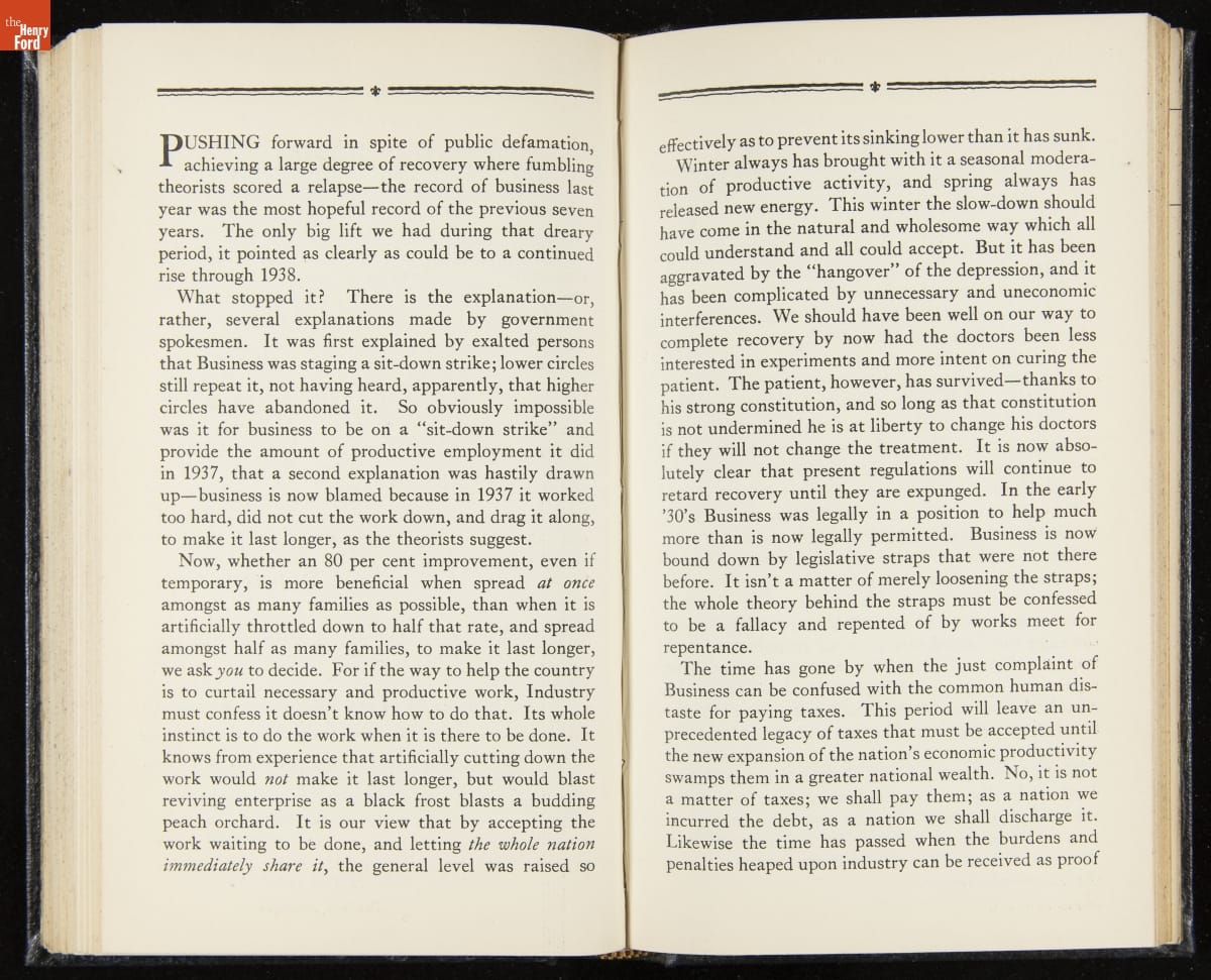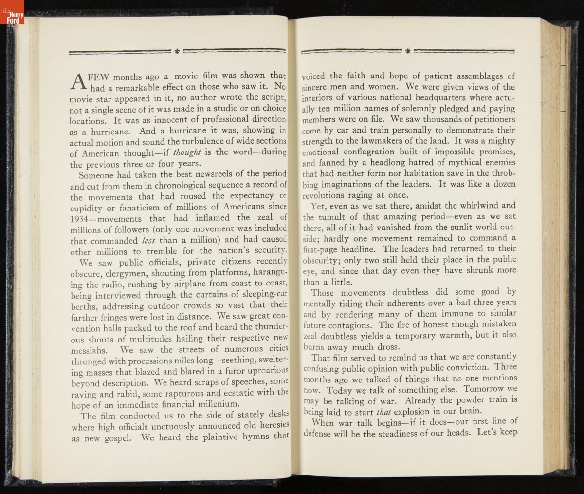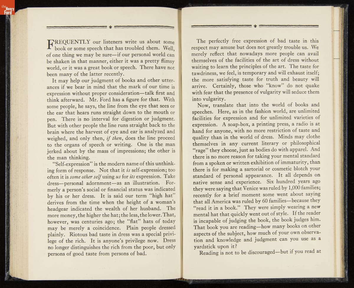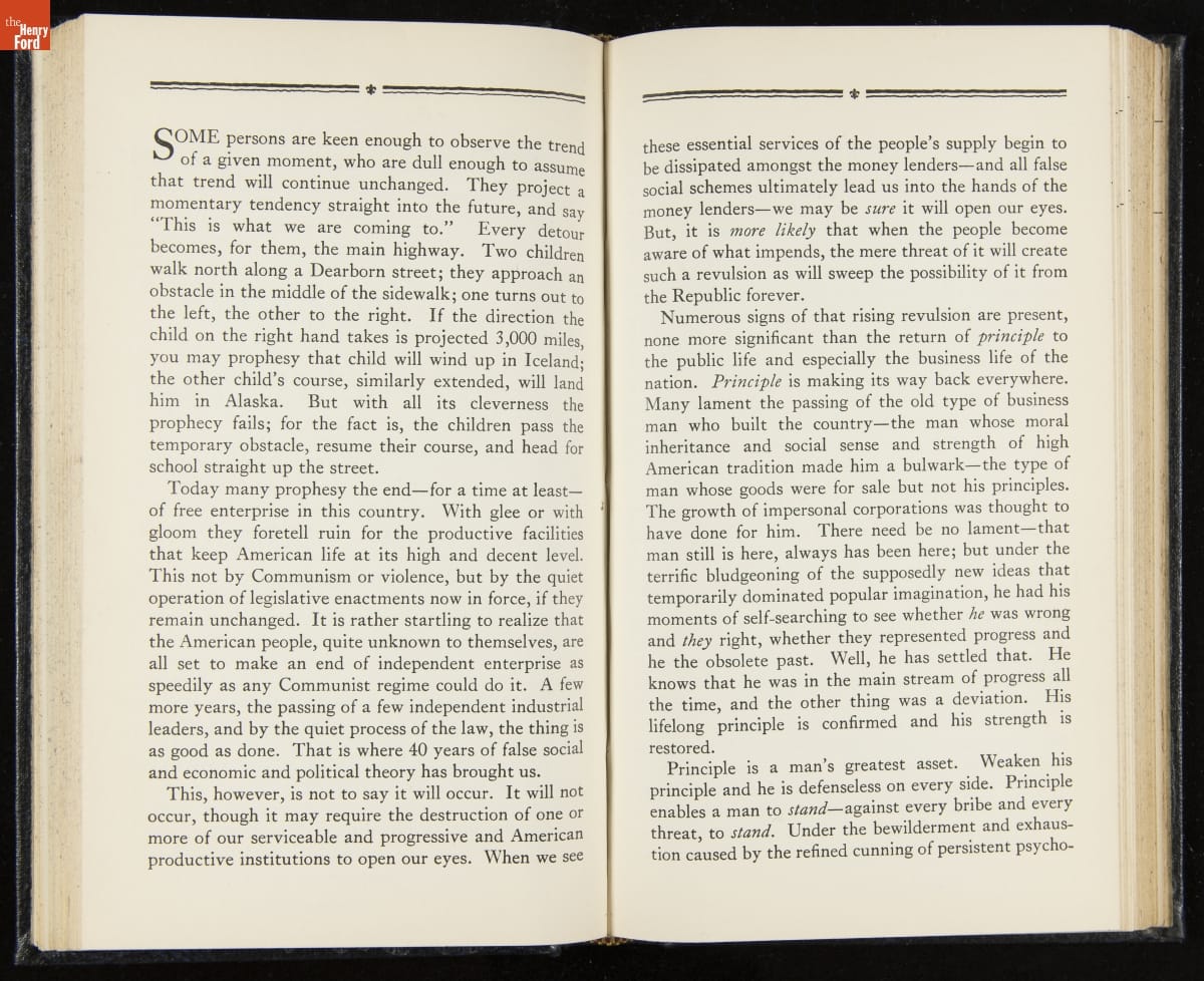 Launched in 1934, the Ford Sunday Evening Hour radio program featured classical music, guest soloists and conductors, and a weekly talk during intermission. Henry Ford asked his friend and advisor William J. Cameron to write and deliver these messages. Cameron, who composed the anti-Semitic articles for The Dearborn Independent, now peddled softer populist views--avoiding extremes and any direct attacks on politicians, ethnic groups, or Wall Street financiers.
