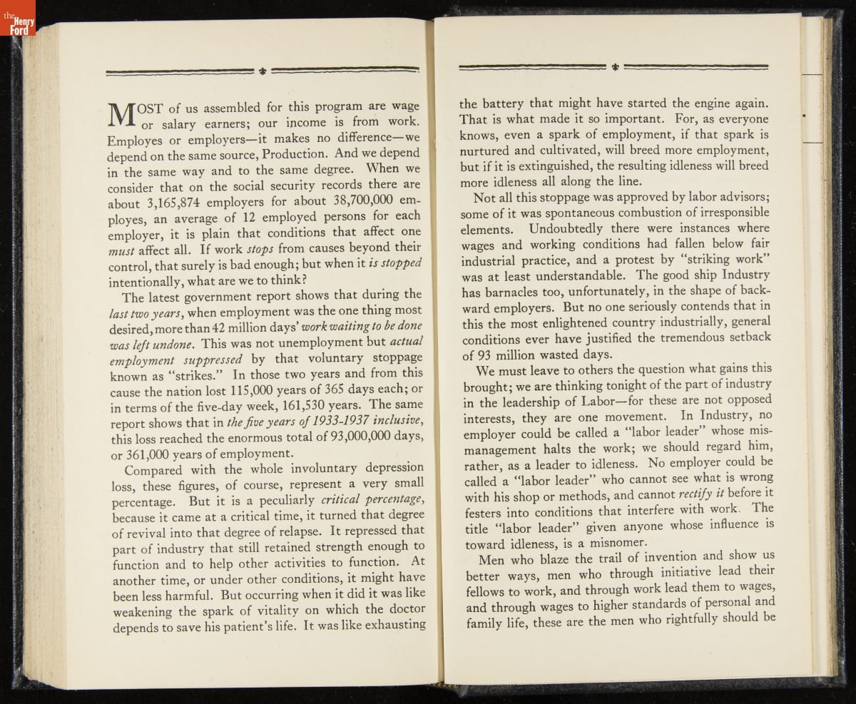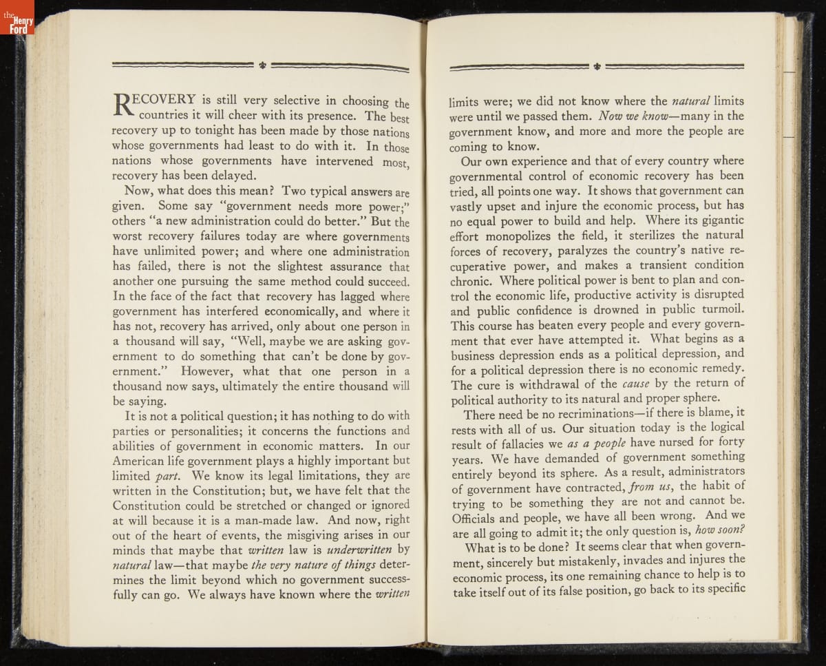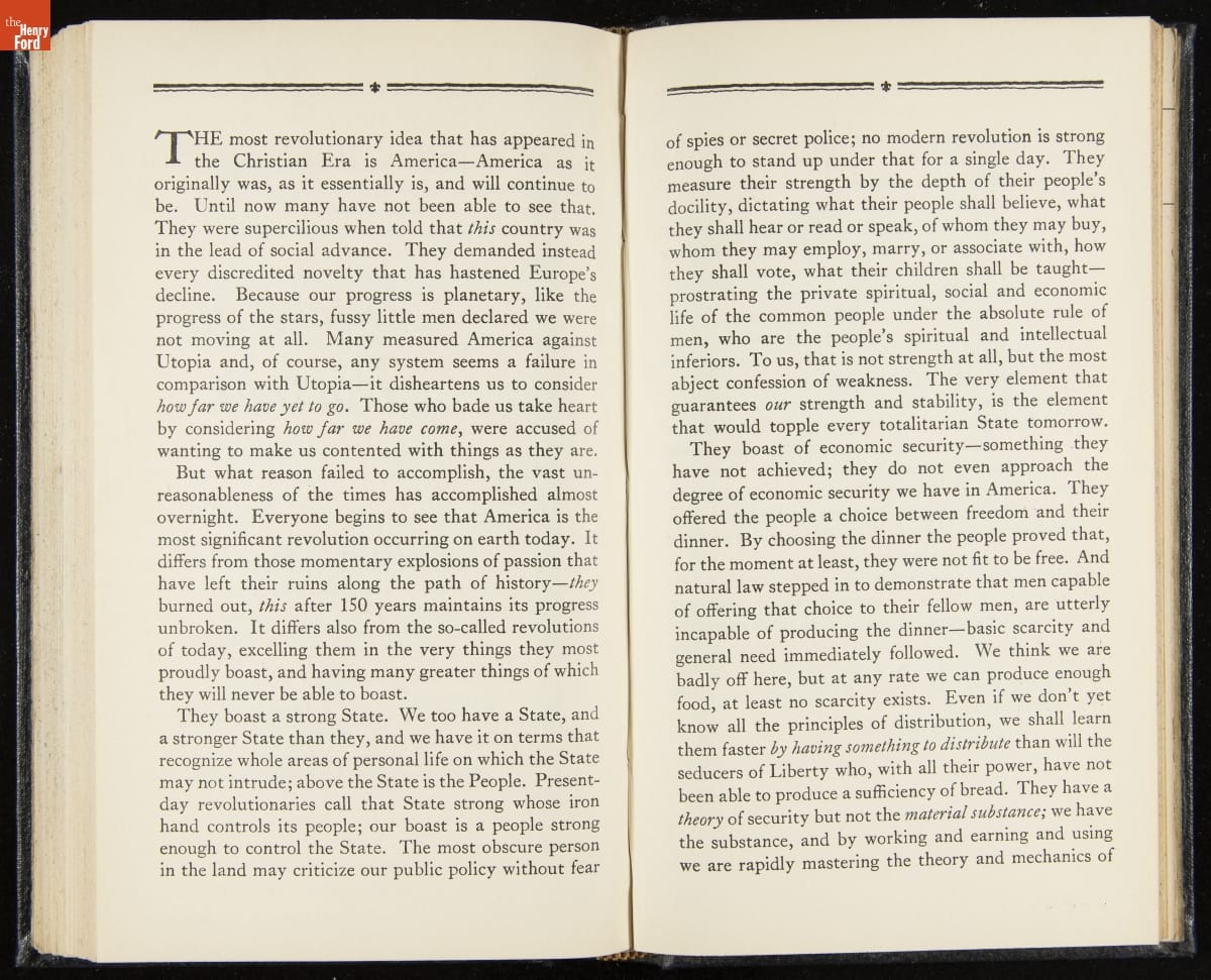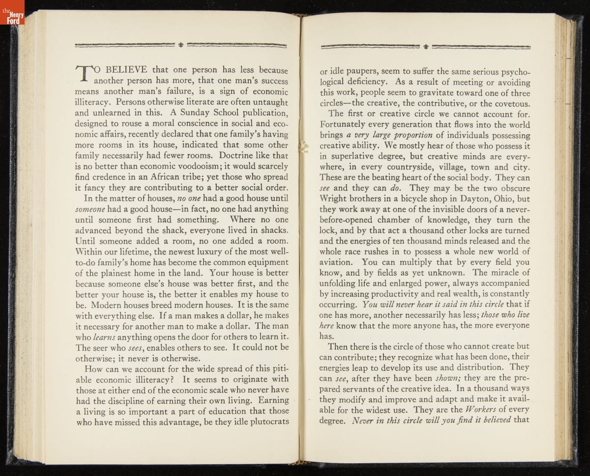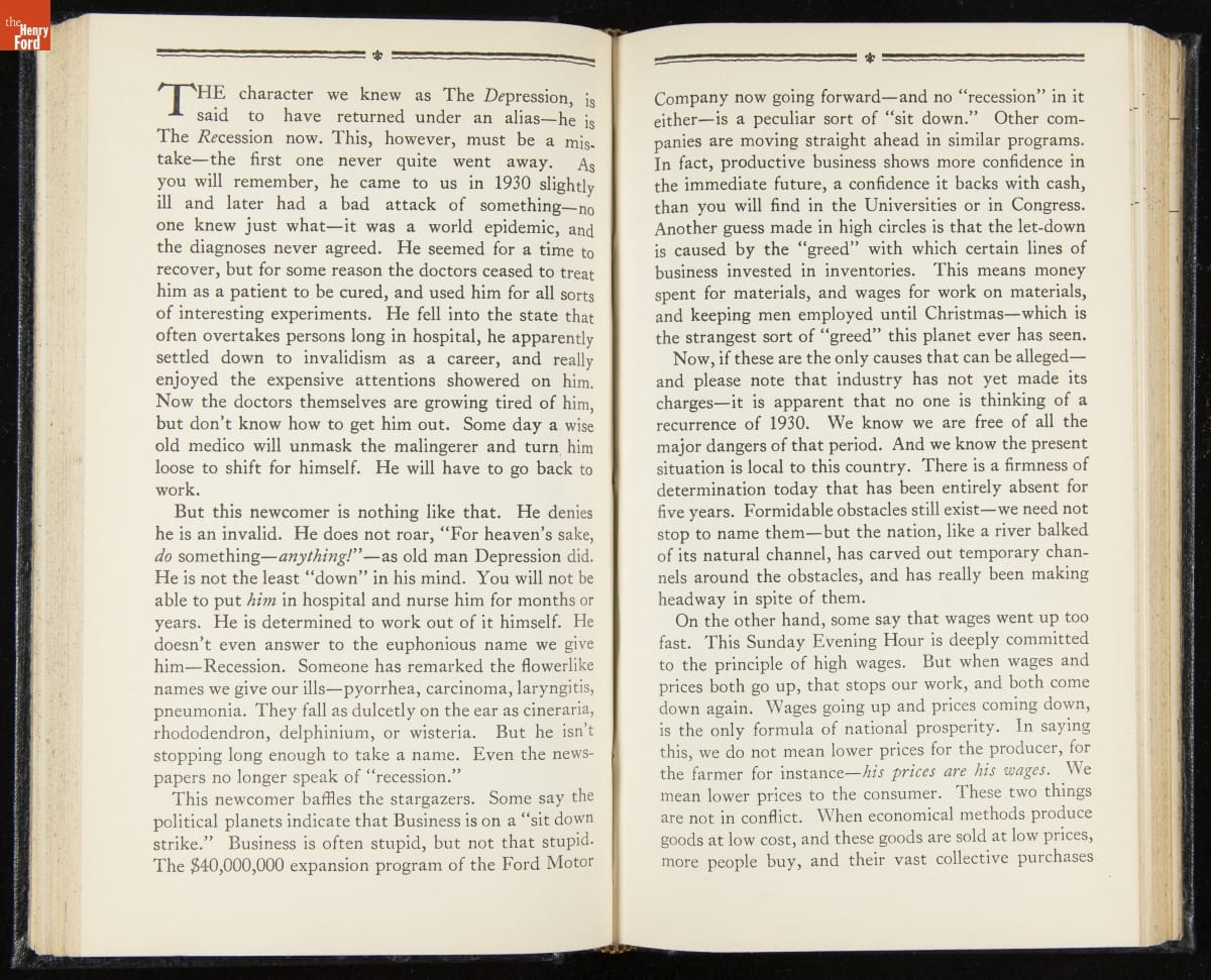 Launched in 1934, the Ford Sunday Evening Hour radio program featured classical music, guest soloists and conductors, and a weekly talk during intermission. Henry Ford asked his friend and advisor William J. Cameron to write and deliver these messages. Cameron, who composed the anti-Semitic articles for The Dearborn Independent, now peddled softer populist views--avoiding extremes and any direct attacks on politicians, ethnic groups, or Wall Street financiers.
