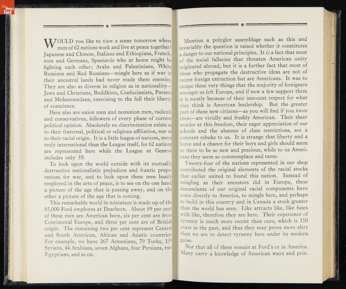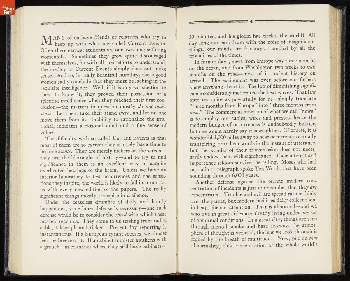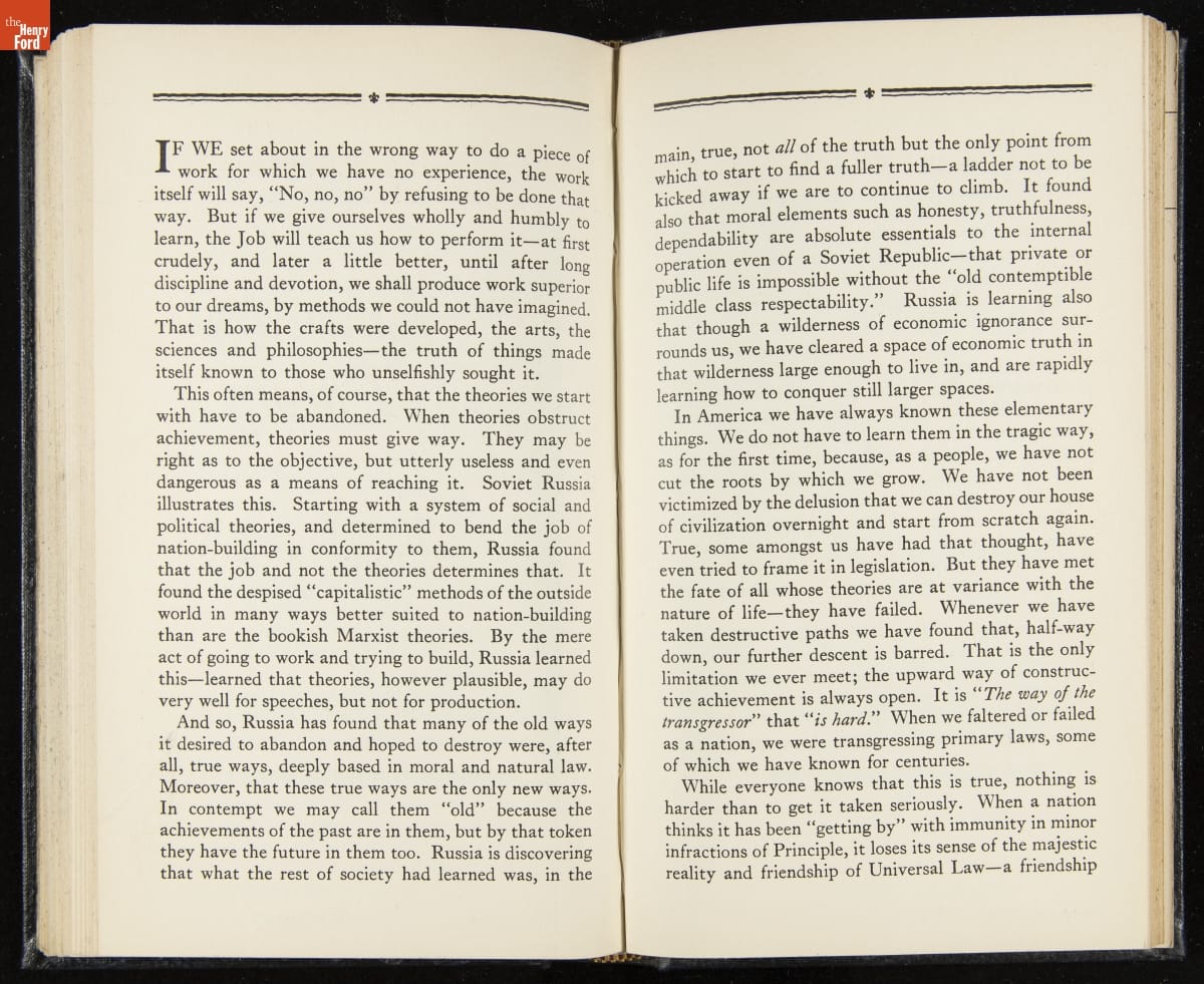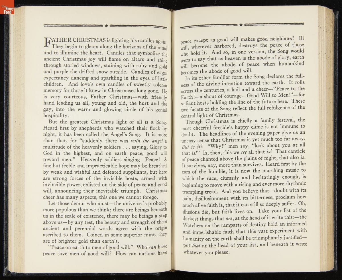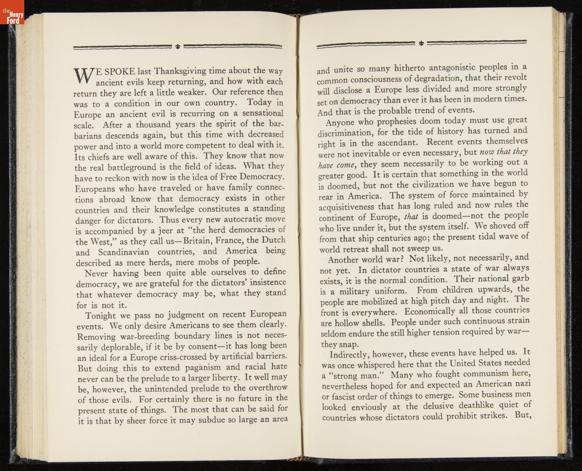 Launched in 1934, the Ford Sunday Evening Hour radio program featured classical music, guest soloists and conductors, and a weekly talk during intermission. Henry Ford asked his friend and advisor William J. Cameron to write and deliver these messages. Cameron, who composed the anti-Semitic articles for The Dearborn Independent, now peddled softer populist views--avoiding extremes and any direct attacks on politicians, ethnic groups, or Wall Street financiers.