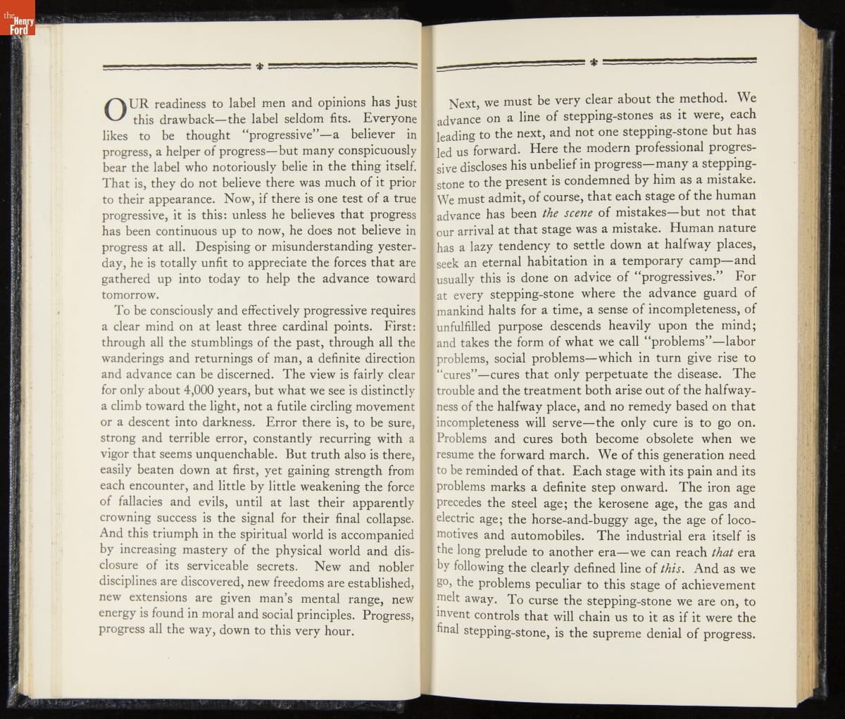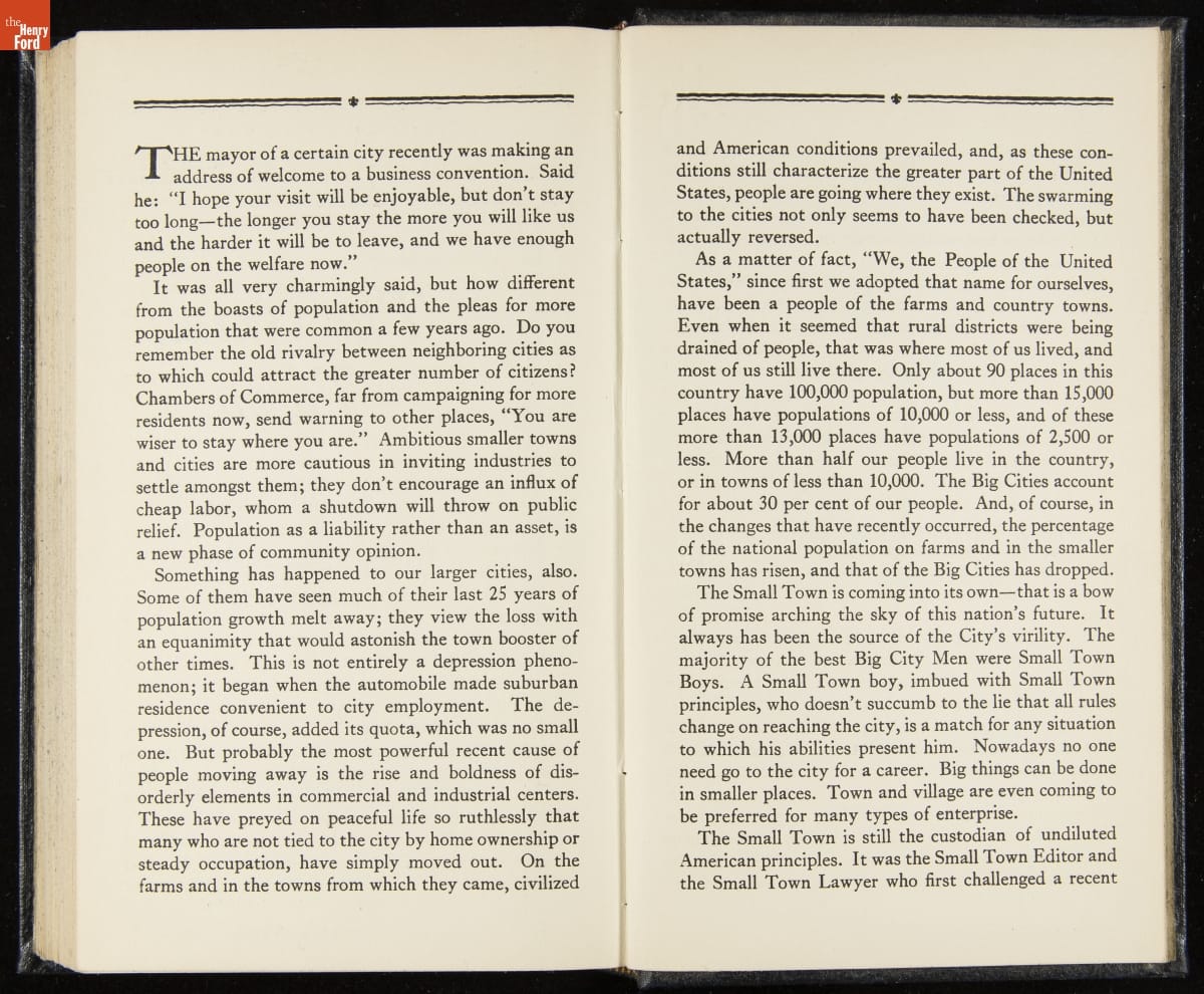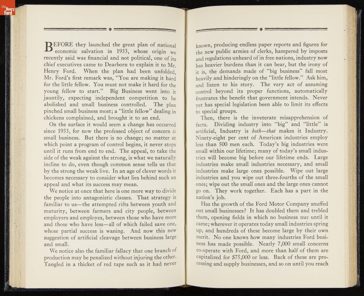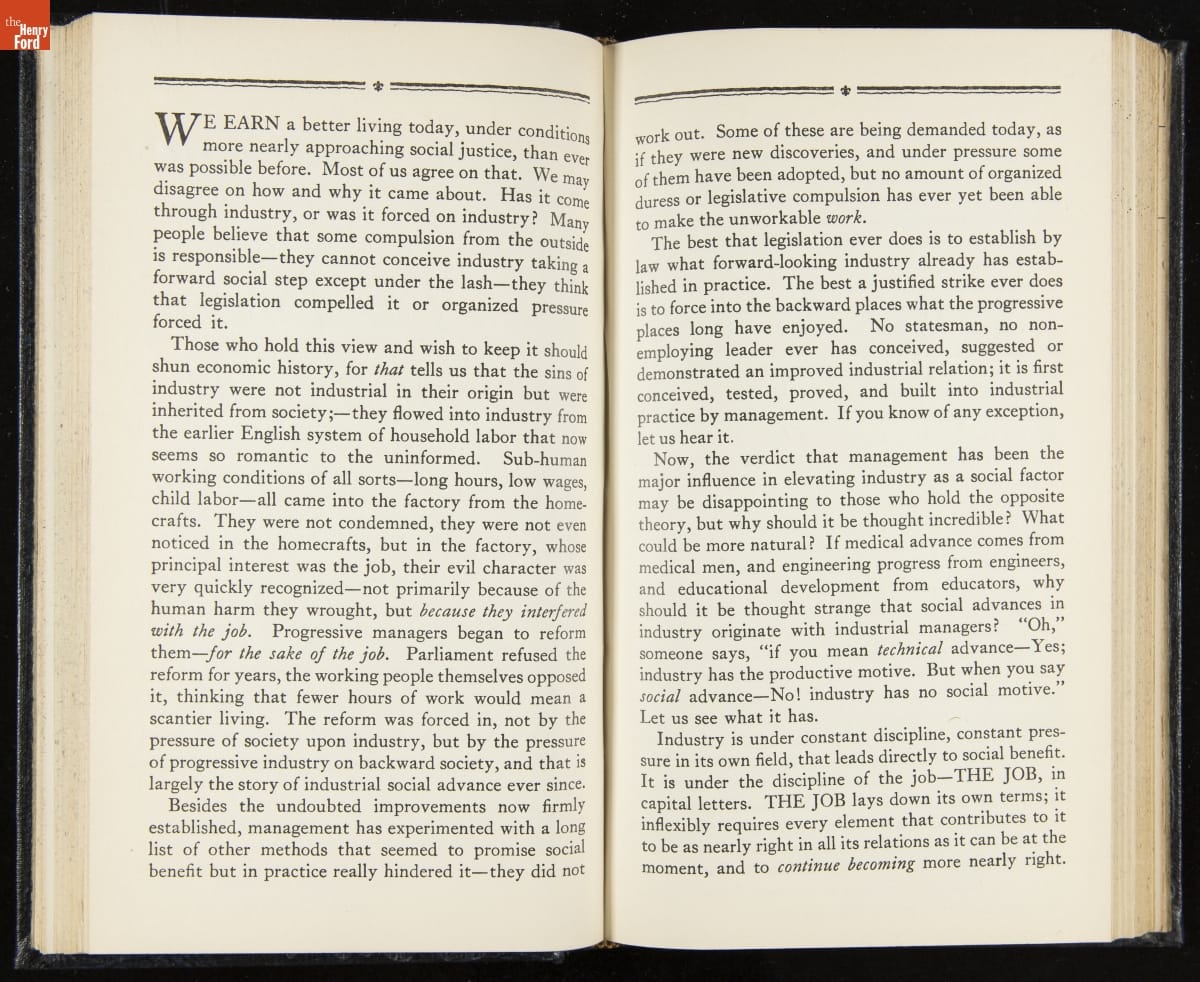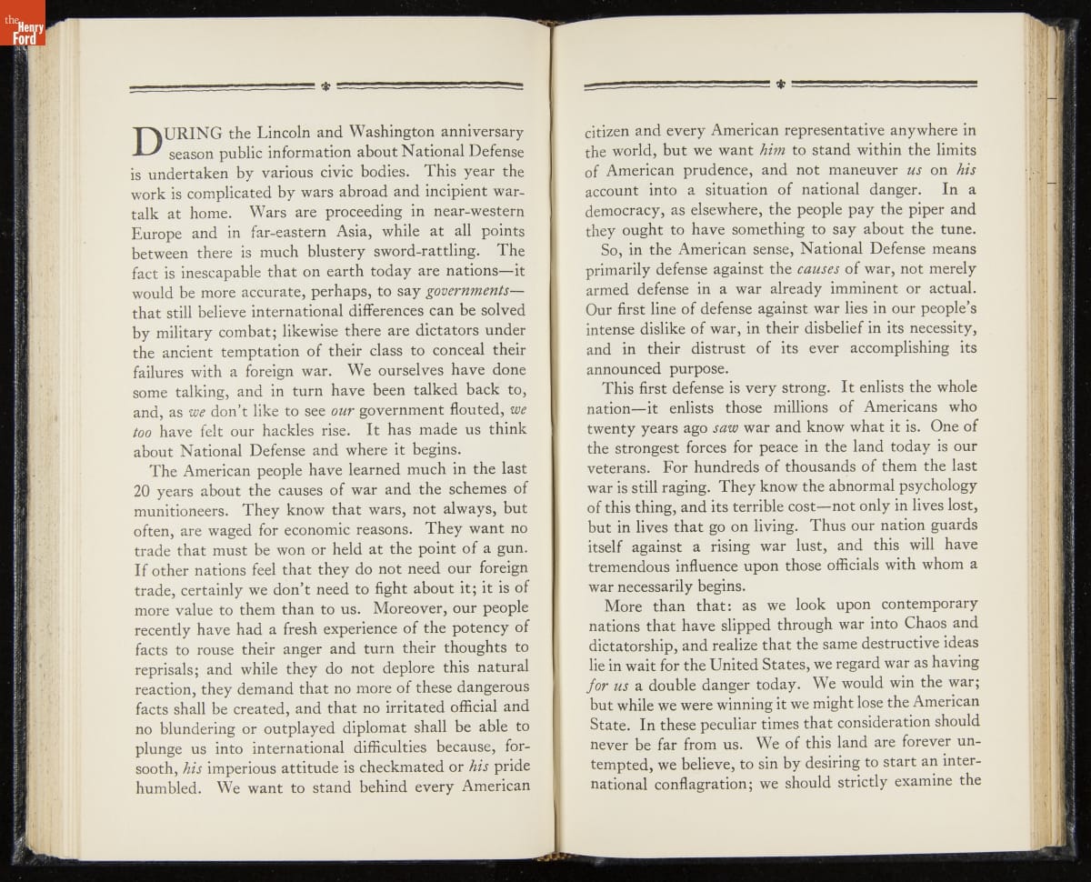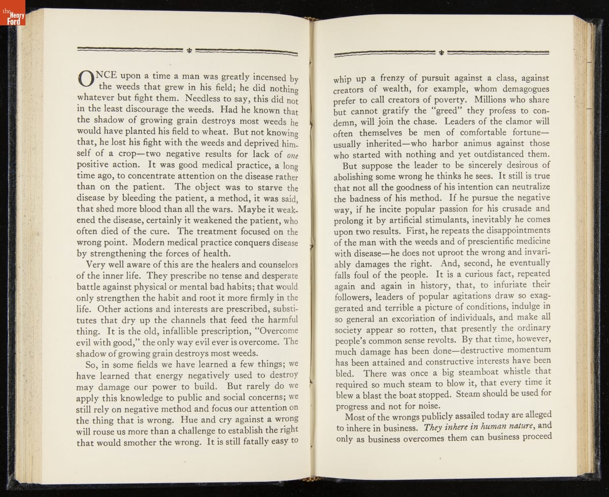 Launched in 1934, the Ford Sunday Evening Hour radio program featured classical music, guest soloists and conductors, and a weekly talk during intermission. Henry Ford asked his friend and advisor William J. Cameron to write and deliver these messages. Cameron, who composed the anti-Semitic articles for The Dearborn Independent, now peddled softer populist views--avoiding extremes and any direct attacks on politicians, ethnic groups, or Wall Street financiers.