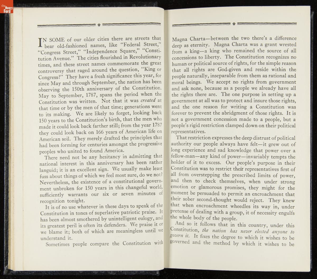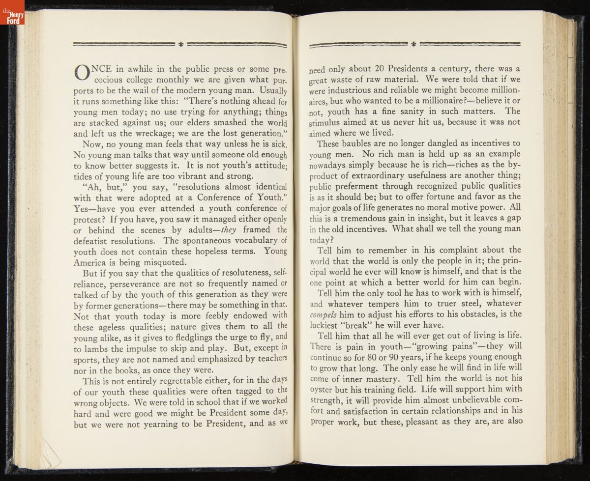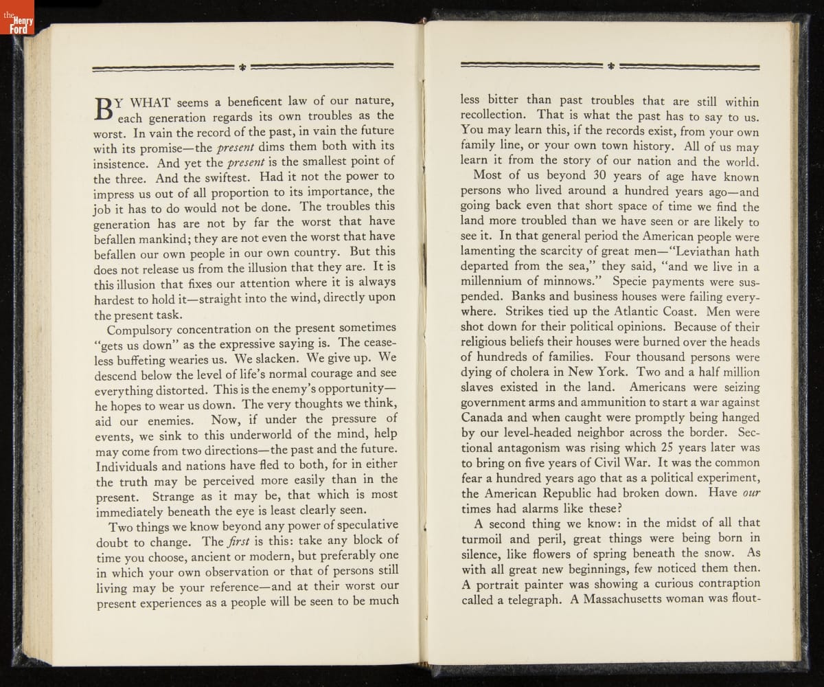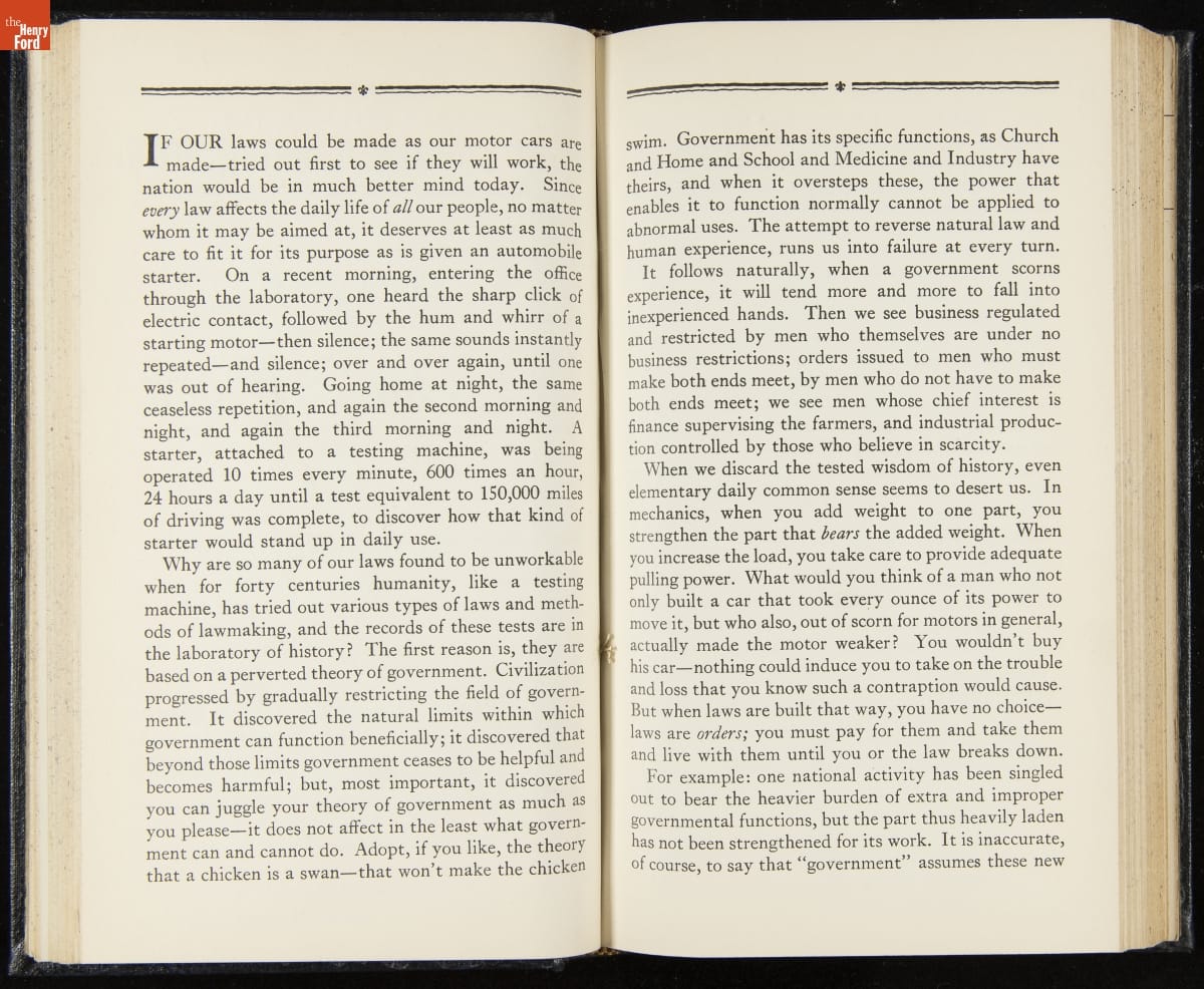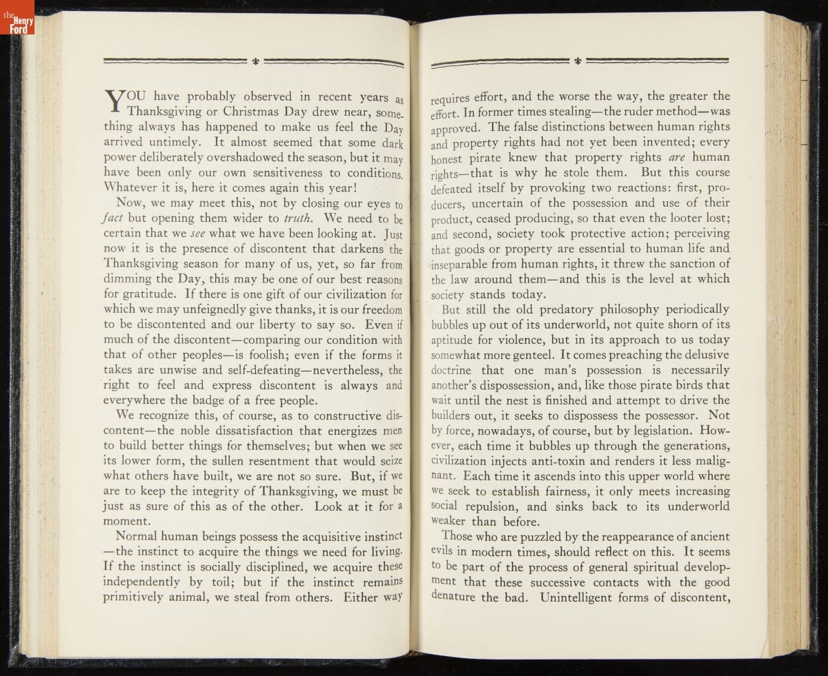 Launched in 1934, the Ford Sunday Evening Hour radio program featured classical music, guest soloists and conductors, and a weekly talk during intermission. Henry Ford asked his friend and advisor William J. Cameron to write and deliver these messages. Cameron, who composed the anti-Semitic articles for The Dearborn Independent, now peddled softer populist views--avoiding extremes and any direct attacks on politicians, ethnic groups, or Wall Street financiers.