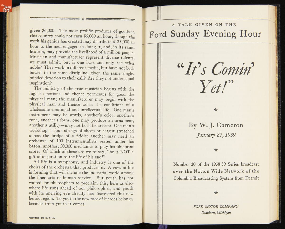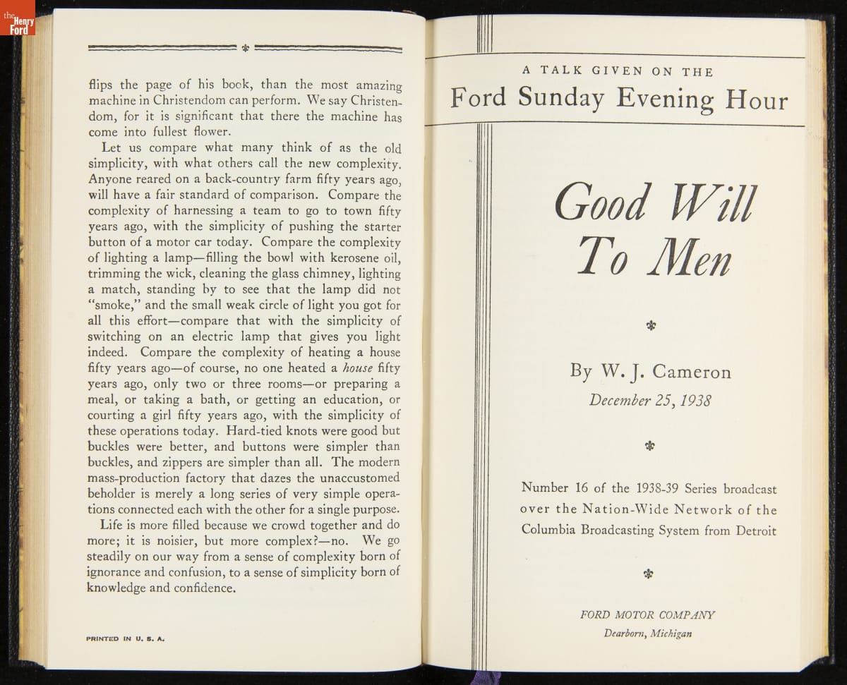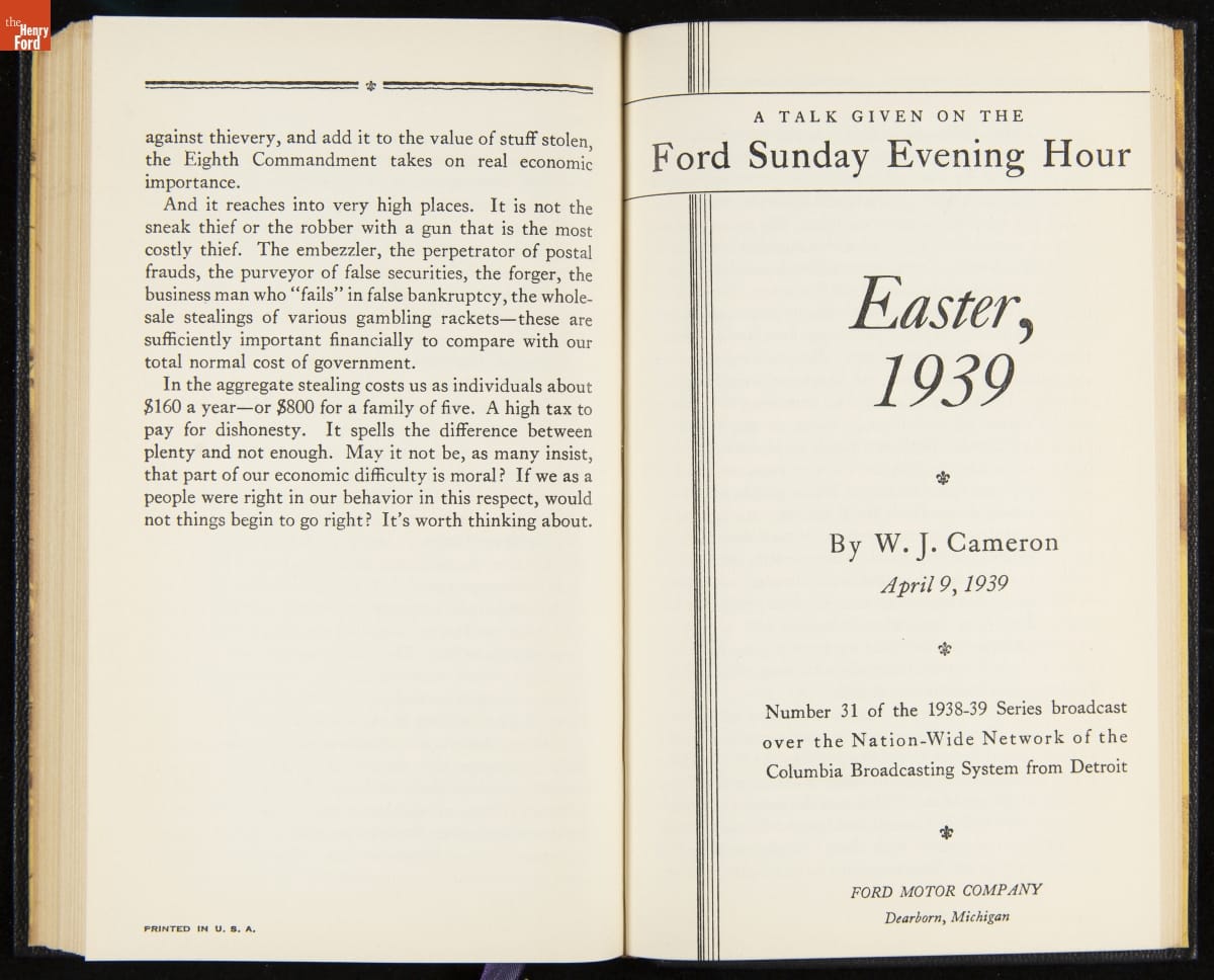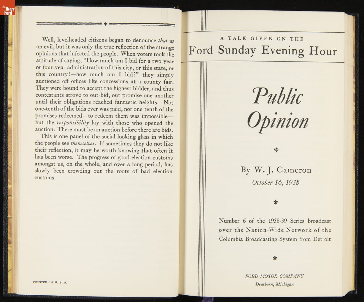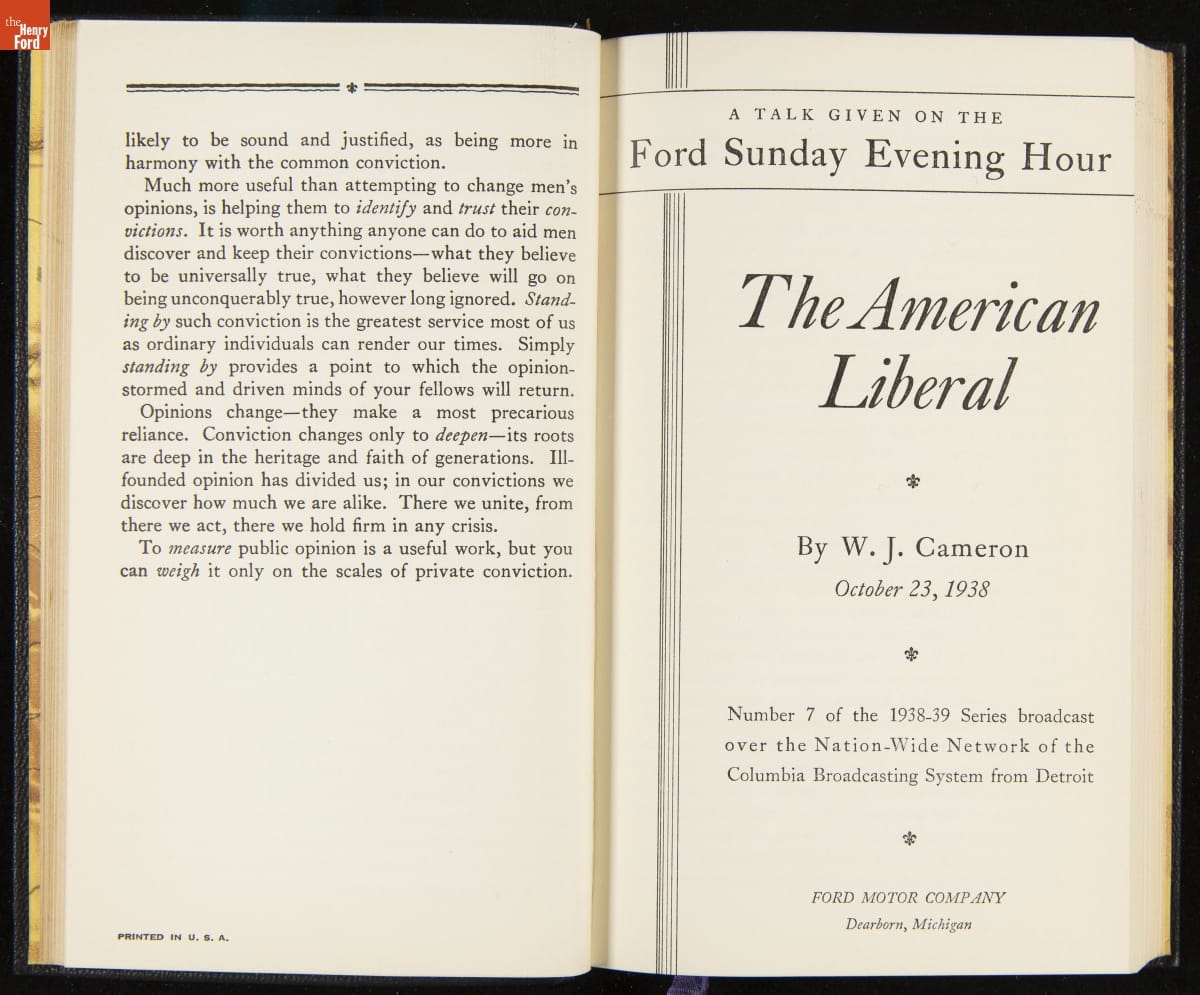 Launched in 1934, the Ford Sunday Evening Hour radio program featured classical music, guest soloists and conductors, and a weekly talk during intermission. Henry Ford asked his friend and advisor William J. Cameron to write and deliver these messages. Cameron, who composed the anti-Semitic articles for The Dearborn Independent, now peddled softer populist views--avoiding extremes and any direct attacks on politicians, ethnic groups, or Wall Street financiers.