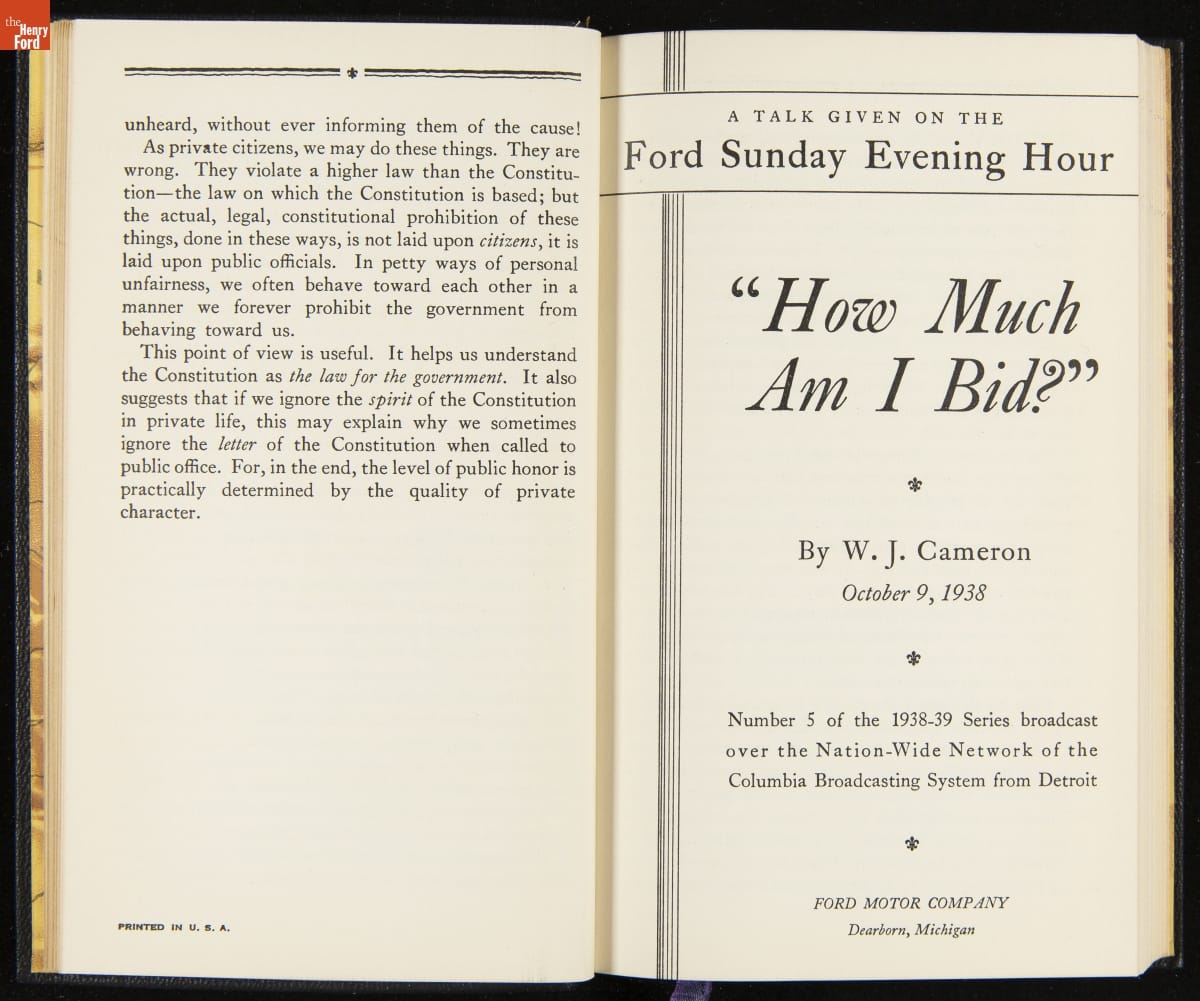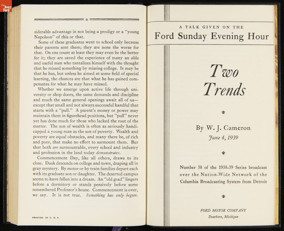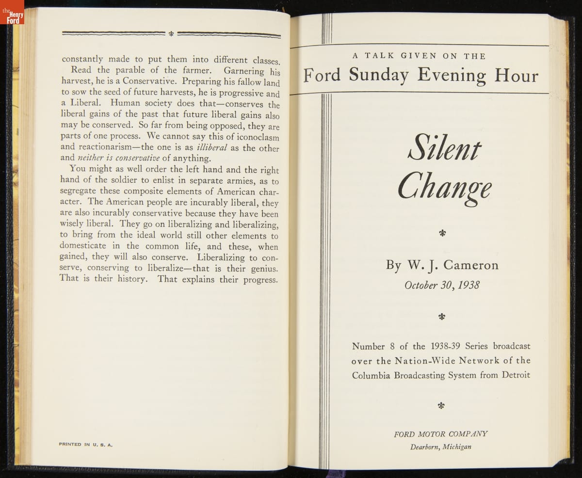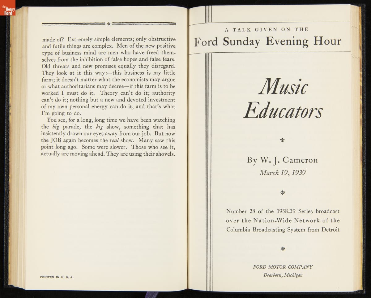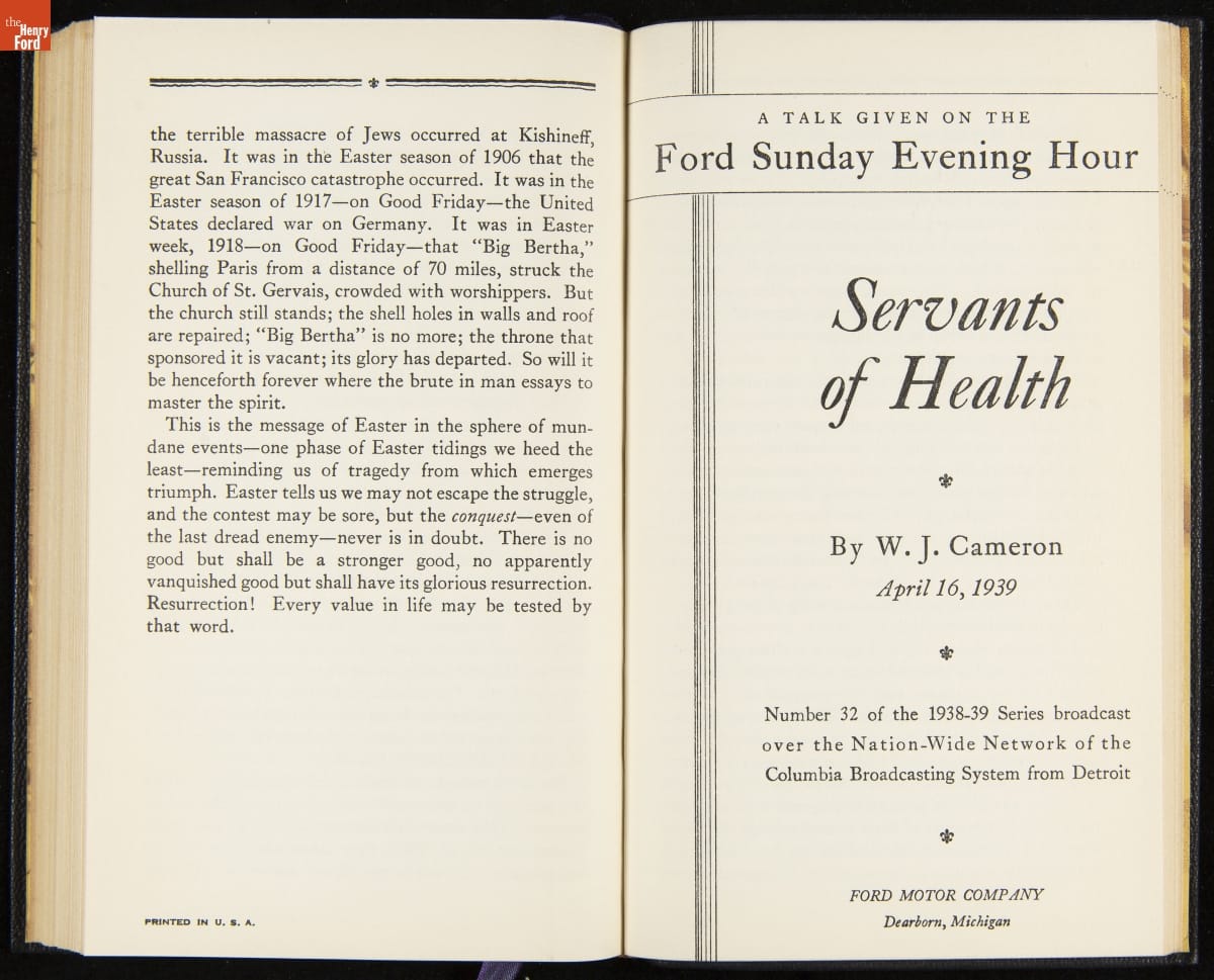 Launched in 1934, the Ford Sunday Evening Hour radio program featured classical music, guest soloists and conductors, and a weekly talk during intermission. Henry Ford asked his friend and advisor William J. Cameron to write and deliver these messages. Cameron, who composed the anti-Semitic articles for The Dearborn Independent, now peddled softer populist views--avoiding extremes and any direct attacks on politicians, ethnic groups, or Wall Street financiers.