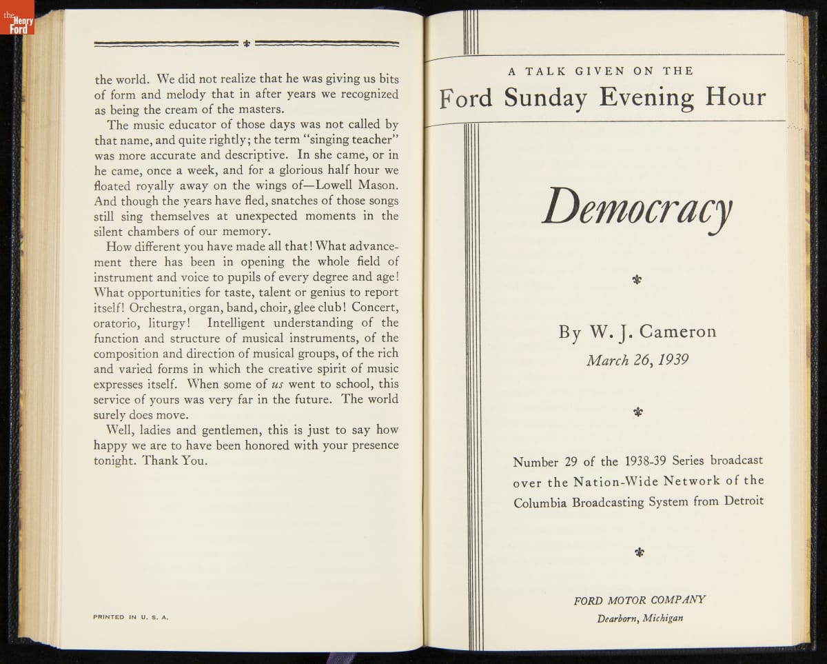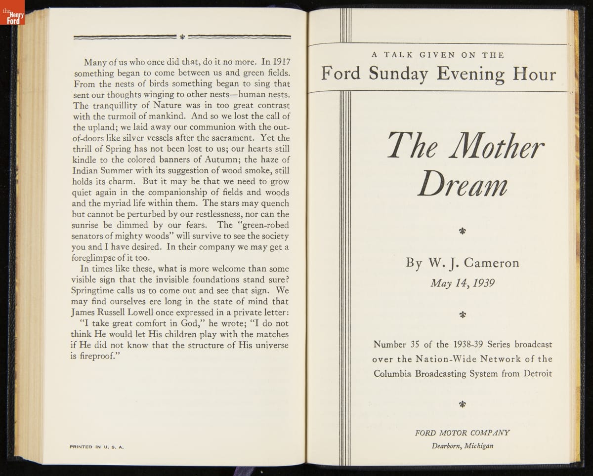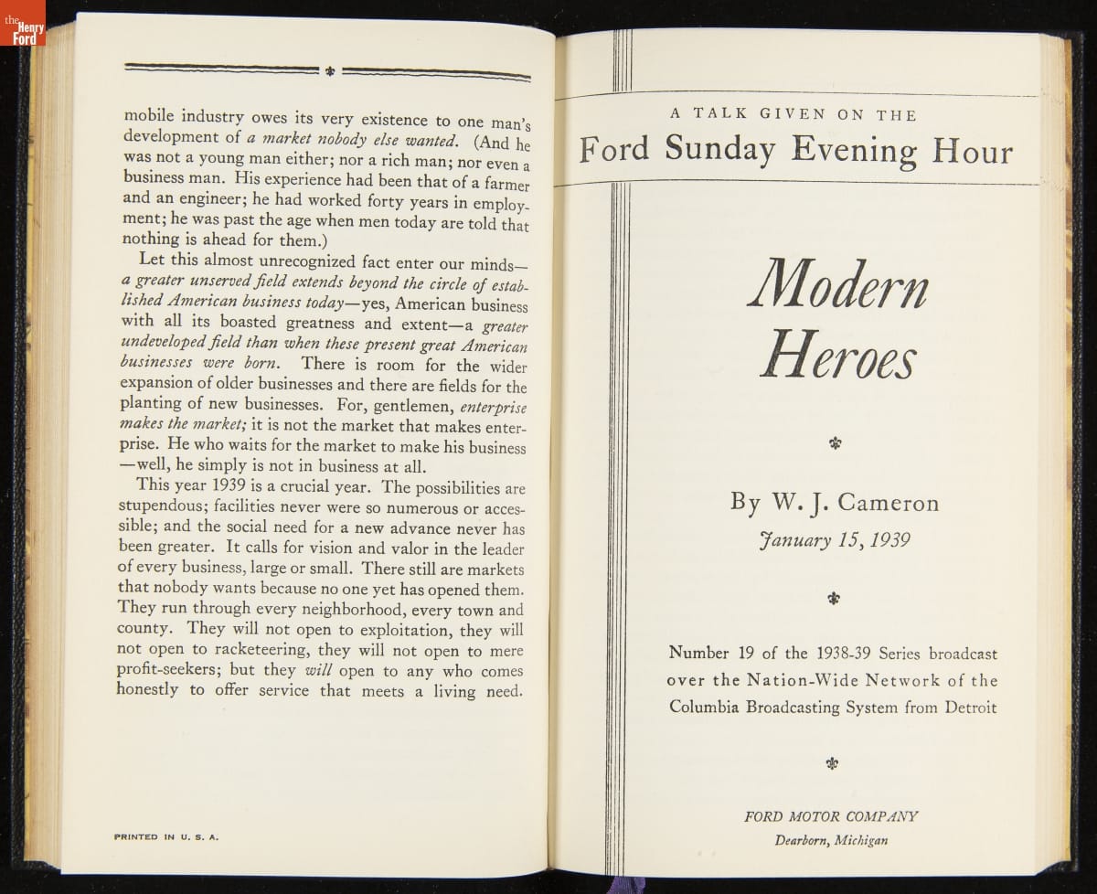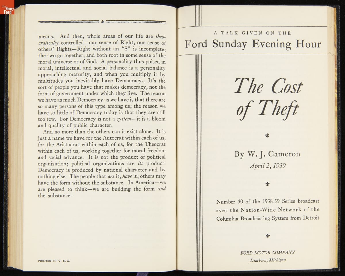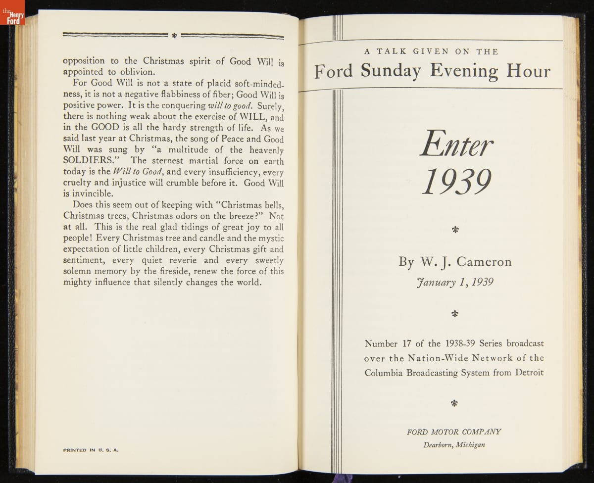 Launched in 1934, the Ford Sunday Evening Hour radio program featured classical music, guest soloists and conductors, and a weekly talk during intermission. Henry Ford asked his friend and advisor William J. Cameron to write and deliver these messages. Cameron, who composed the anti-Semitic articles for The Dearborn Independent, now peddled softer populist views--avoiding extremes and any direct attacks on politicians, ethnic groups, or Wall Street financiers.