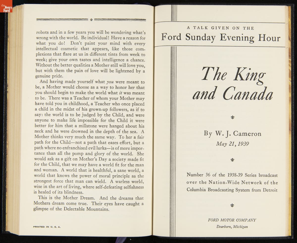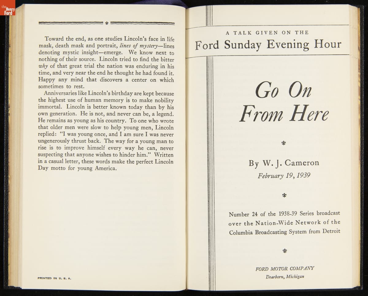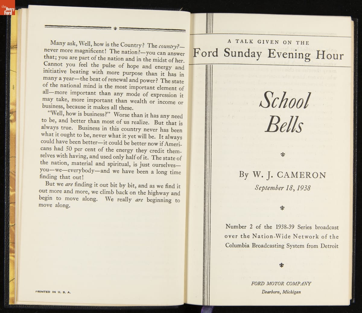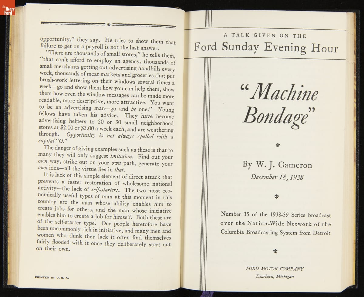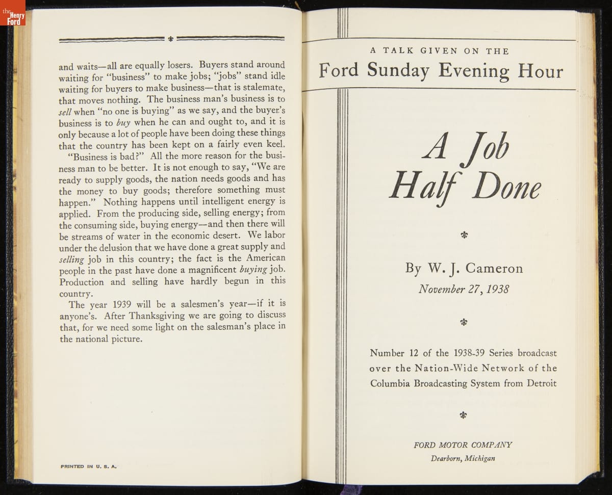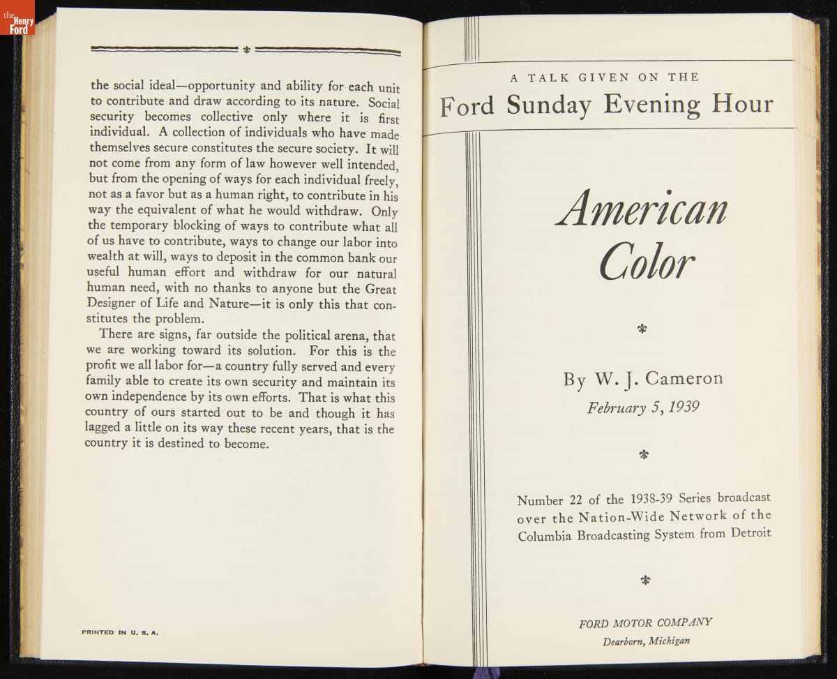 Launched in 1934, the Ford Sunday Evening Hour radio program featured classical music, guest soloists and conductors, and a weekly talk during intermission. Henry Ford asked his friend and advisor William J. Cameron to write and deliver these messages. Cameron, who composed the anti-Semitic articles for The Dearborn Independent, now peddled softer populist views--avoiding extremes and any direct attacks on politicians, ethnic groups, or Wall Street financiers.