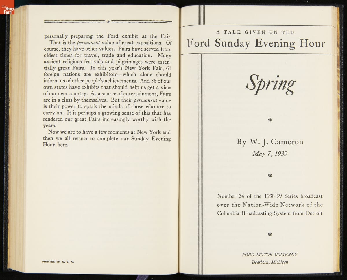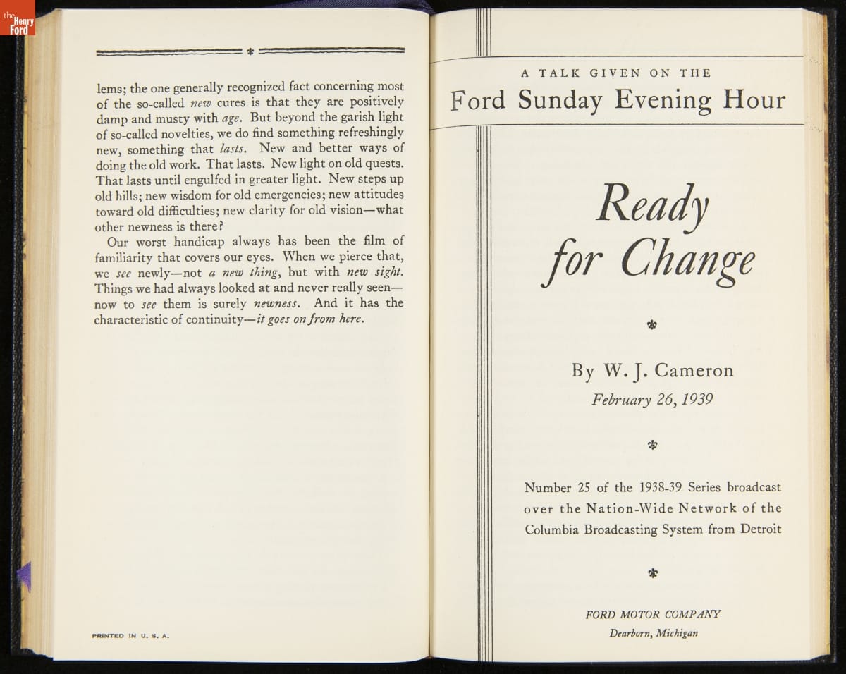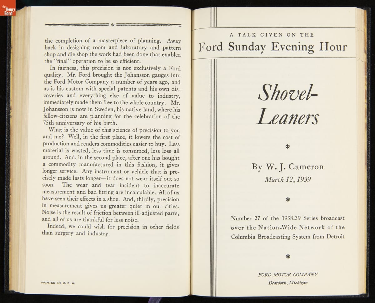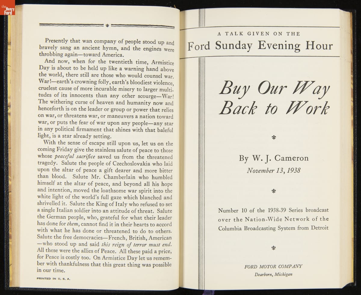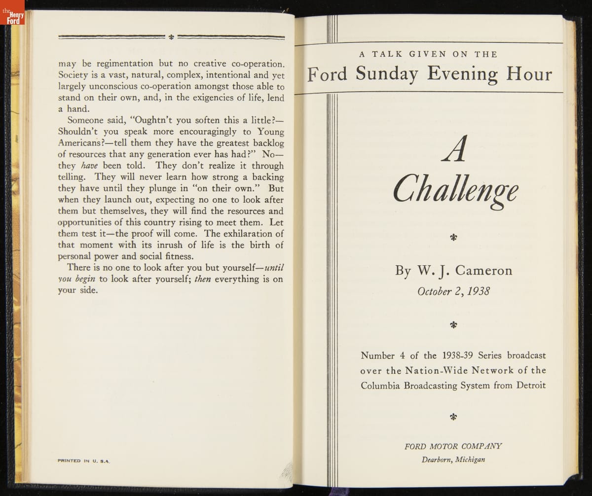 Launched in 1934, the Ford Sunday Evening Hour radio program featured classical music, guest soloists and conductors, and a weekly talk during intermission. Henry Ford asked his friend and advisor William J. Cameron to write and deliver these messages. Cameron, who composed the anti-Semitic articles for The Dearborn Independent, now peddled softer populist views--avoiding extremes and any direct attacks on politicians, ethnic groups, or Wall Street financiers.