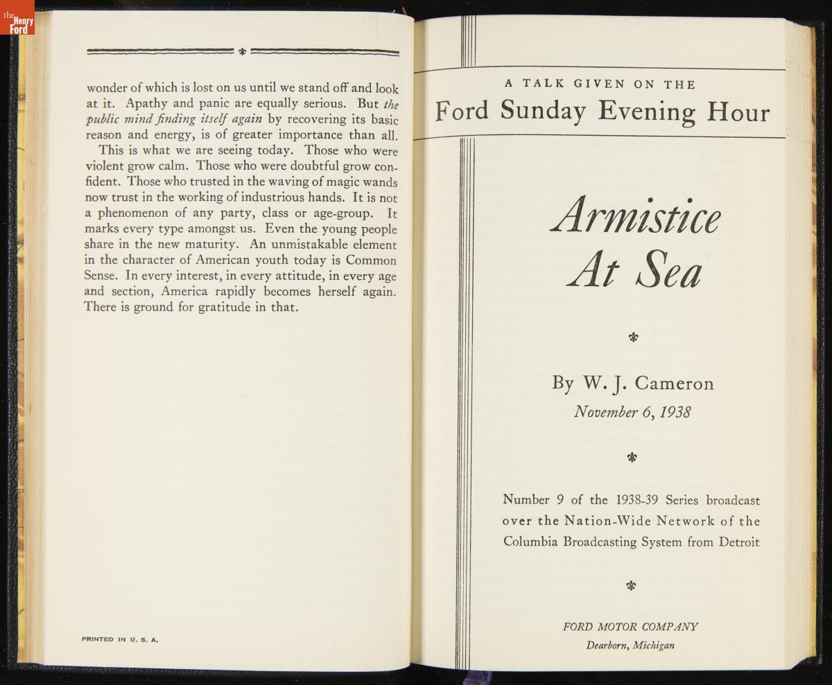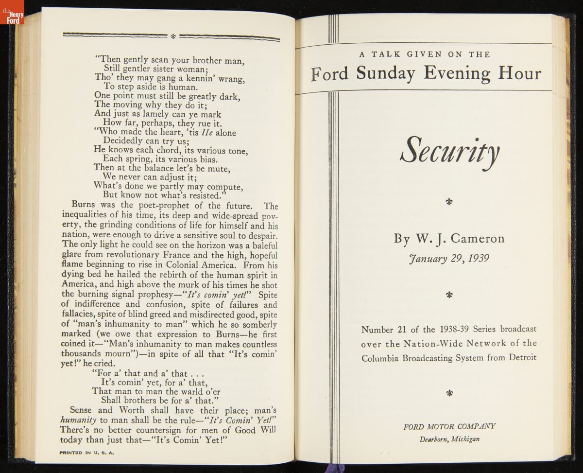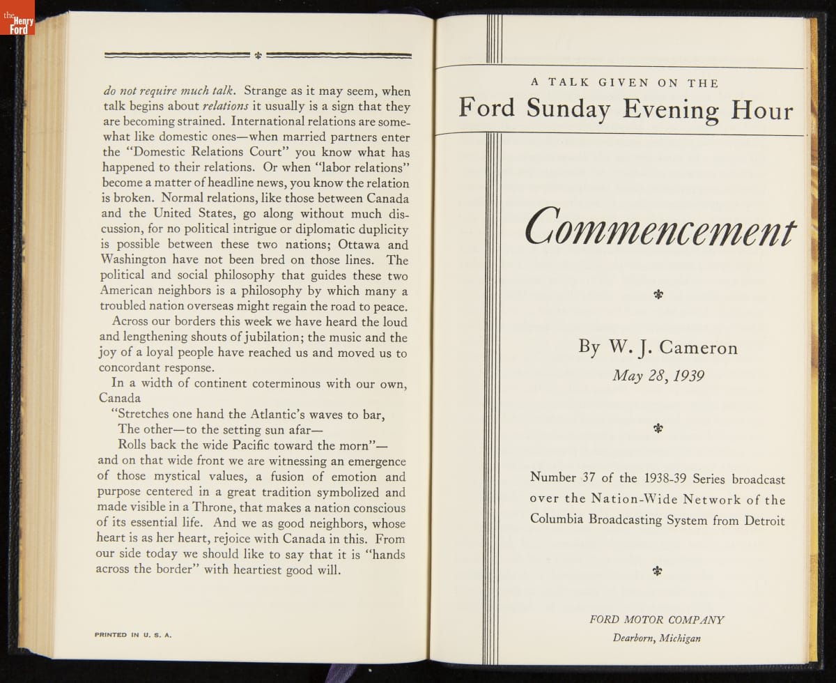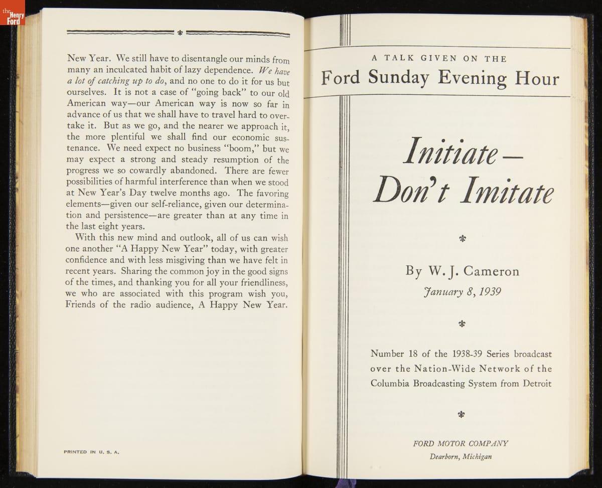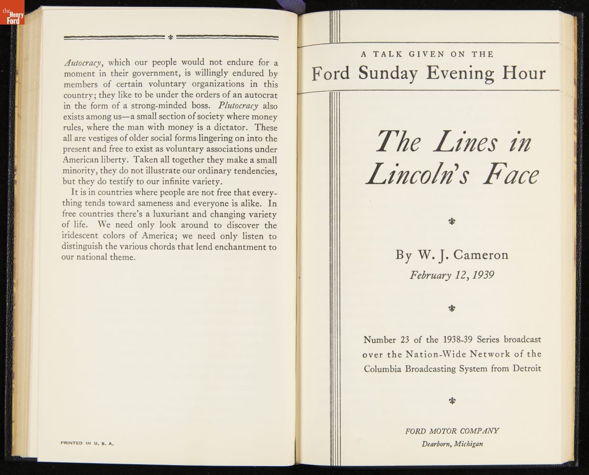 Launched in 1934, the Ford Sunday Evening Hour radio program featured classical music, guest soloists and conductors, and a weekly talk during intermission. Henry Ford asked his friend and advisor William J. Cameron to write and deliver these messages. Cameron, who composed the anti-Semitic articles for The Dearborn Independent, now peddled softer populist views--avoiding extremes and any direct attacks on politicians, ethnic groups, or Wall Street financiers.