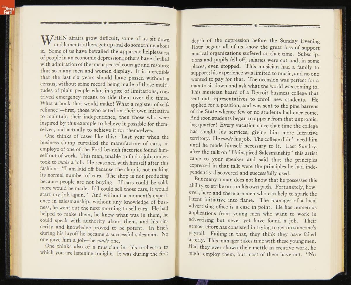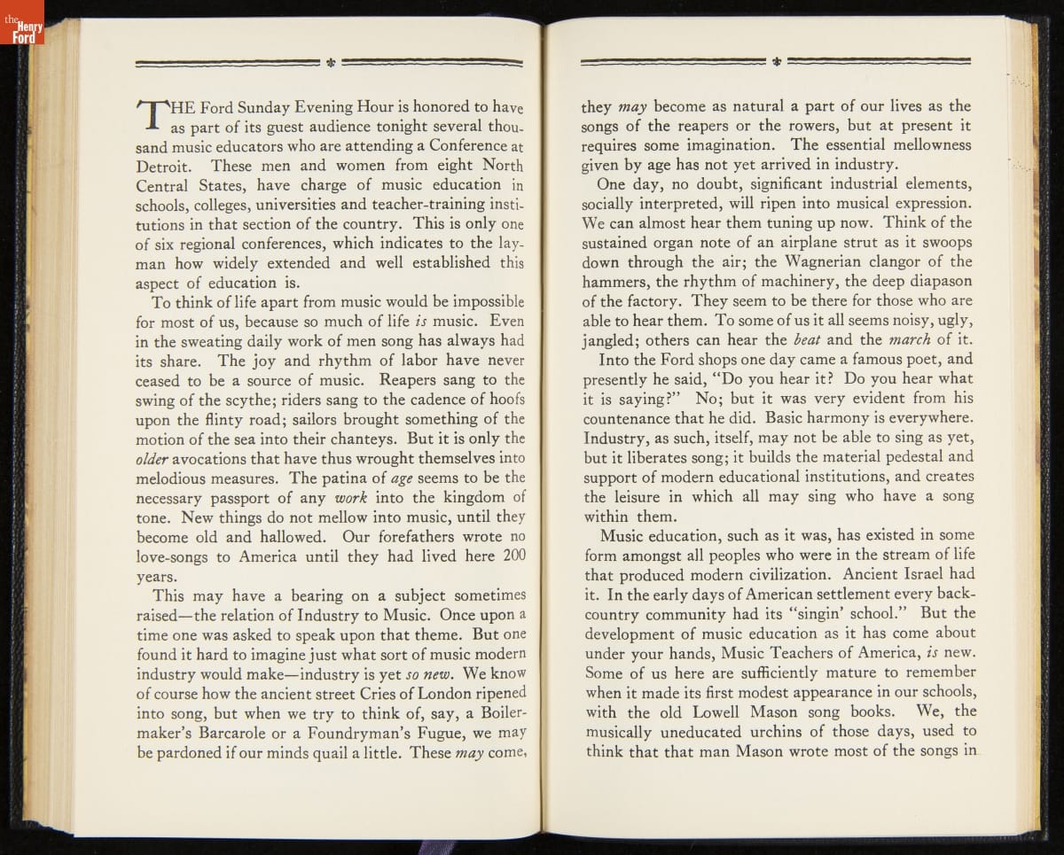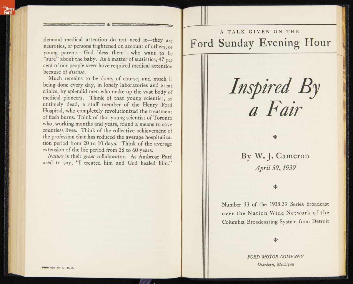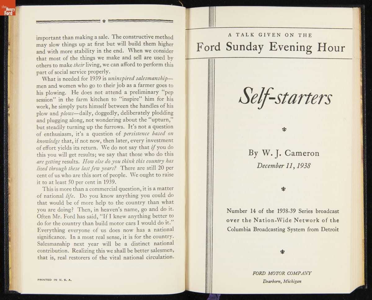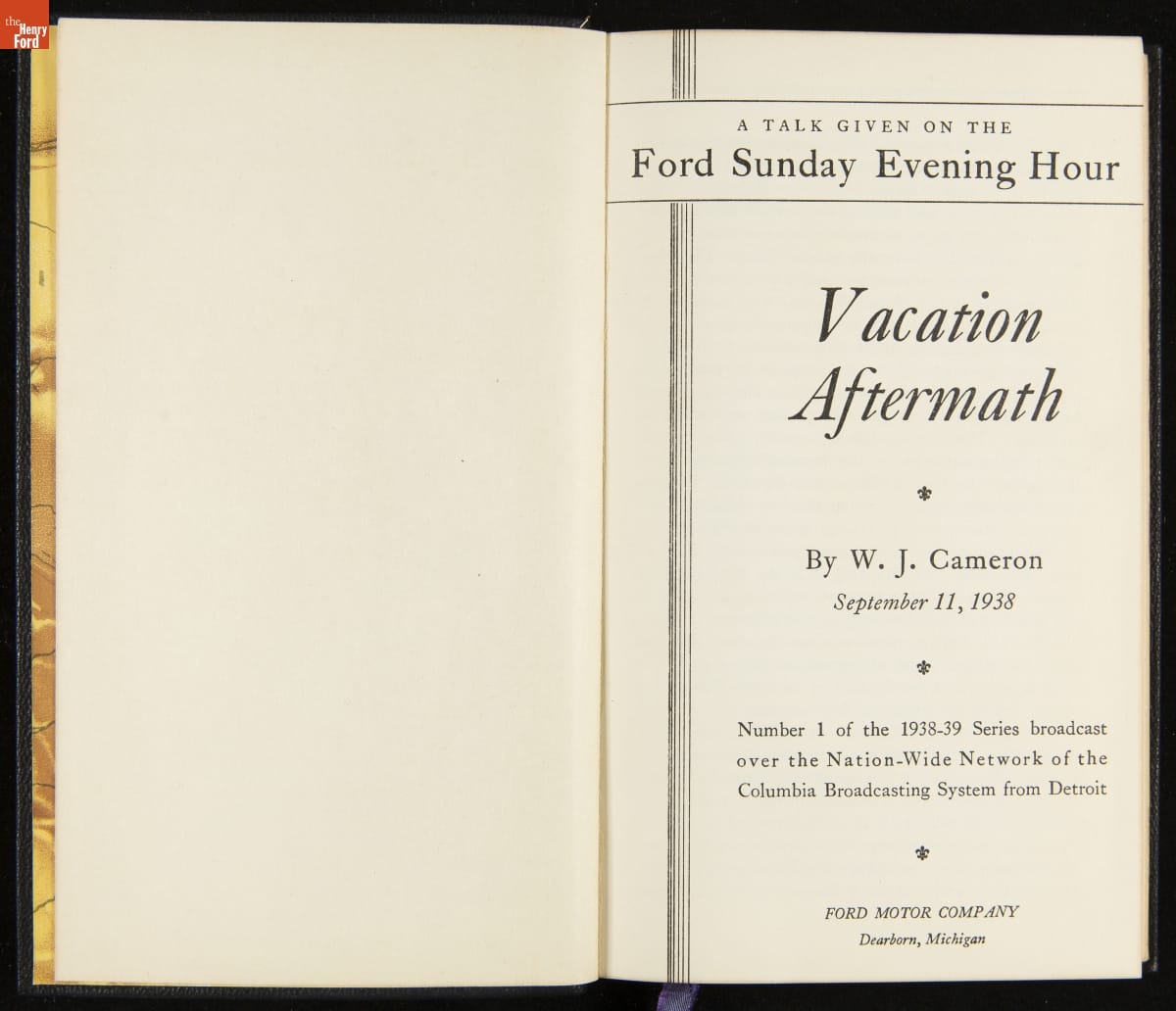 Launched in 1934, the Ford Sunday Evening Hour radio program featured classical music, guest soloists and conductors, and a weekly talk during intermission. Henry Ford asked his friend and advisor William J. Cameron to write and deliver these messages. Cameron, who composed the anti-Semitic articles for The Dearborn Independent, now peddled softer populist views--avoiding extremes and any direct attacks on politicians, ethnic groups, or Wall Street financiers.