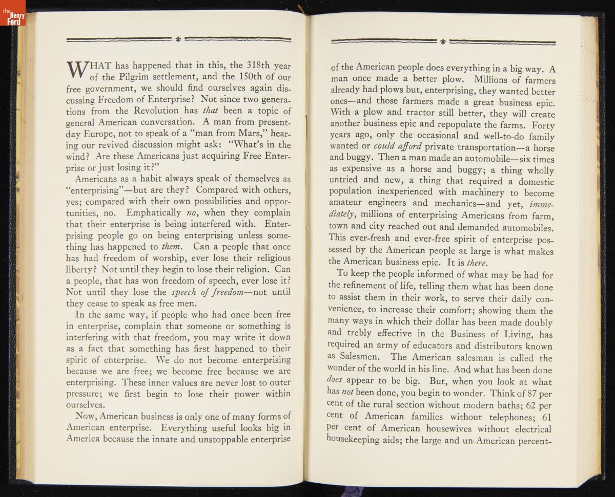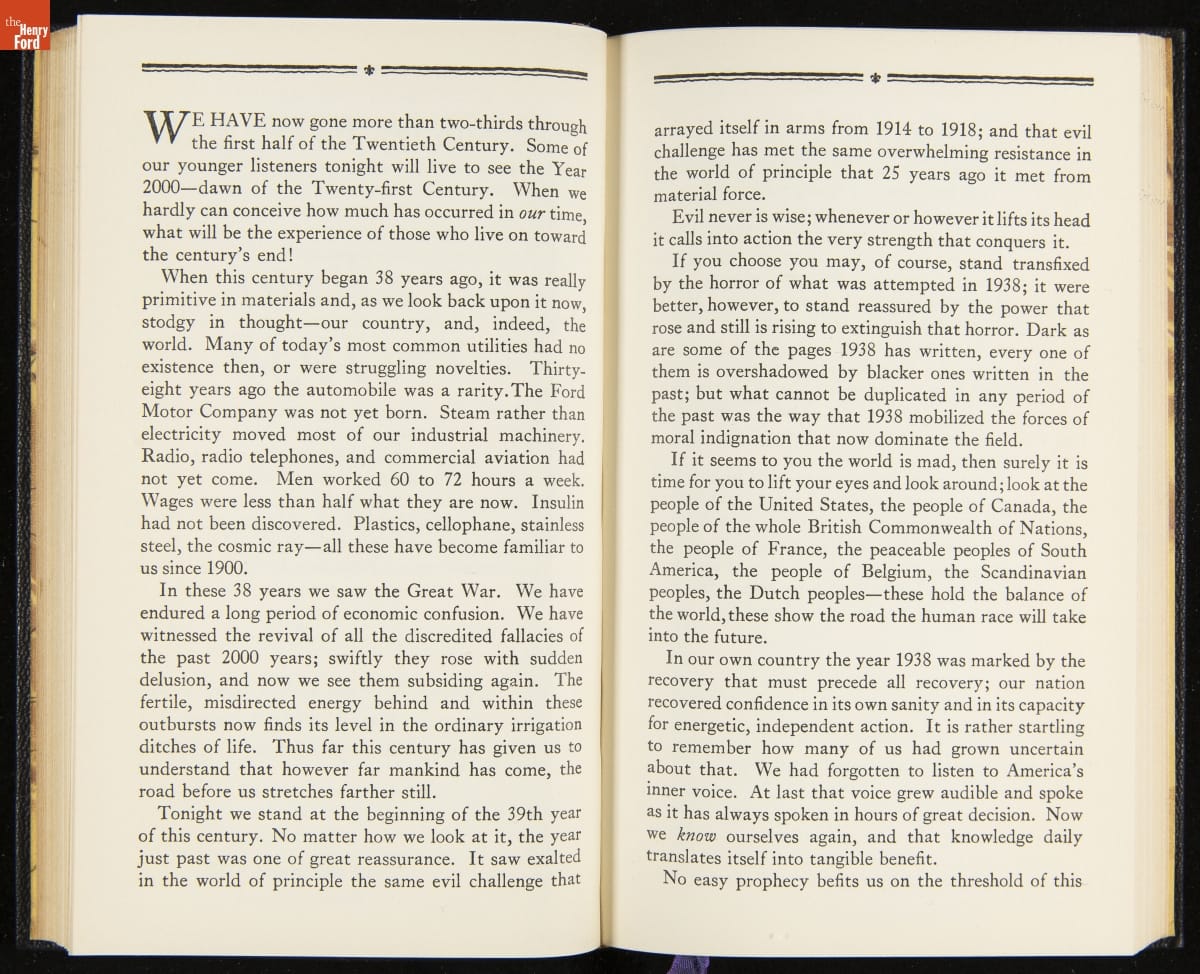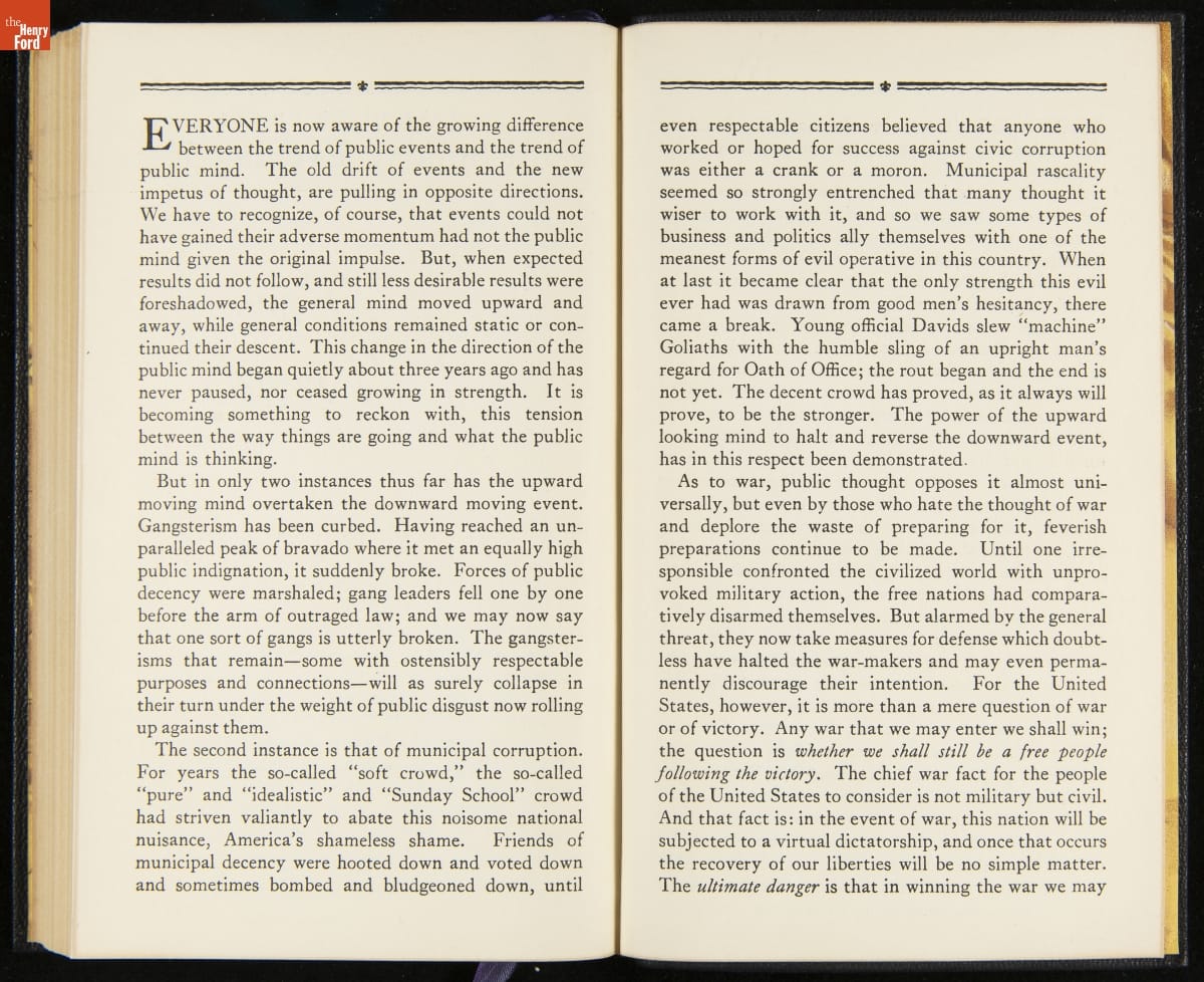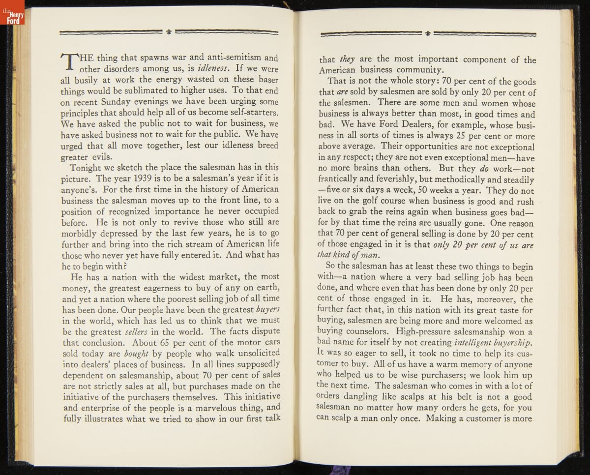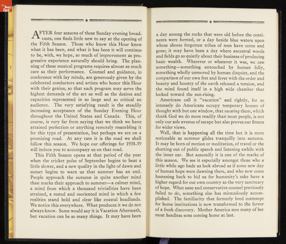 Launched in 1934, the Ford Sunday Evening Hour radio program featured classical music, guest soloists and conductors, and a weekly talk during intermission. Henry Ford asked his friend and advisor William J. Cameron to write and deliver these messages. Cameron, who composed the anti-Semitic articles for The Dearborn Independent, now peddled softer populist views--avoiding extremes and any direct attacks on politicians, ethnic groups, or Wall Street financiers.
