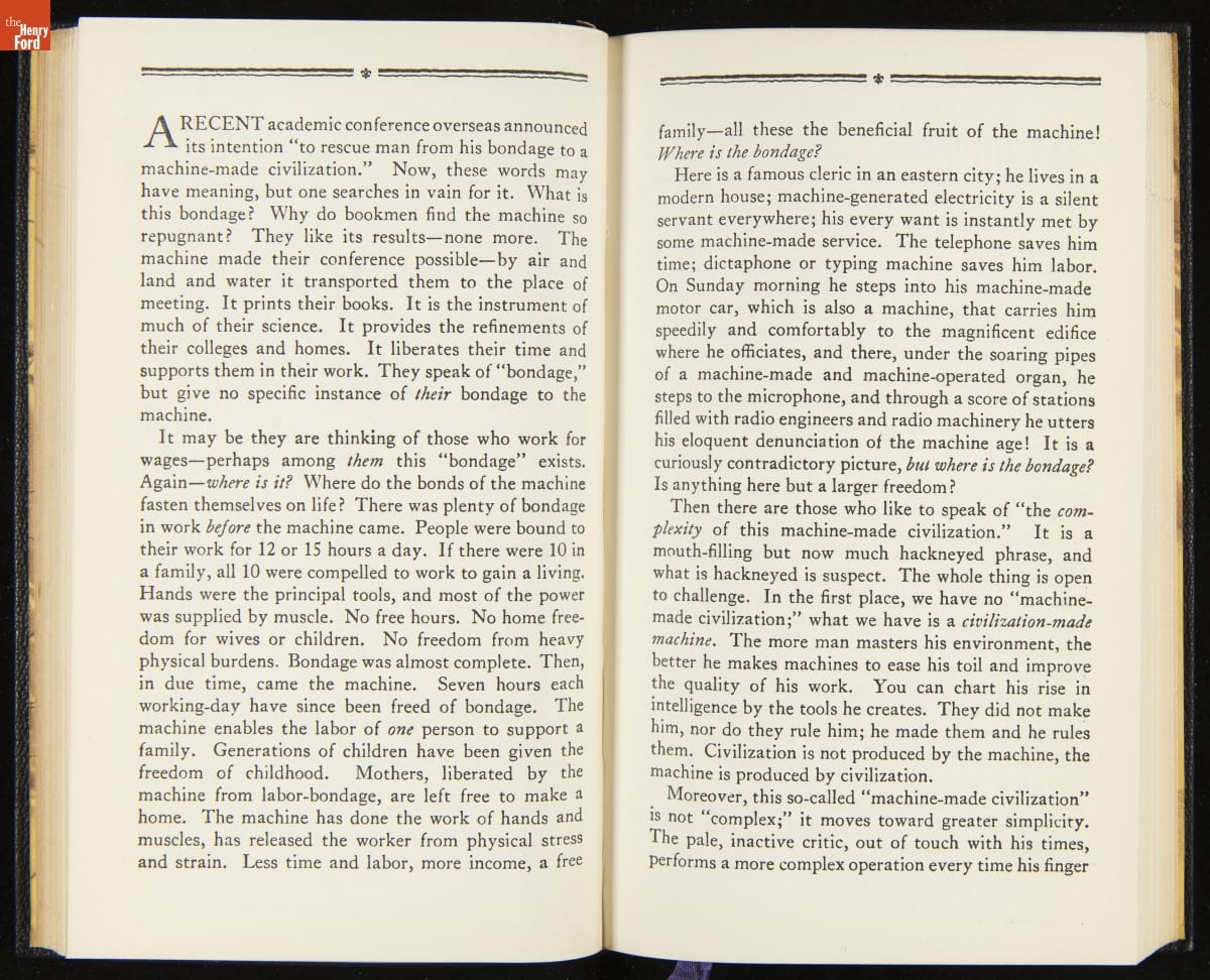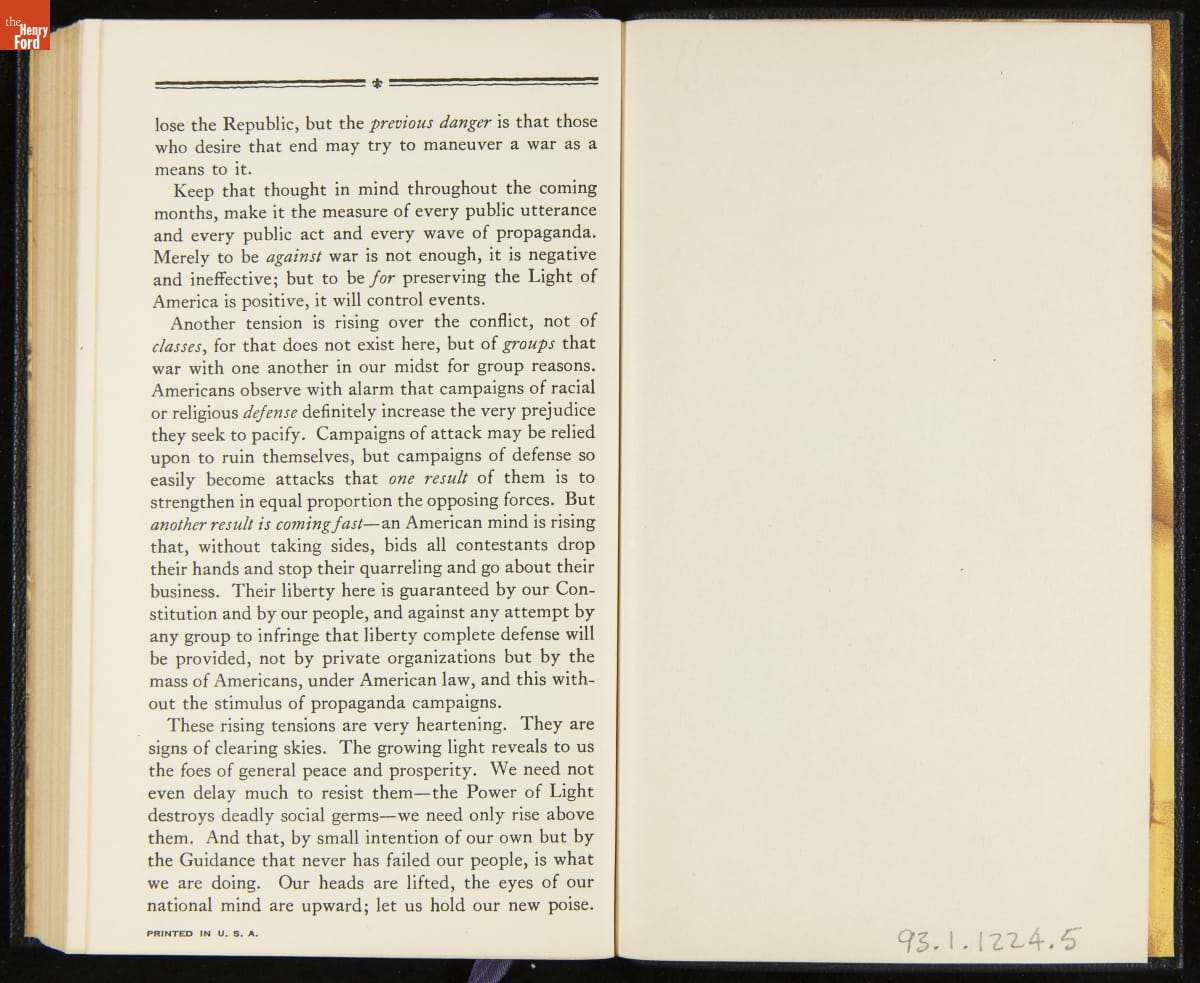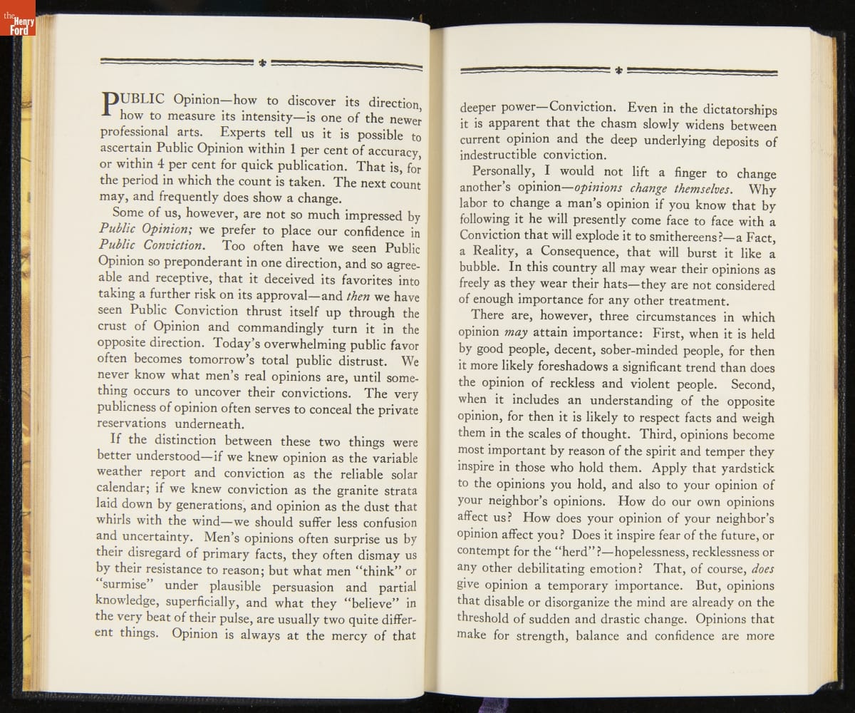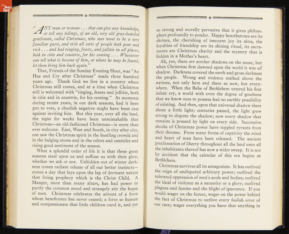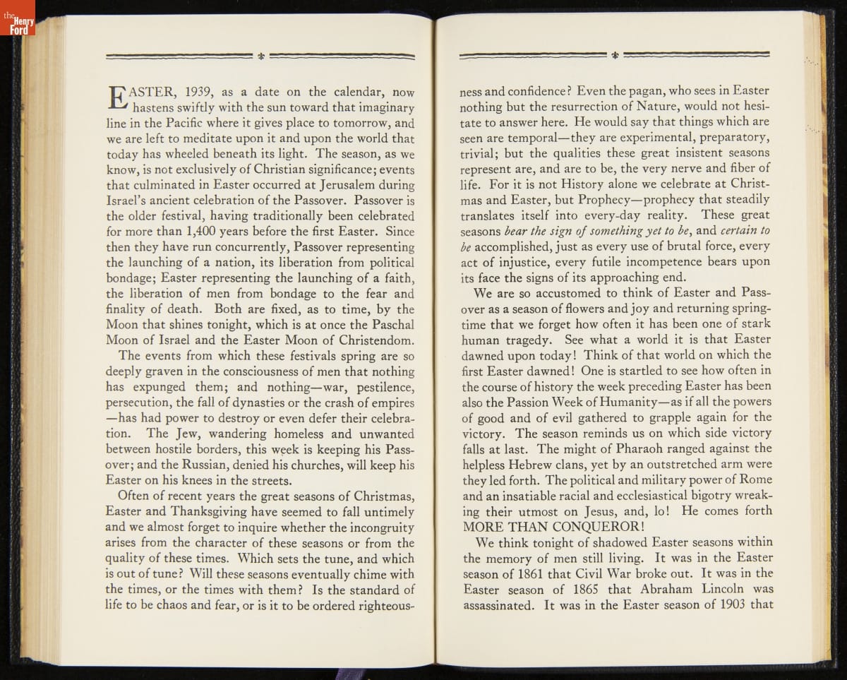 Launched in 1934, the Ford Sunday Evening Hour radio program featured classical music, guest soloists and conductors, and a weekly talk during intermission. Henry Ford asked his friend and advisor William J. Cameron to write and deliver these messages. Cameron, who composed the anti-Semitic articles for The Dearborn Independent, now peddled softer populist views--avoiding extremes and any direct attacks on politicians, ethnic groups, or Wall Street financiers.