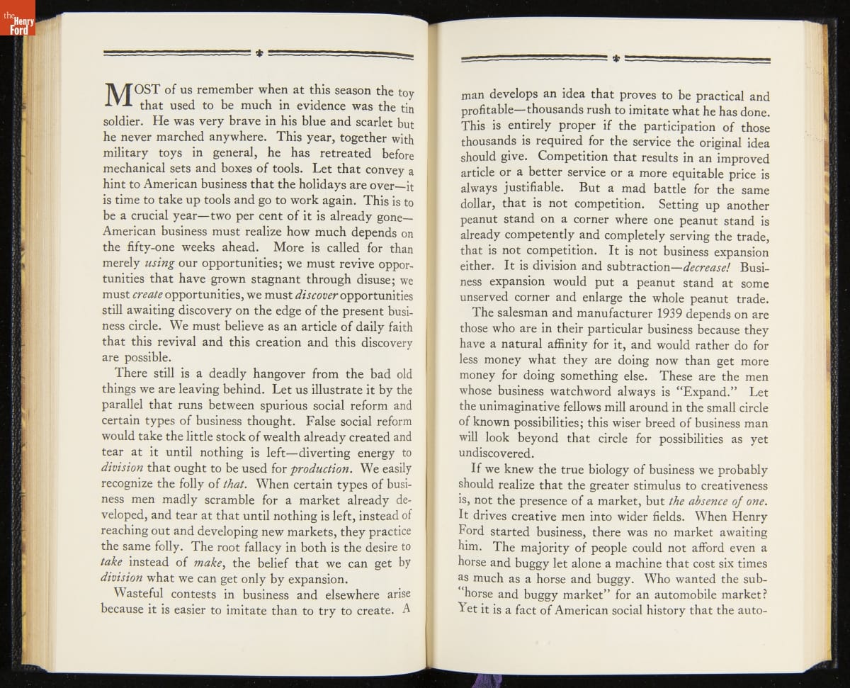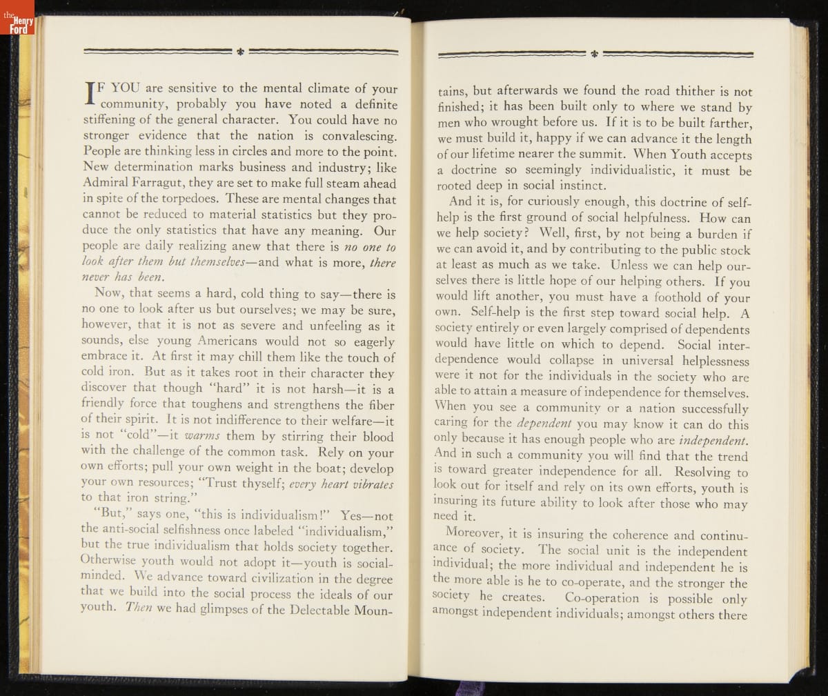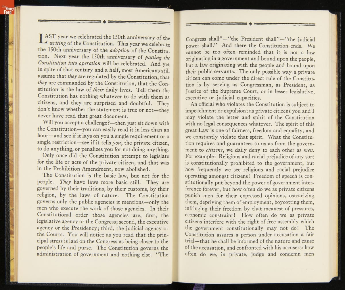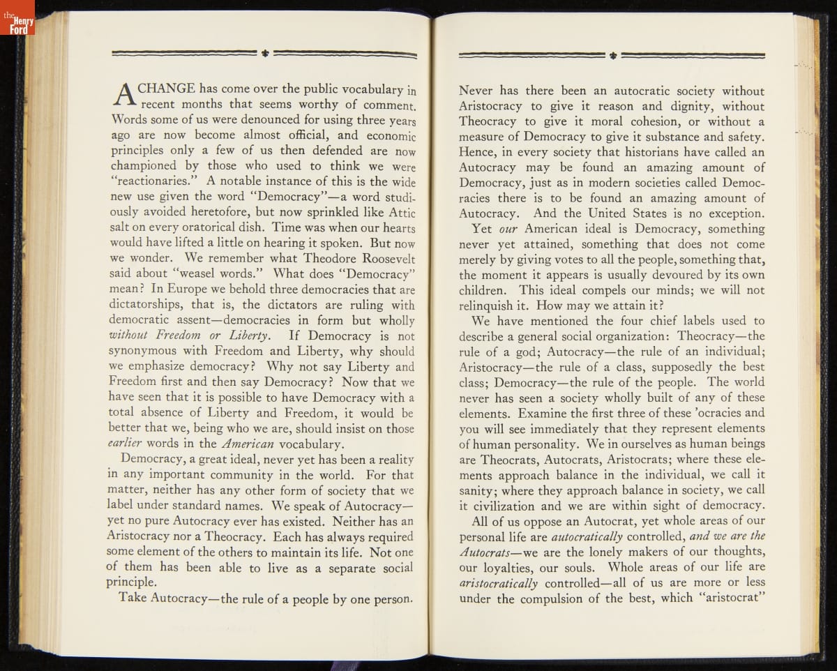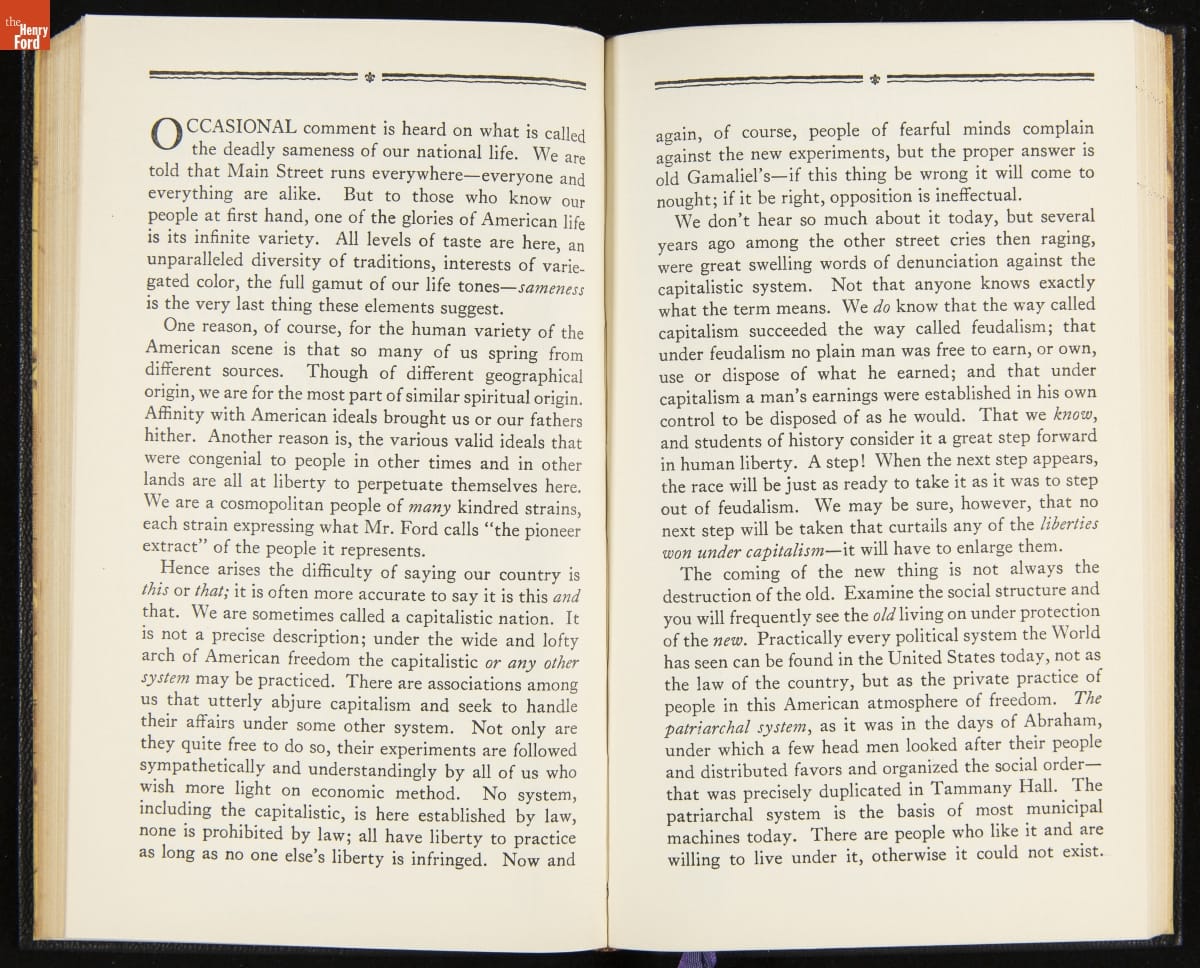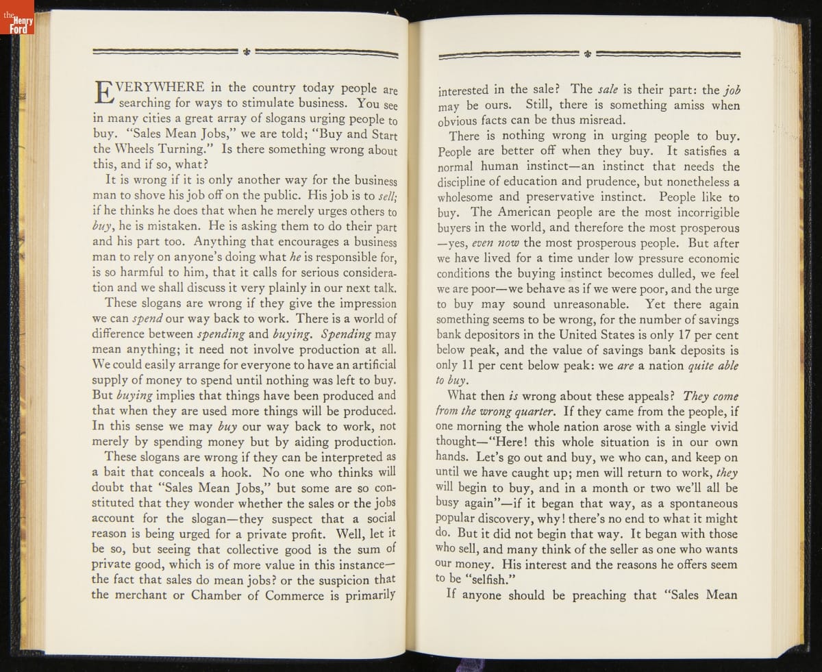 Launched in 1934, the Ford Sunday Evening Hour radio program featured classical music, guest soloists and conductors, and a weekly talk during intermission. Henry Ford asked his friend and advisor William J. Cameron to write and deliver these messages. Cameron, who composed the anti-Semitic articles for The Dearborn Independent, now peddled softer populist views--avoiding extremes and any direct attacks on politicians, ethnic groups, or Wall Street financiers.