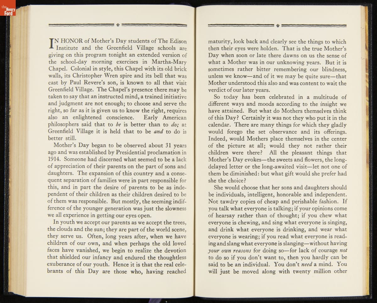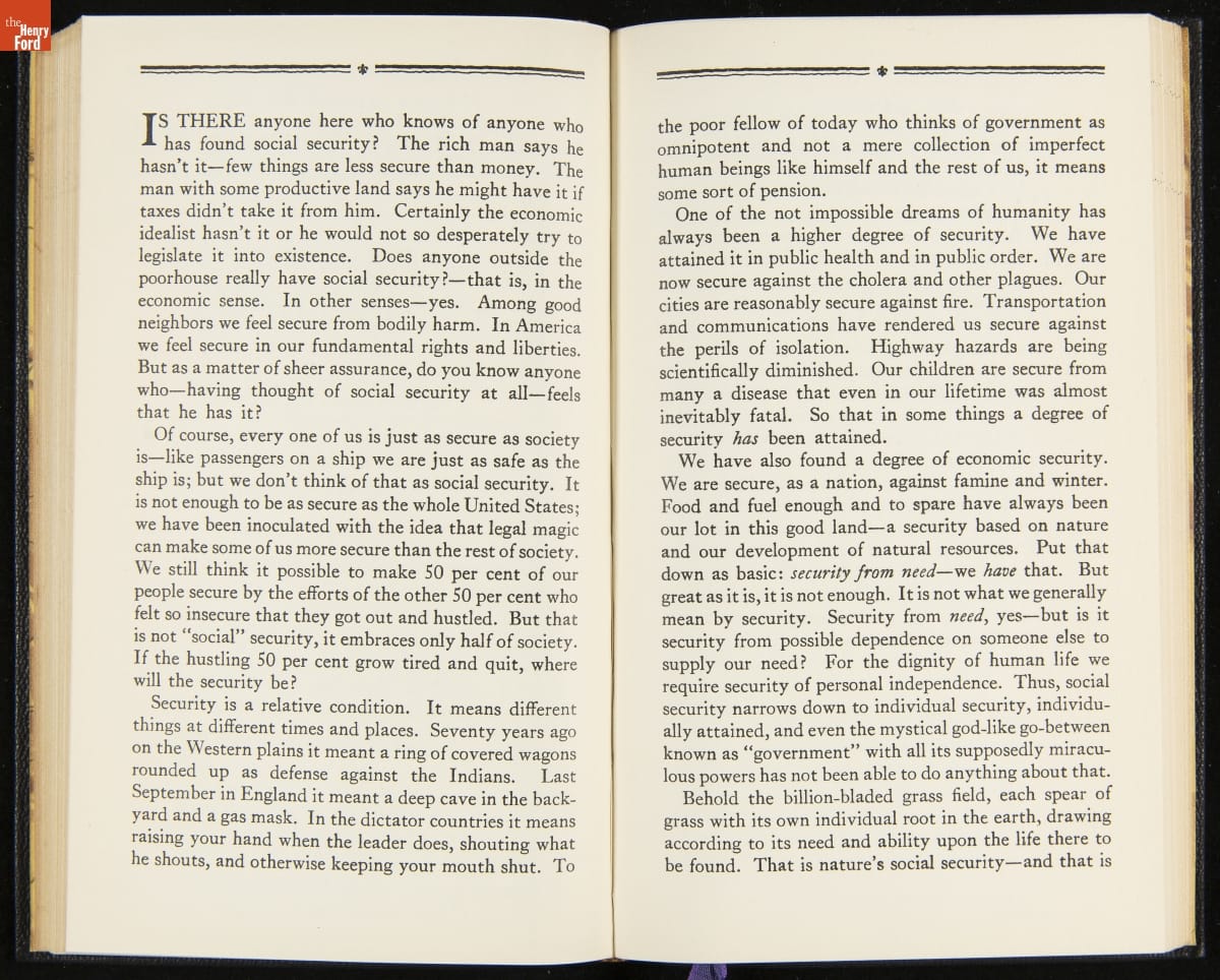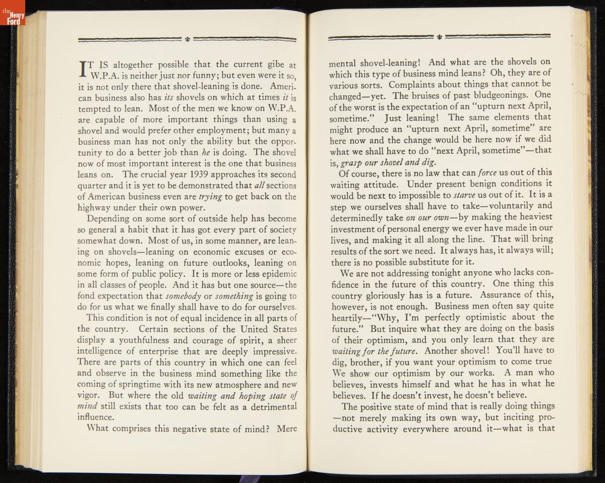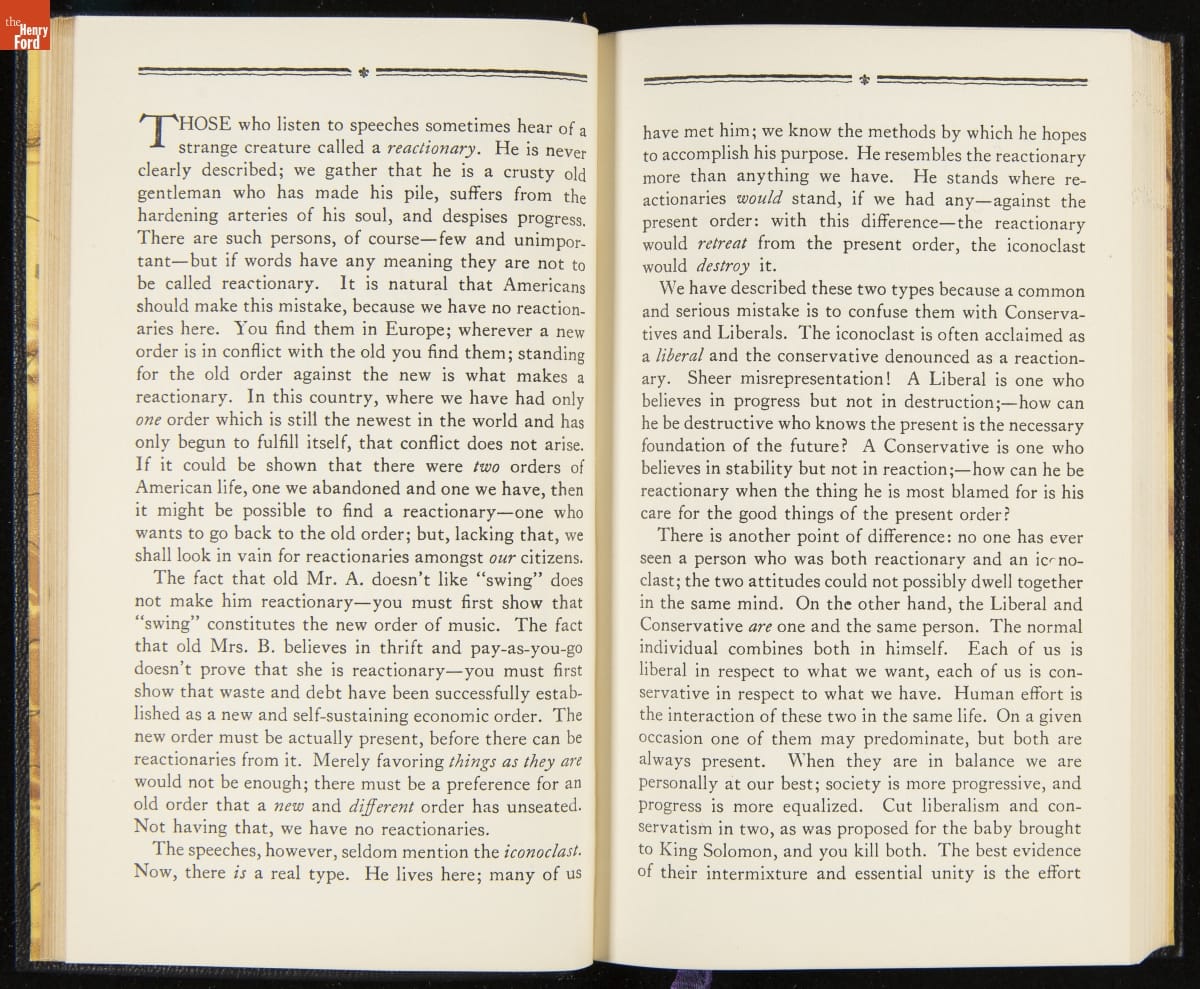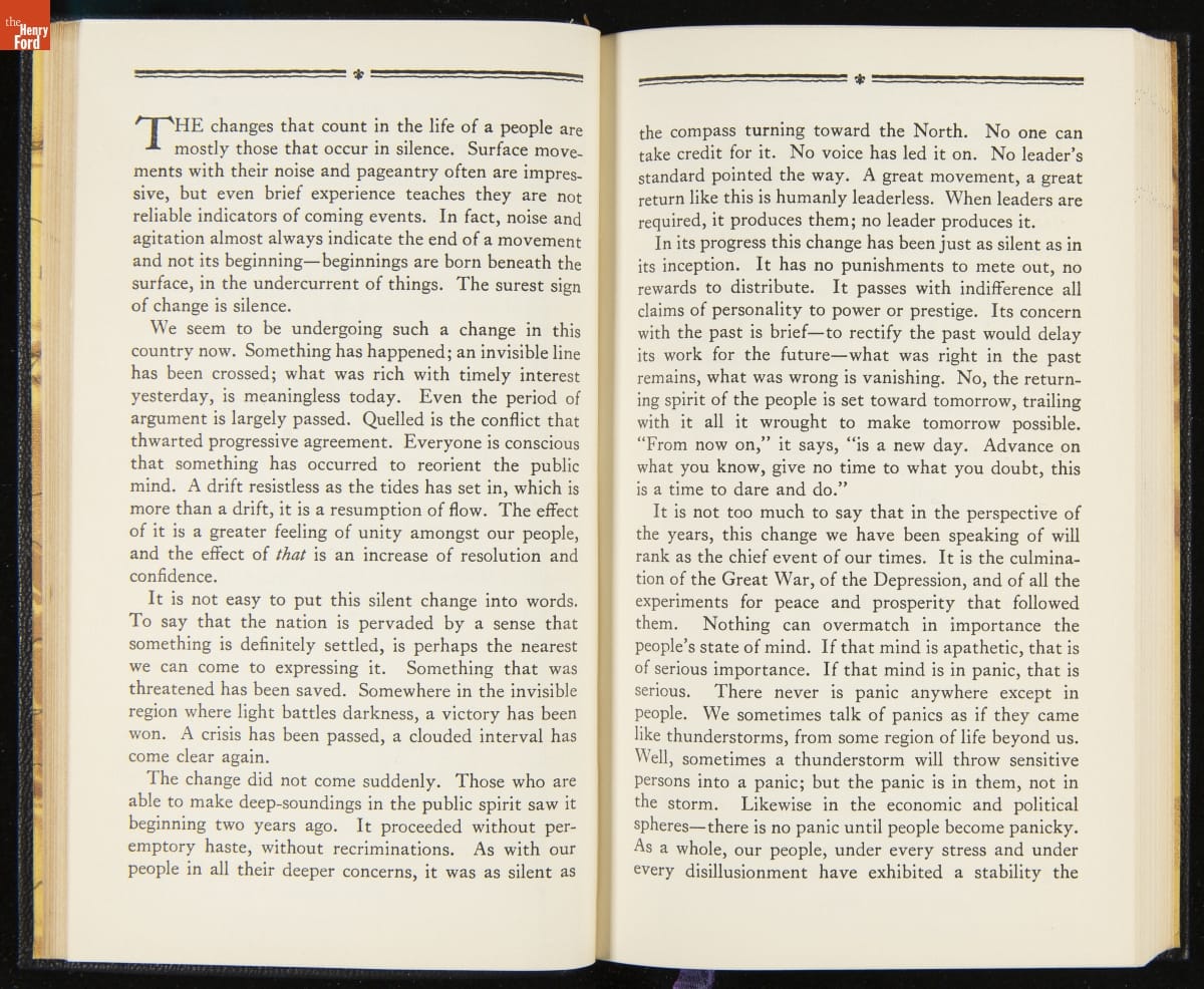 Launched in 1934, the Ford Sunday Evening Hour radio program featured classical music, guest soloists and conductors, and a weekly talk during intermission. Henry Ford asked his friend and advisor William J. Cameron to write and deliver these messages. Cameron, who composed the anti-Semitic articles for The Dearborn Independent, now peddled softer populist views--avoiding extremes and any direct attacks on politicians, ethnic groups, or Wall Street financiers.