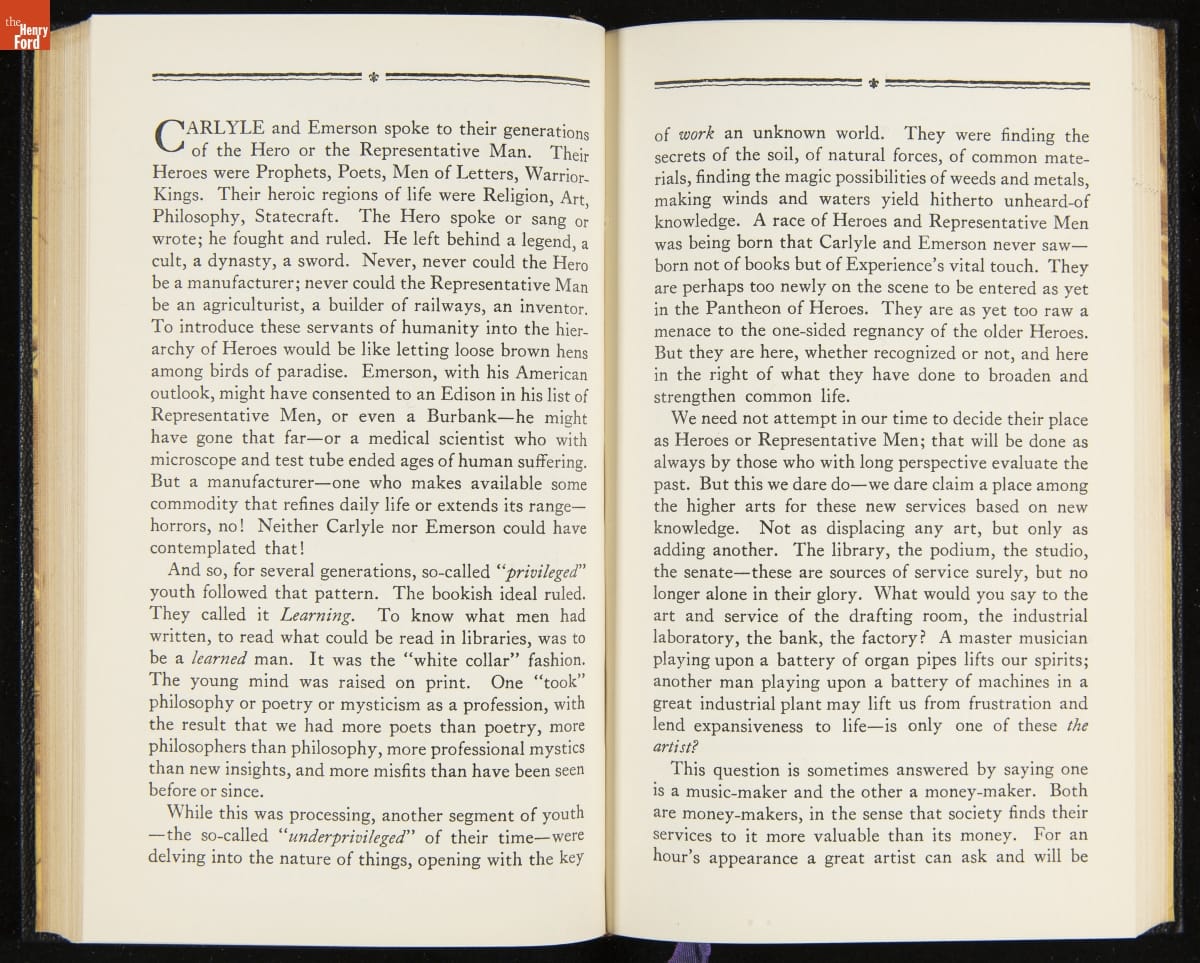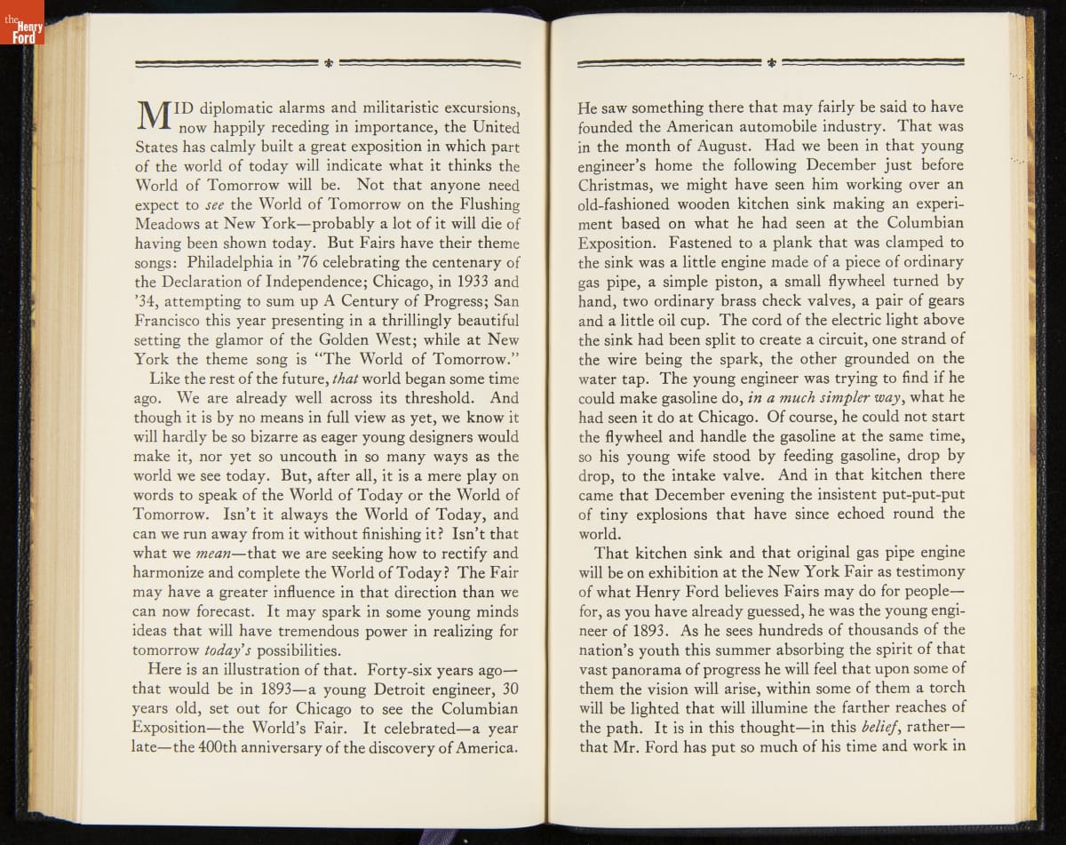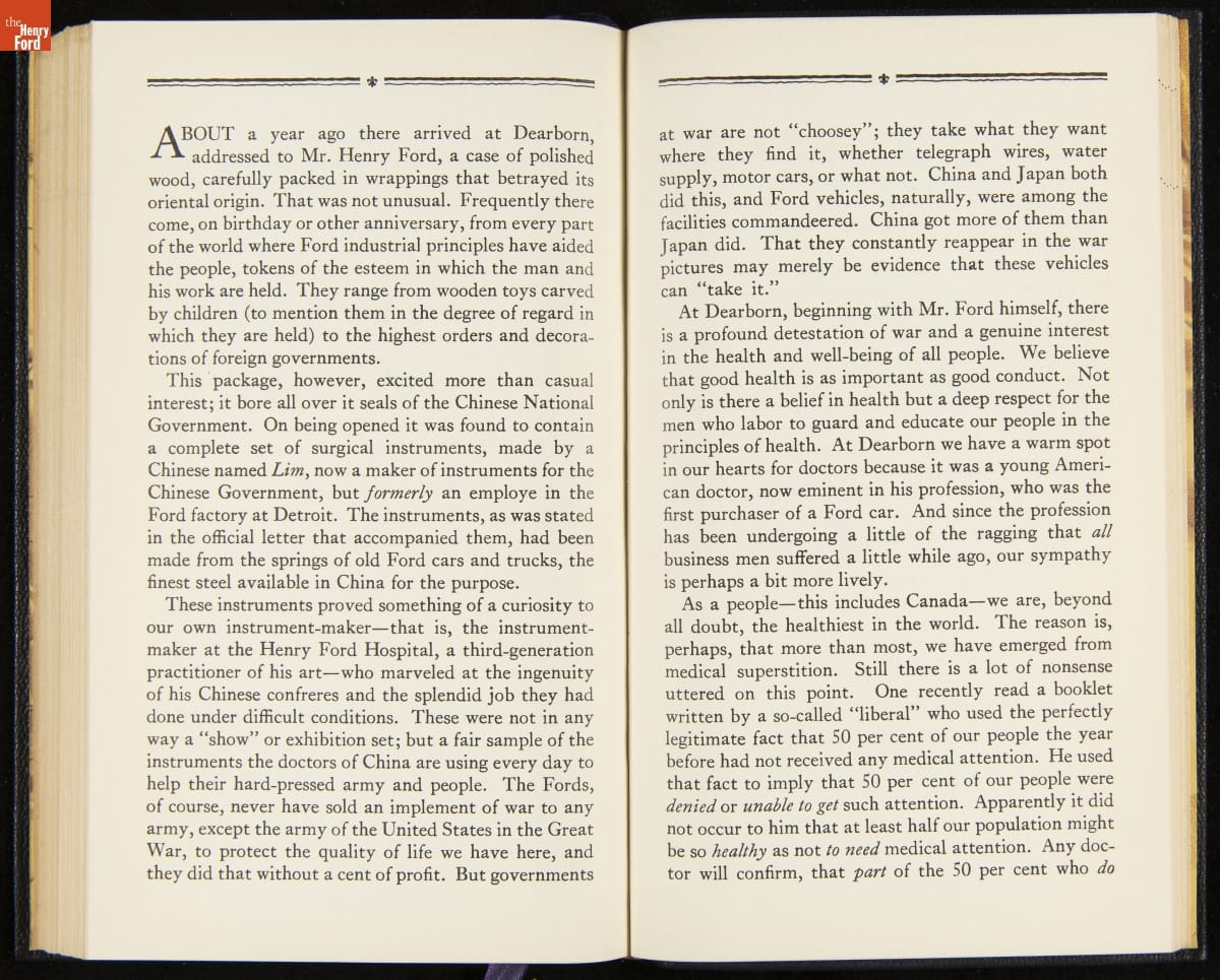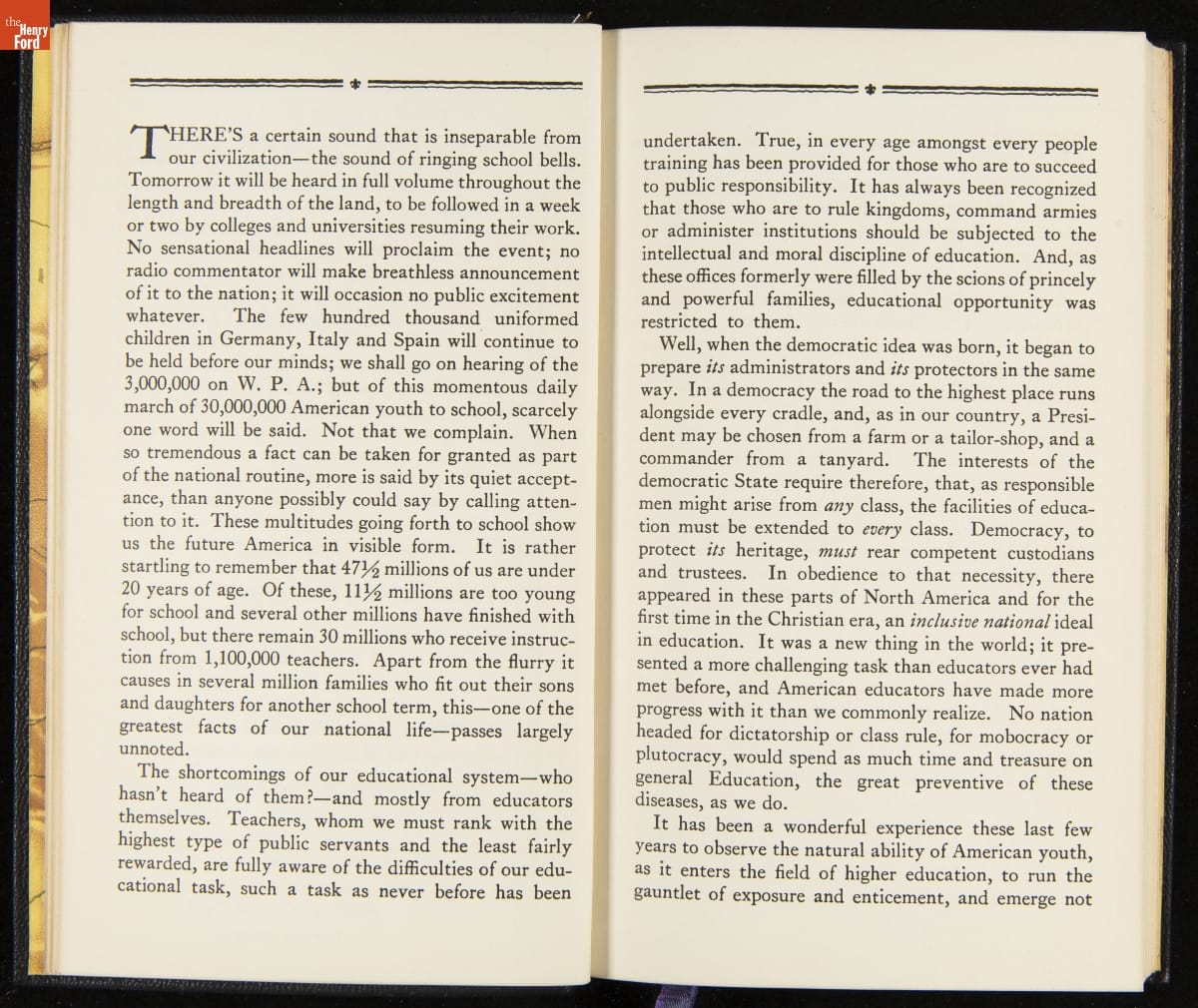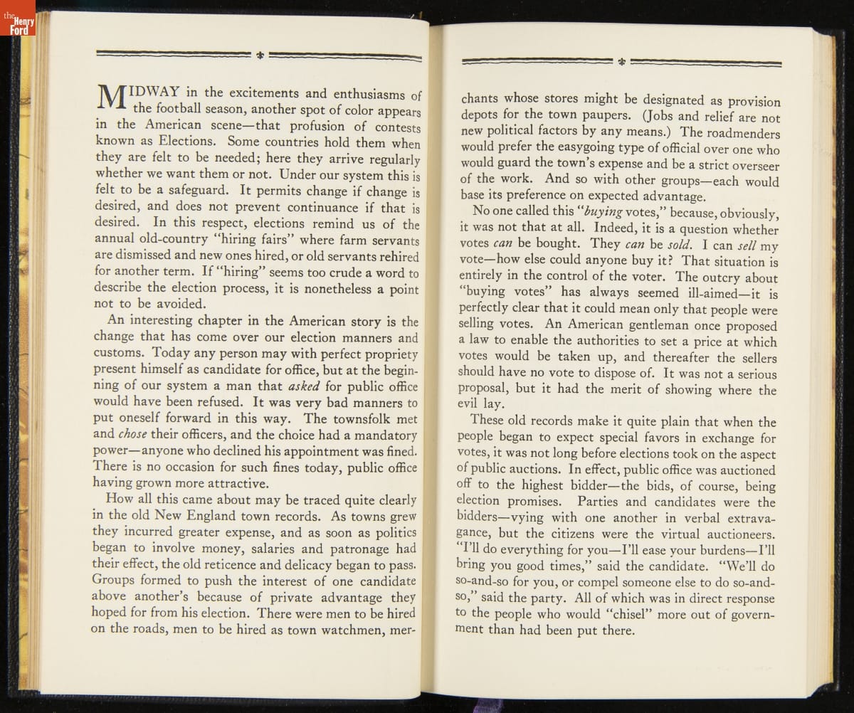 Launched in 1934, the Ford Sunday Evening Hour radio program featured classical music, guest soloists and conductors, and a weekly talk during intermission. Henry Ford asked his friend and advisor William J. Cameron to write and deliver these messages. Cameron, who composed the anti-Semitic articles for The Dearborn Independent, now peddled softer populist views--avoiding extremes and any direct attacks on politicians, ethnic groups, or Wall Street financiers.