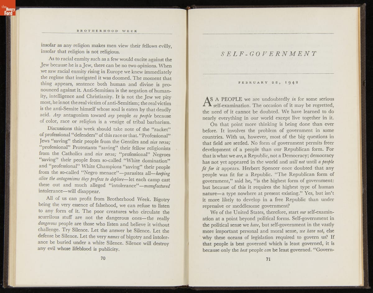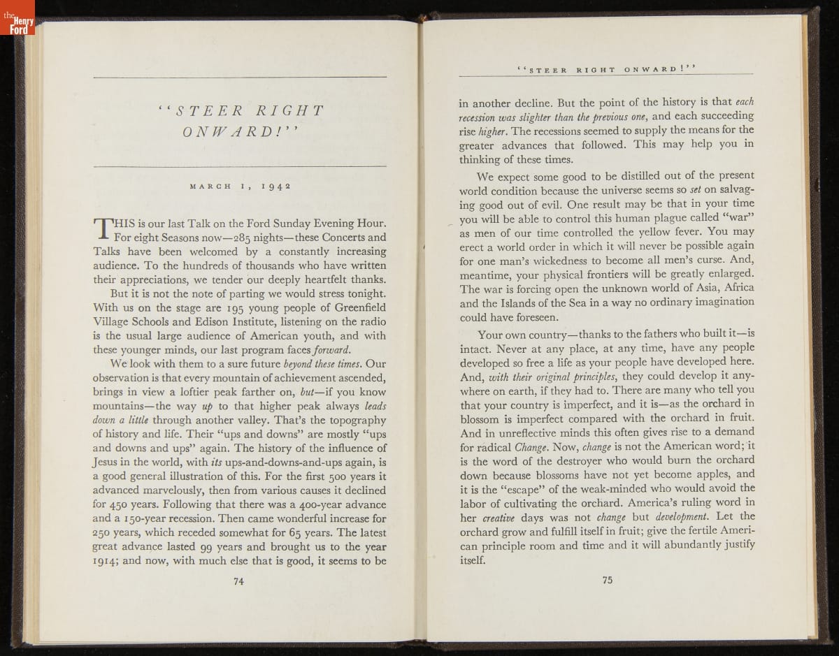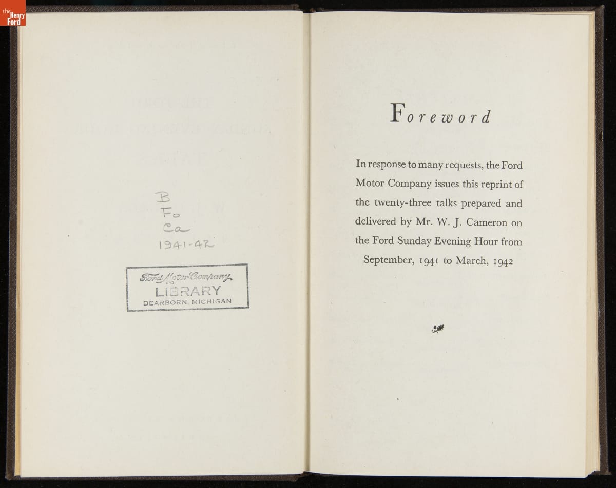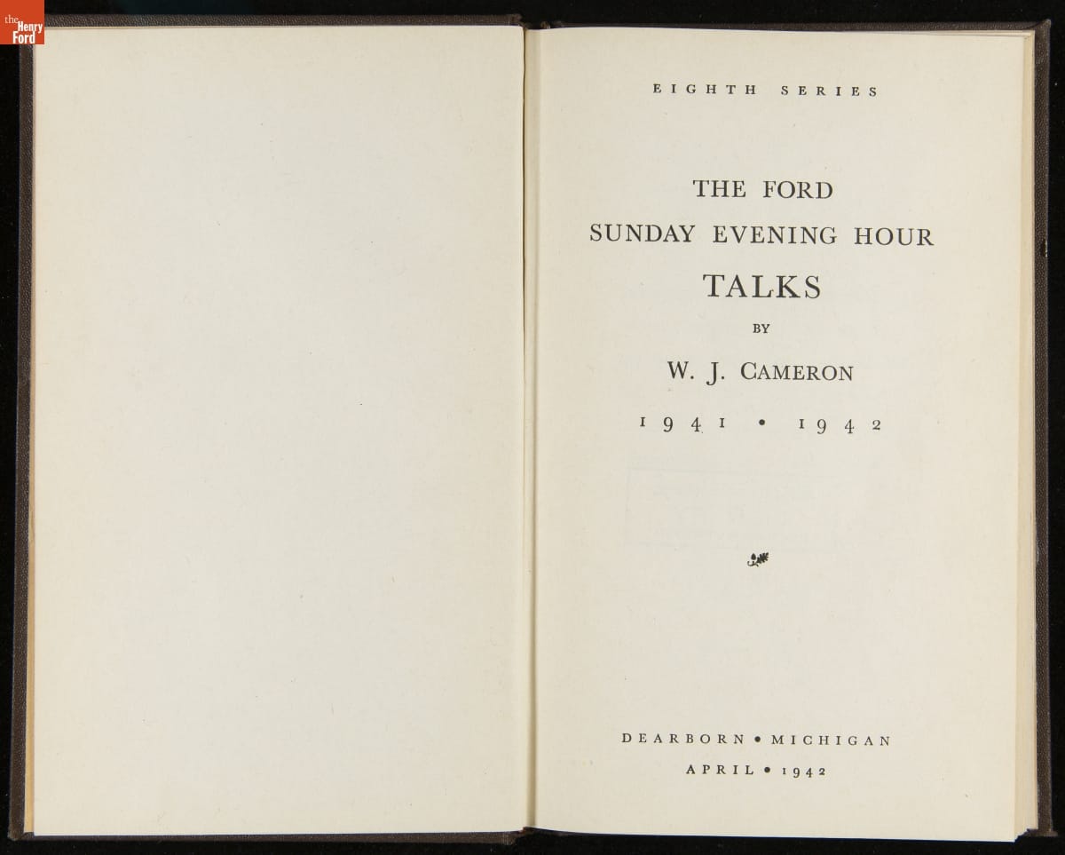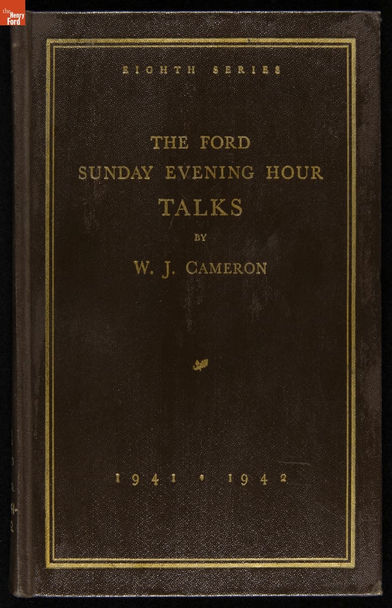 Launched in 1934, the Ford Sunday Evening Hour radio program featured classical music, guest soloists and conductors, and a weekly talk during intermission. Henry Ford asked his friend and advisor William J. Cameron to write and deliver these messages. Cameron, who composed the anti-Semitic articles for The Dearborn Independent, now peddled softer populist views--avoiding extremes and any direct attacks on politicians, ethnic groups, or Wall Street financiers.