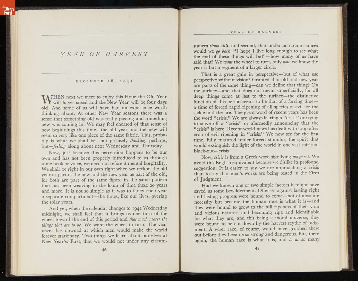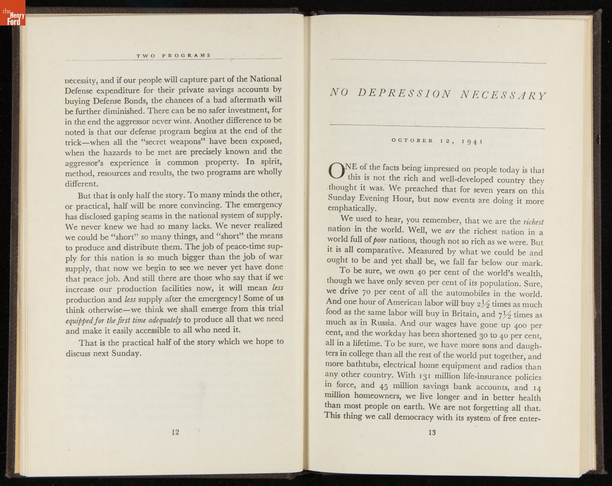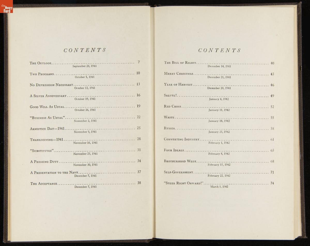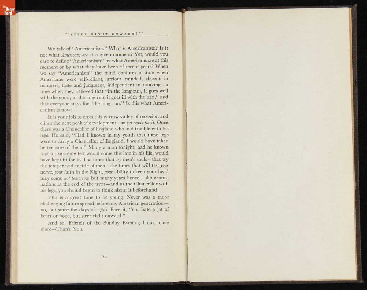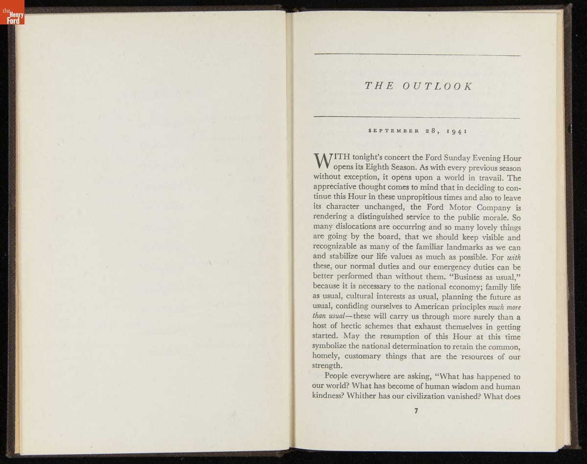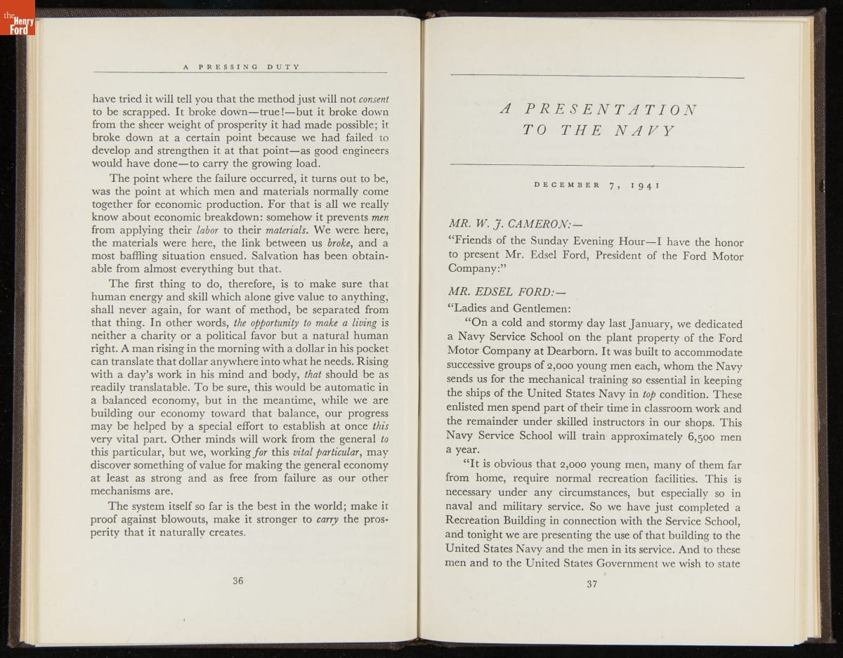 Launched in 1934, the Ford Sunday Evening Hour radio program featured classical music, guest soloists and conductors, and a weekly talk during intermission. Henry Ford asked his friend and advisor William J. Cameron to write and deliver these messages. Cameron, who composed the anti-Semitic articles for The Dearborn Independent, now peddled softer populist views--avoiding extremes and any direct attacks on politicians, ethnic groups, or Wall Street financiers.