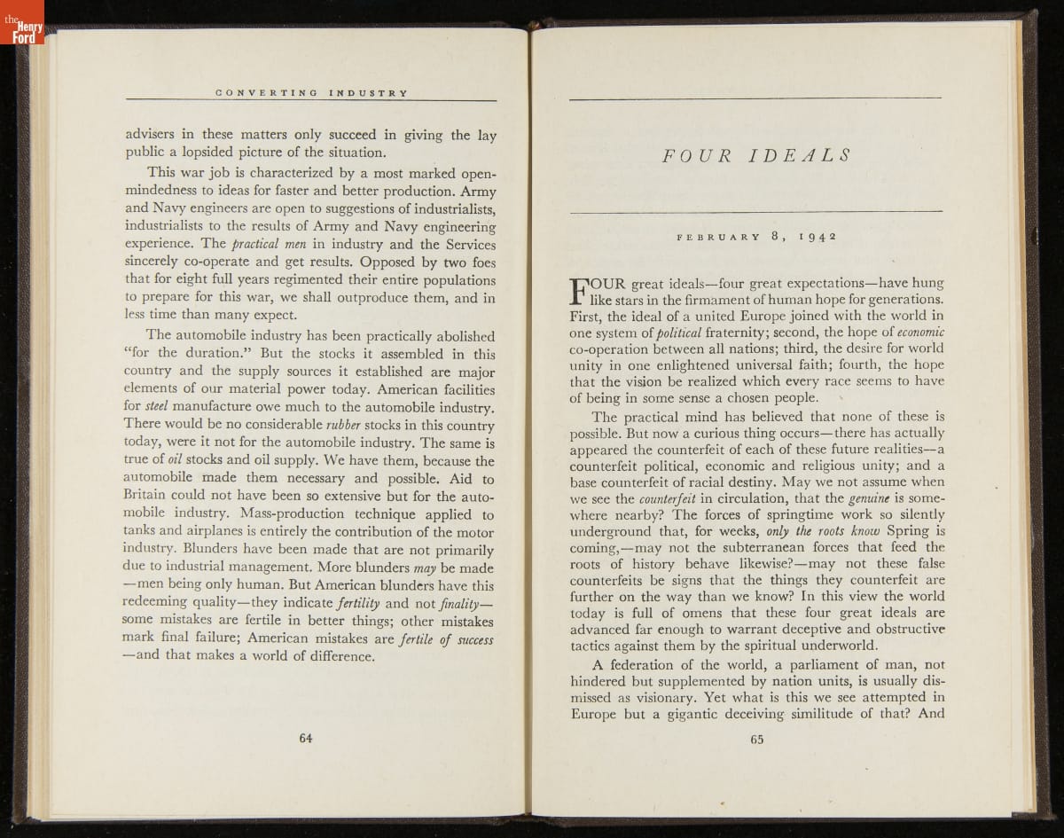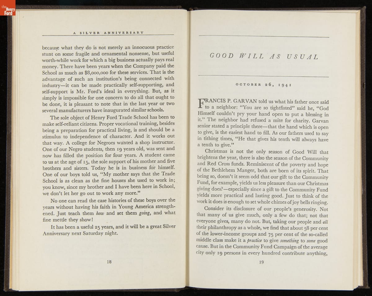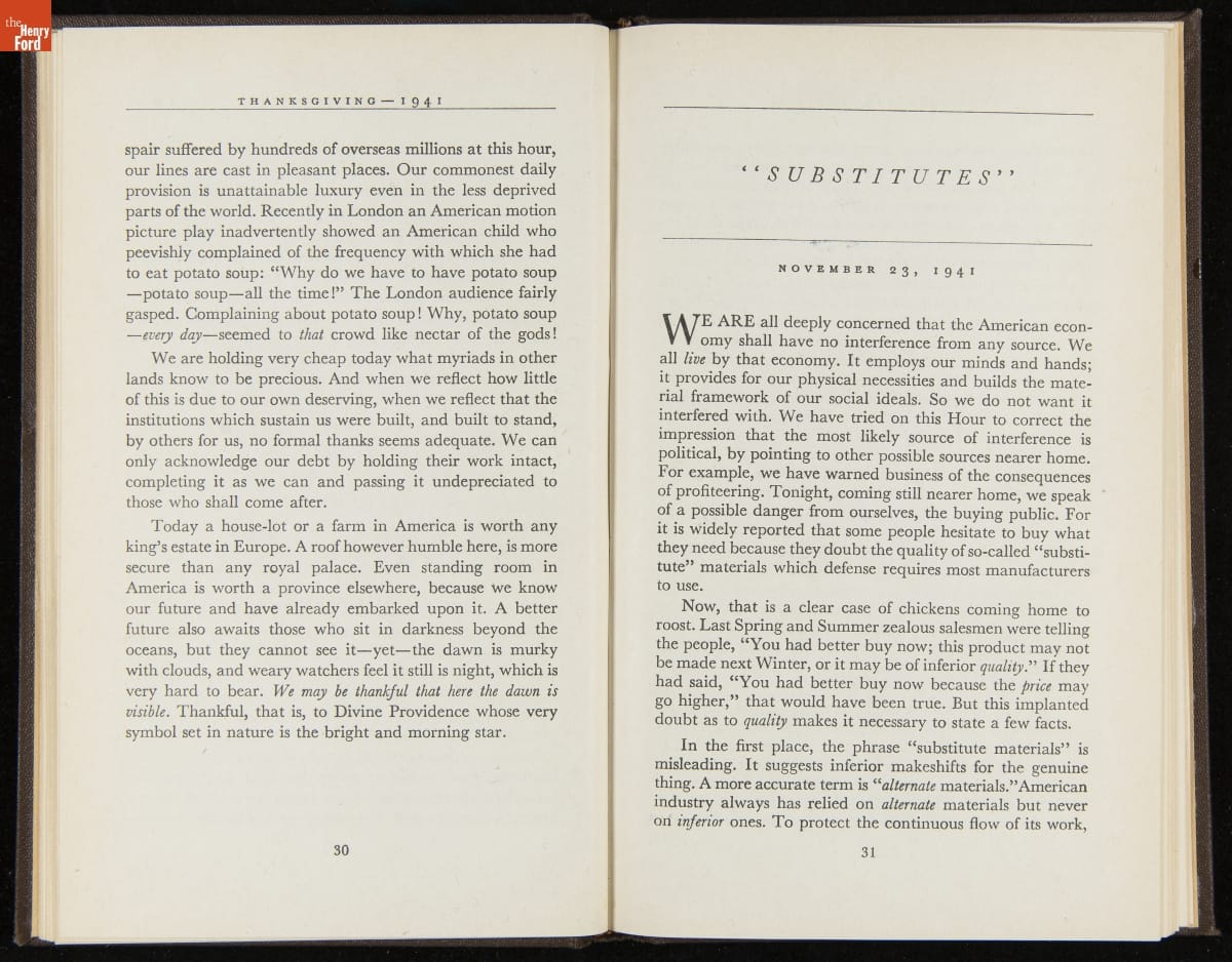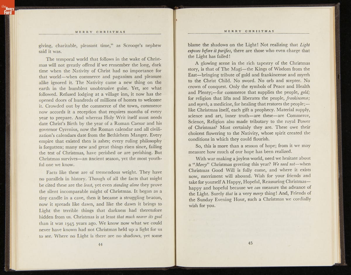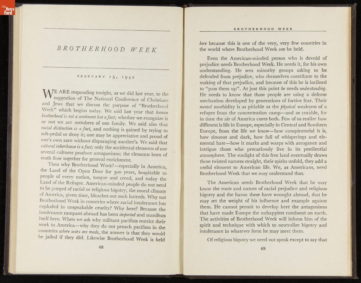 Launched in 1934, the Ford Sunday Evening Hour radio program featured classical music, guest soloists and conductors, and a weekly talk during intermission. Henry Ford asked his friend and advisor William J. Cameron to write and deliver these messages. Cameron, who composed the anti-Semitic articles for The Dearborn Independent, now peddled softer populist views--avoiding extremes and any direct attacks on politicians, ethnic groups, or Wall Street financiers.