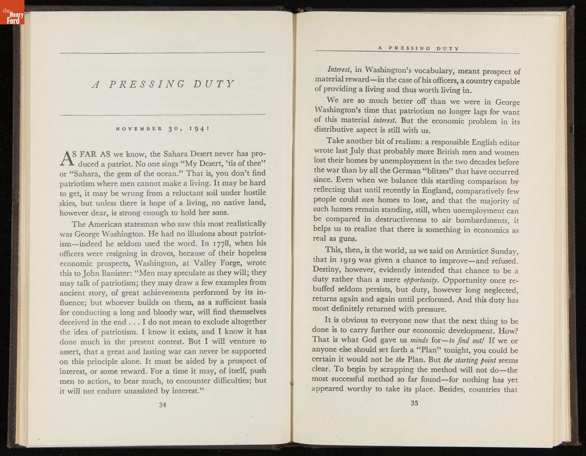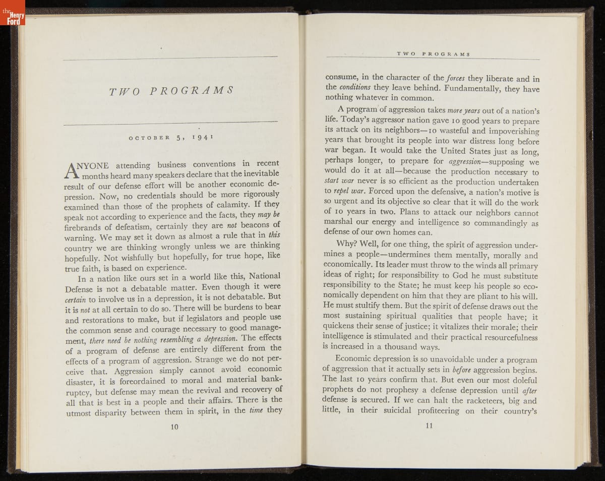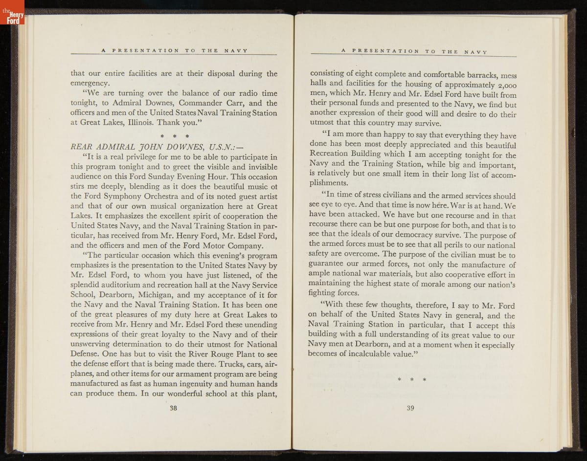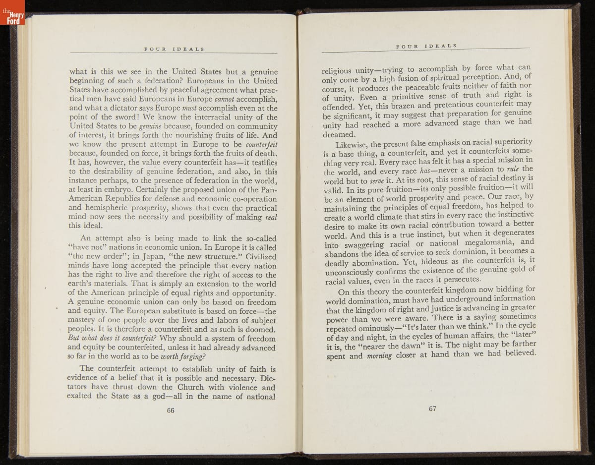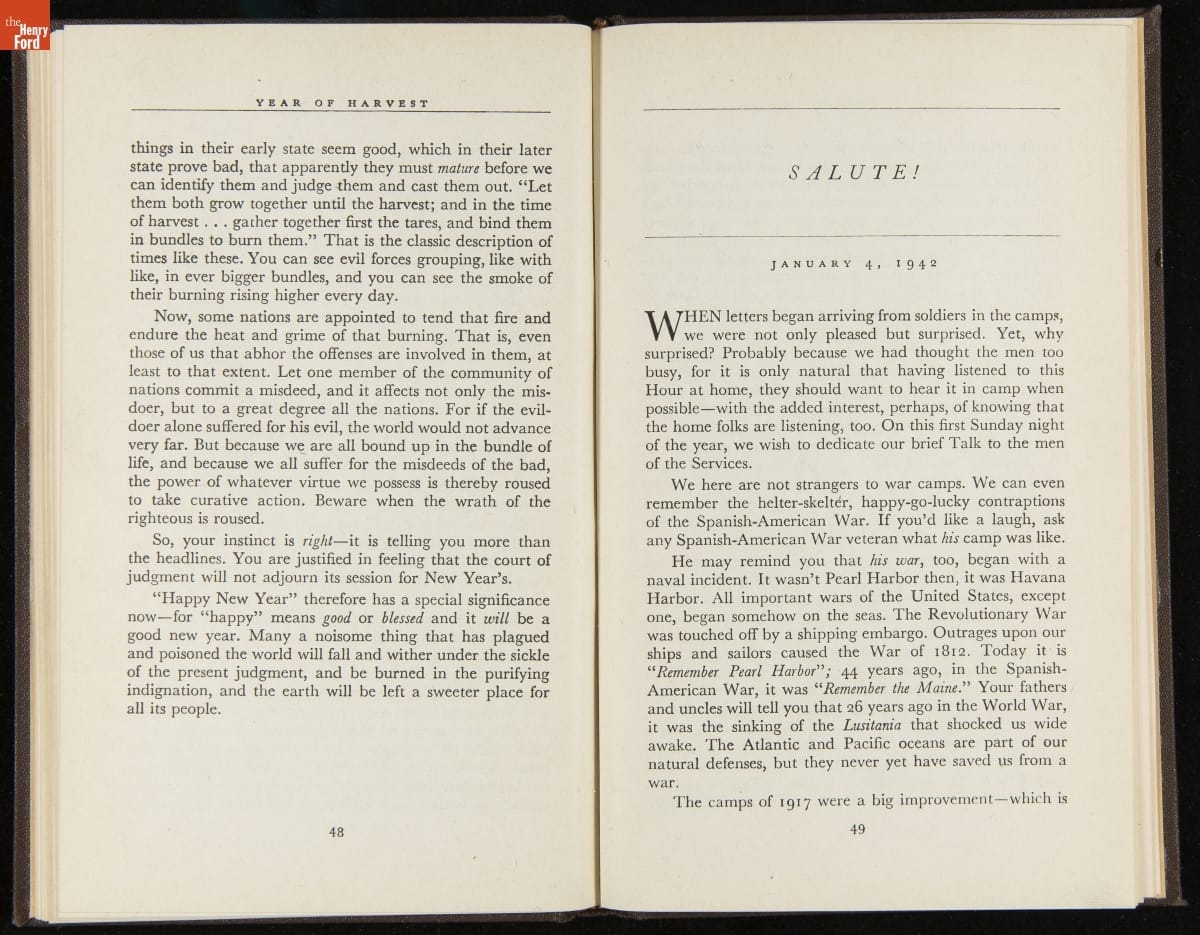 Launched in 1934, the Ford Sunday Evening Hour radio program featured classical music, guest soloists and conductors, and a weekly talk during intermission. Henry Ford asked his friend and advisor William J. Cameron to write and deliver these messages. Cameron, who composed the anti-Semitic articles for The Dearborn Independent, now peddled softer populist views--avoiding extremes and any direct attacks on politicians, ethnic groups, or Wall Street financiers.