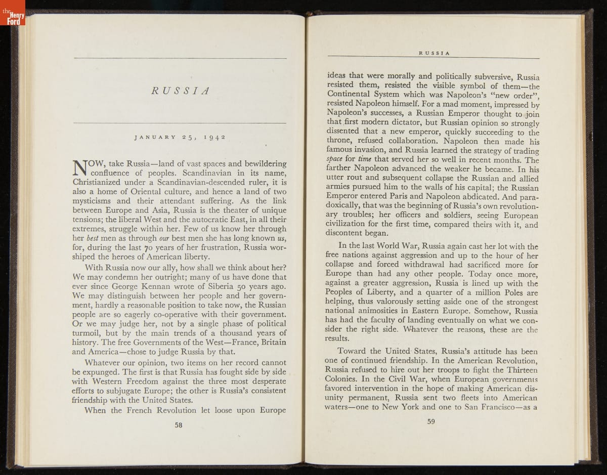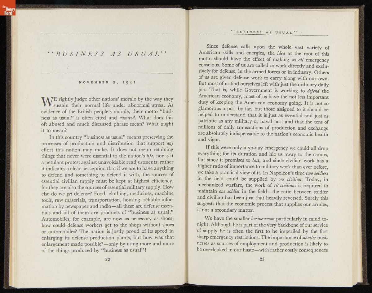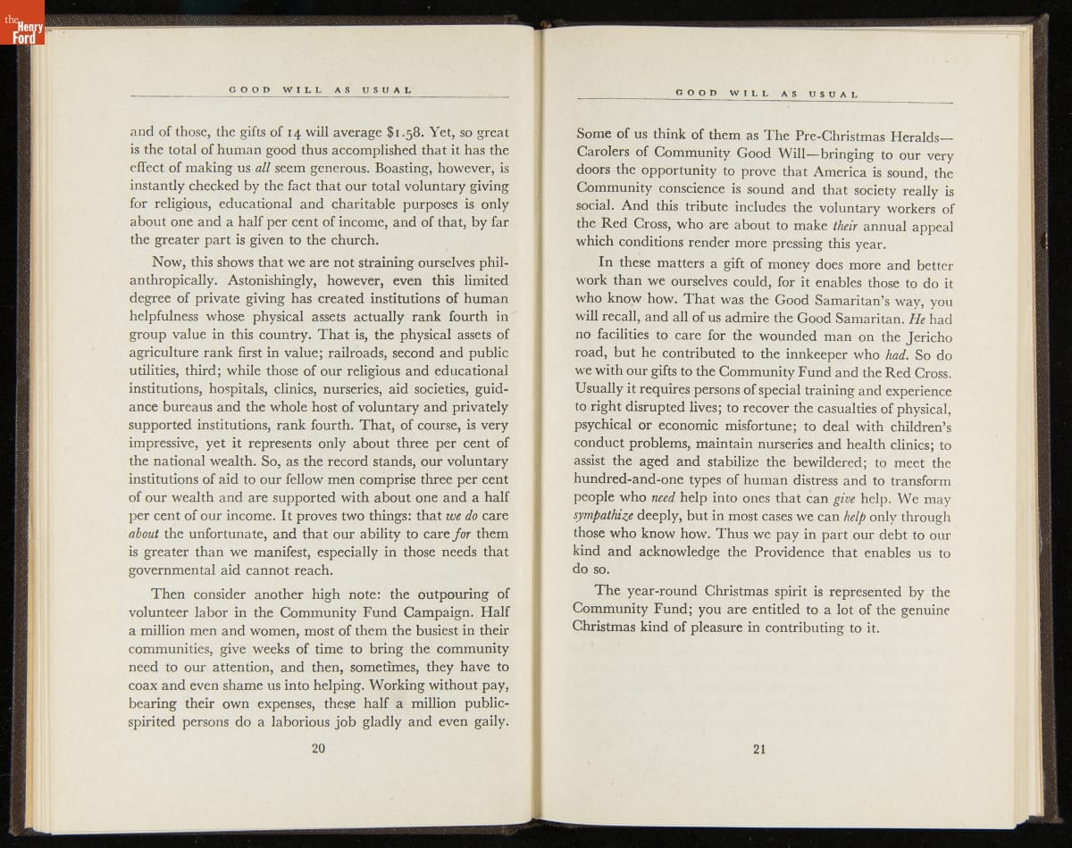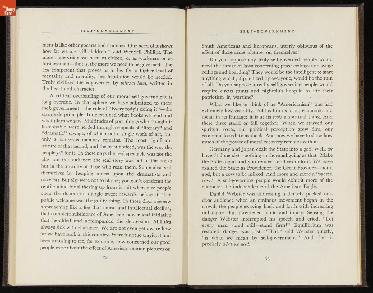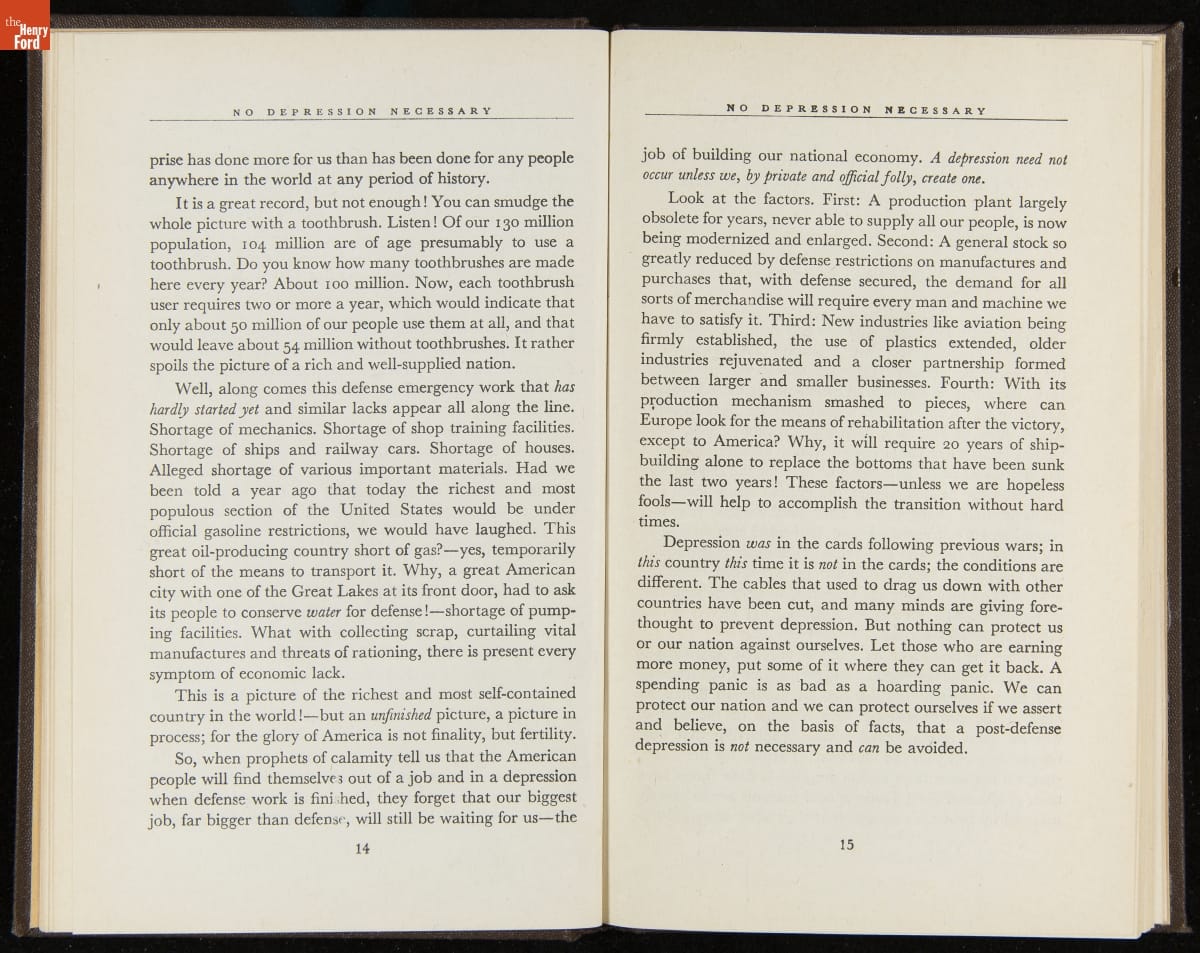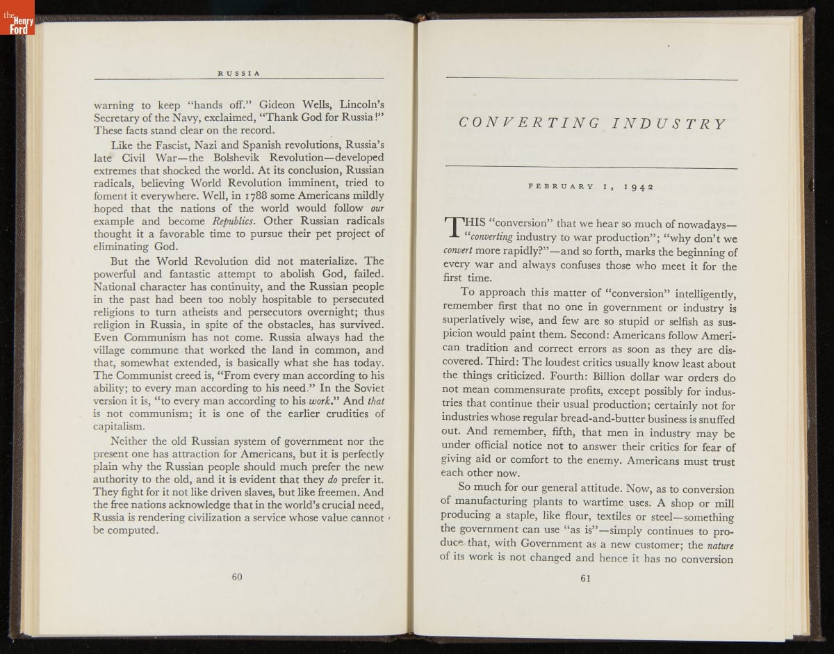 Launched in 1934, the Ford Sunday Evening Hour radio program featured classical music, guest soloists and conductors, and a weekly talk during intermission. Henry Ford asked his friend and advisor William J. Cameron to write and deliver these messages. Cameron, who composed the anti-Semitic articles for The Dearborn Independent, now peddled softer populist views--avoiding extremes and any direct attacks on politicians, ethnic groups, or Wall Street financiers.