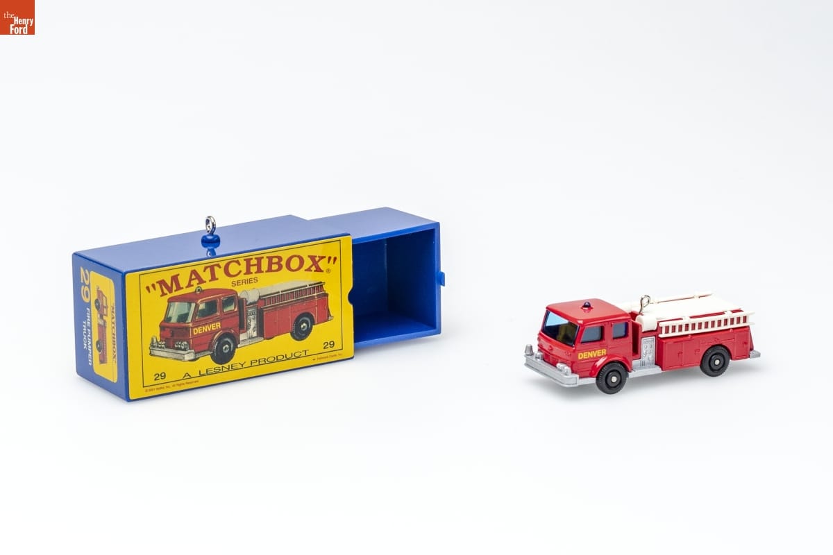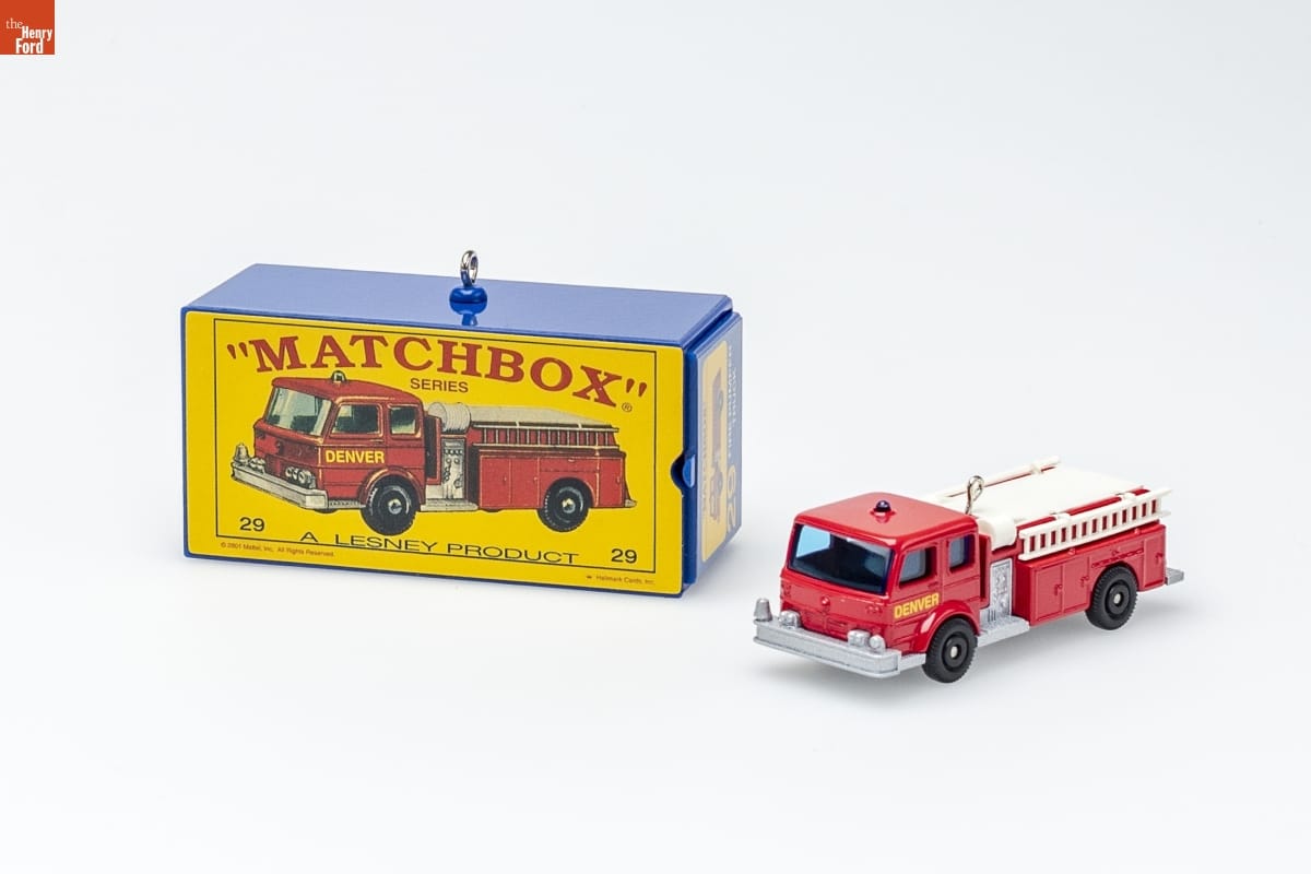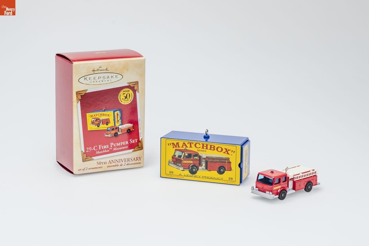 ornament, underside: (C) 2001 Mattel, Inc. / All Righs Reserved. / 2002 / [TM] / Hallmark Cards, Inc. packaging, front: [TM] / Hallmark / KEEPSAKE / ORNAMENT / MATCHBOX / 50 / YEARS / 1952-2002 / Christmas 2002 / 29-C FIRE PUMPER SET / Matchbox [TM] Miniatures / 50TH ANNIVERSARY / set of 2 ornaments / ensemble de 2 decorations packaging, back: 29-C FIRE PUMPER SET / Matchbox [TM] Miniatures / 50TH ANNIVERSARY / Beginning with a model line of / 3 die-cast miniature toys in 1953, Matchbox Miniatures had grown to / a line of 75 by the 1960s, The "Denver" / arrived in 1966. It was one of 3 / number 29-C Fire Pumpers which / appeared in the I-75 Series that year. / This set of Keepsake Ornaments / replicates both the Denver Fire / Pumper and its original "Matchbox" / series container, a combination / highly prized by collectors. / CHRISTMAS / MEMORY CARD / ENCLOSED / For decorative use only. Not for young children. / Concue a des fins decoratives seulement. / Ne convient pas aux jeanes enfants. / Handcrafted and Die-Cast Metal - Dated 2002 packaging, underside: Matchbox logo and the color "Matchbox orange," and associated / trademarks designated by TM are U.S. trademarks of Mattel, Inc. / (C) 2001 Mattel, Inc. ALl Rights Reserved. / Mfd. Hallmark Cards, Inc., Kansas City, MO 64141 / Made in China QXI8846