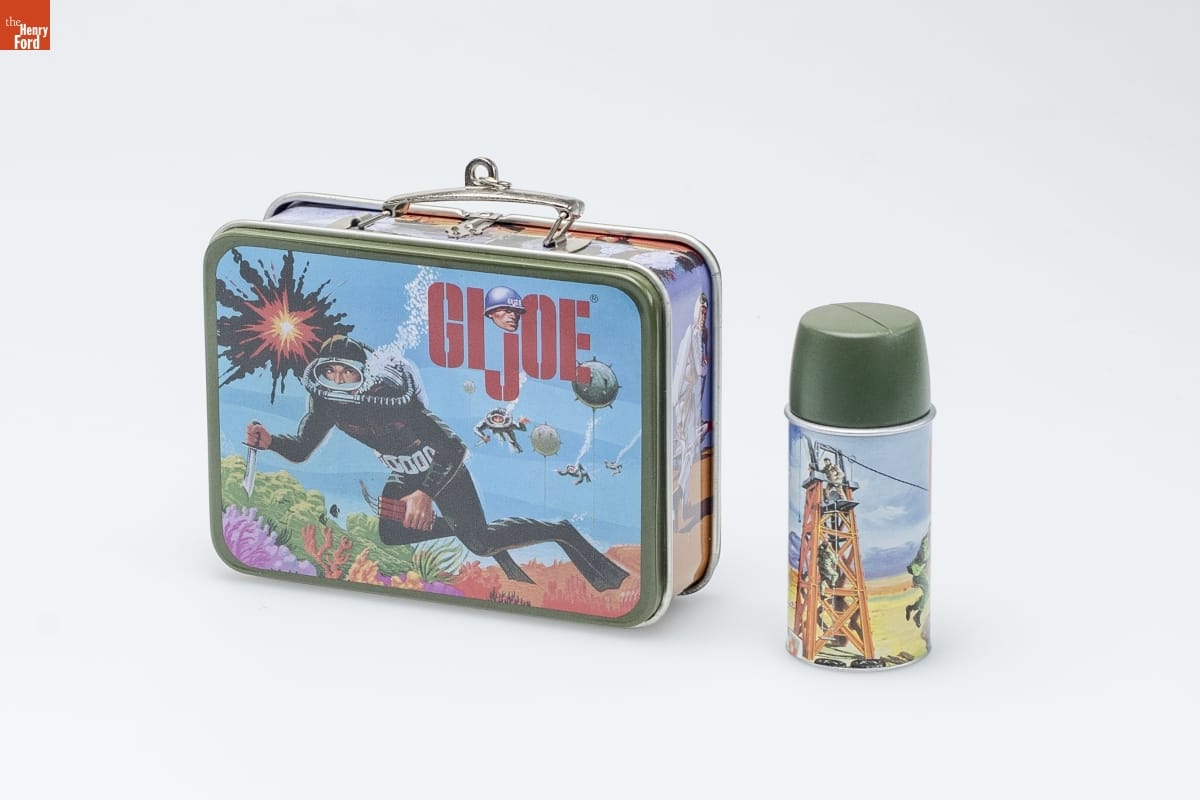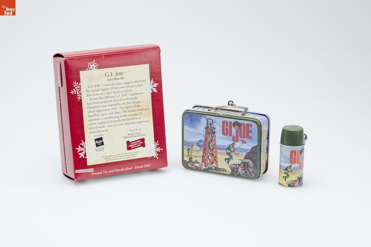 G.I. JOE [TM] / Lunchbox Set / G.I. JOE [TM] -- even the name suggests adventure! / No wonder legions of boys were proud to have / their hero carry their lunch to school. / At least five different G.I. JOE [TM] lunchboxes / have been produced. This set of Keepsake / Ornaments was inspired by the first design, / which appeared in 1967. The replica of the / lunchbox opens and closes. The second ornament / represents a coordinating drink container. It / can be displayed alongside the lunchbox or / placed inside -- just as it was when hot soup was a / noontime treat. / Licensed by: / Hasbro [R] / Consumer / Products / Rodney Gentry / Hallmark Keepsake Artist / CHRISTMAS / MEMORY CARD / ENCLOSED / For decorative use only. Not for young children. / Concues a des fins decoratives seulement. / Ne conviennent pas aux jeanes enfants. / Pressed Tin and Handcrafted - Dated 2002