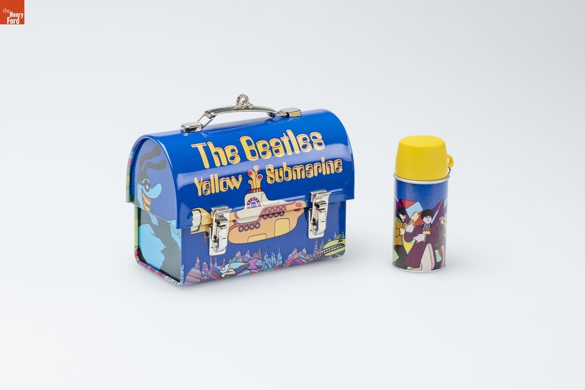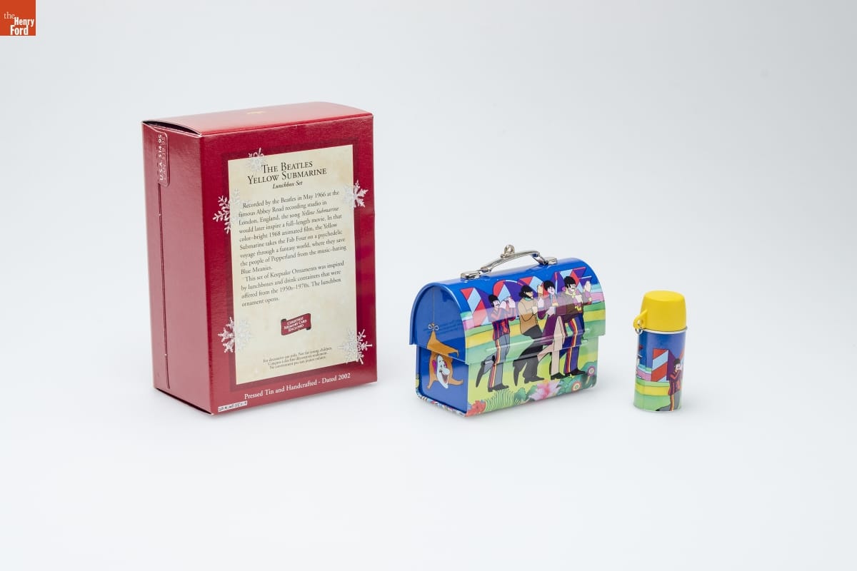 THE BEATLES / YELLOW SUBMARINE / Lunchbox Set / Recorded by the Beatles in May 1966 at the / famous Abbey Road recording studio in / London, England, the song Yellow Submarine / would later inspire a full-length movie. In that / color-bright 1968 animated film, the Yellow / Submarine takes the Fab Four on a psychedelic / voyage through a fantasy world, where they save / the people of Pepperland from the music-hating / Blue Meanies. / This set of Keepsake / Ornaments was inspired / by lunchboxes and drink containers that were / offered from the 1950s - 1970s. The lunchbox ornament opens. / CHRISTMAS / MEMORY CARD / ENCLOSED / For decorative use only. Not for young children. / Concues a des fins decoratives seulement. / Ne conviennent pas aux jeanes enfants. / Pressed Tin and Handcrafted - Dated 2002