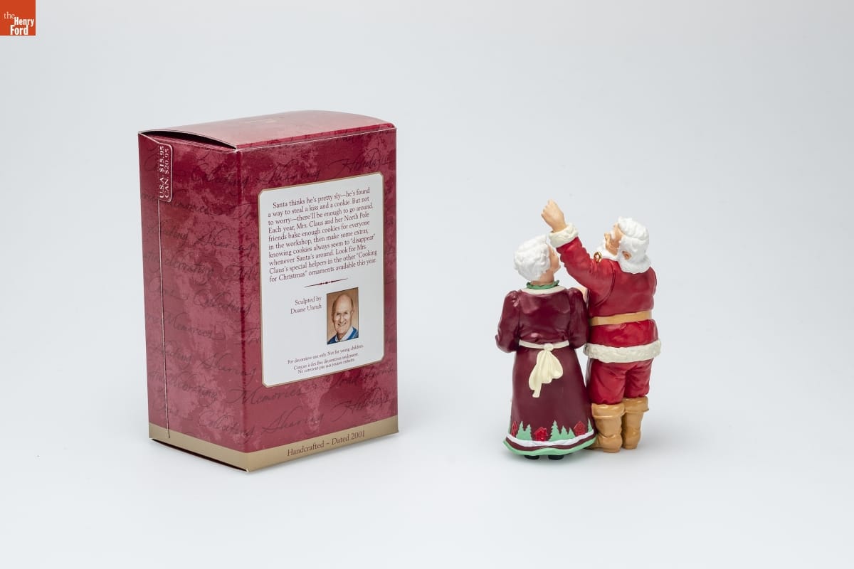Santa thinks he's pretty sly--he's found / a way to steal a kiss and a cookie. But not / to worry--there'll be enough to go around. / Each year, Mrs. Claus and her North Pole / friends bake enough cookies for everyone / in the workshop, then make some extras, / knowing cookies always seem to "disappear" / whenever Santa's around. Look for Mrs. / Claus's special helpers in the other "Cooking / for Christmas" ornaments available this year. / Sculpted by / Duane Unruh / For decorative use only. Not for young children. / Concue a des fins decoratives seulement. / Ne convient pas aux jeunes enfants. / Handcrafted - Dated 2001