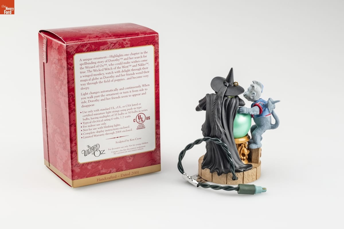 A unique ornament--Highlights one chapter in the / spellbinding story of Dorothy TM and her search for / the Wizard of Oz TM, who could make wishes come / true. The Wicked Witch of the West TM and Nikko TM, / a winged monkey, watch with delight through their / magical globe as Dorothy and her friends wend their / way through the field of poppies...and become very / sleepy. / Light changes automatically and continuously. When / you walk past the ornament or turn it from side to / side, Dorothy and her friends seem to appear and / disappear. / Use only with standard UL, cUL, or CSA listed or / certified miniature light strings using push-in type / bulbs, having multiples of 35 bulbs or 50 bulbs in series. / Typical electrical rating 6 volts, 1.2 watts. / For indoor use only. / Not for use with blinking lights. / Complete display instructions enclosed. / Limited Warranty through 2004 enclosed. / C UL(R) US / LISTED / ELECTRIC / ORNAMENT / Sculpted by Ken Crow / The / WIZARD / of OZ. / For decorative use only. Not for young children. / Concue a des fins decoratives seulement. / Ne convient pas aux jeunes enfants. / Handcrafted - Dated 2001