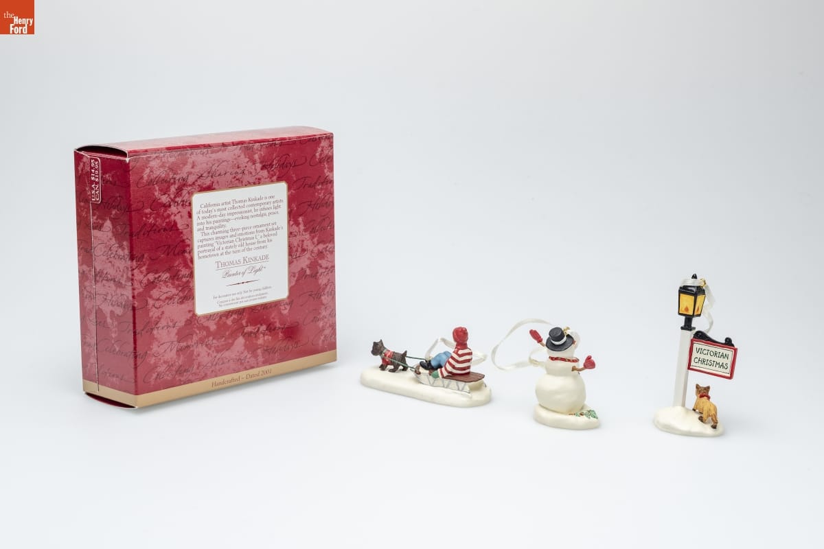California artist Thomas Kinkade is one / of today's most collected contemporary artists. / A modern-day impressionist, he infuses light / into his paintings--evoking nostalgia, peace, / and tranquility. / This charming three-piece ornament set / captures images and emotions from Kinkade's / painting "Victorian Christmas I," a beloved / portrayal of a stately old house from his / hometown at the turn of the century. / THOMAS KINKADE / Painter of Light TM / For decorative use only. Not for young children. / Concue a des fins decoratives seulement. / Ne convient pas aux jeunes enfants. / Handcrafted - Dated 2001