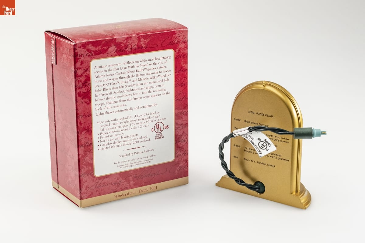 A unique ornament--Reflects one of the most breathtaking / scenes in the film Gone With the Wind. As the city of / Atlanta burns, Captain Rhett Butler TM guides a stolen / horse and wagon through the flames and mobs to rescue / Scarlett O'Hara TM, Prissy TM, and Melanie Wilkes TM and her / baby. Rhett then lifts Scarlett from the wagon and bids / her farewell. Scarlett, frightened and angry, cannot / believe that he could leave her to join the retreating / troops. Dialogue from this famous scene appears on the / back of this ornament. / Lights flicker automatically and continuously. / Use only with standard UL, cUL, or CSA listed or / certified miniature light strings using push-in type / bulbs, having multiples of 35 bulbs or 50 bulbs in series. / Typical electrical rating 6 volts, 1.2 watts. / For indoor use only. / Not for use with blinking lights. / Complete display instructions enclosed. / Limited Warranty through 2004 enclosed. / C UL(R) US / LISTED / ELECTRIC / ORNAMENT / Sculpted by Patricia Andrews / For decorative use only. Not for young children. / Concue a des fins decoratives seulement. / Ne convient pas aux jeunes enfants. / Handcrafted - Dated 2001