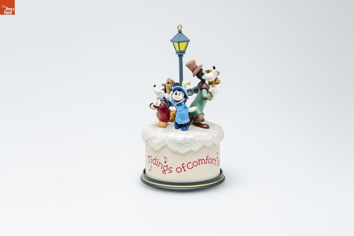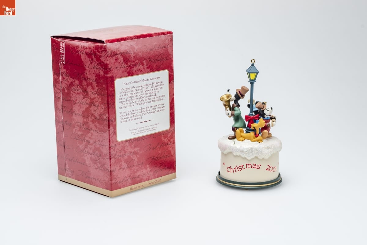 Plays "God Rest Ye Merry, Gentlemen" / It's going to be an old-fashioned Christmas / for Mickey and his pals! They're all dressed up / in outfits reminiscent of carolers in Victorian / times...sharing the joy of the holidays by / serenading their neighbors and friends. / The music box melody invites you to join the / familiar refrain "O tidings of comfort and joy..." / To hear the music and see the carolers revolve / around the base, wind the base of the ornament / clockwise and release. (See "windup" arrow on / bottom of ornament.) / For decorative use only. Not for young children. / Concue a des fins decoratives seulement. / Ne convient pas aux jeunes enfants. / Handcrafted - Dated 2001