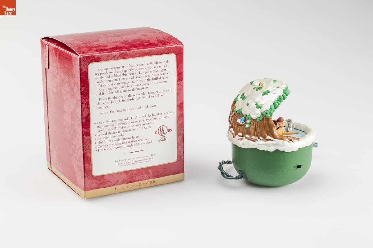 A unique ornament--Thumper entices Bambi onto the / icy pond, and Bambi quickly discovers that he's not as / surefooted as his rabbit friend. Thumper enjoys a good / laugh, then joins Flower and other forest friends who are / offering advice and encouragement to the baffled fawn. / At the moment, Bambi is trying to regain his footing / and finds himself going in all directions! / To see Bambi spin on the ice, while Thumper turns and / Flower rocks back and forth, slide switch on side of / ornament. / To stop the motion, slide switch back again. / Use only with standard UL, cUL, or CSA listed or certified / miniature light strings using push-in type bulbs, having / multiples of 35 bulbs or 50 bulbs in series. / Typical electrical rating 6 volts, 1.2 watts. / For indoor use only. / Not for use with blinking lights. / Complete display instructions enclosed. / Limited Warranty through 2004 enclosed. / C UL(R) US / LISTED / ELECTRIC / ORNAMENT / For decorative use only. Not for young children. / Concue a des fins decoratives seulement. / Ne convient pas aux jeunes enfants. / Handcrafted - Dated 2001