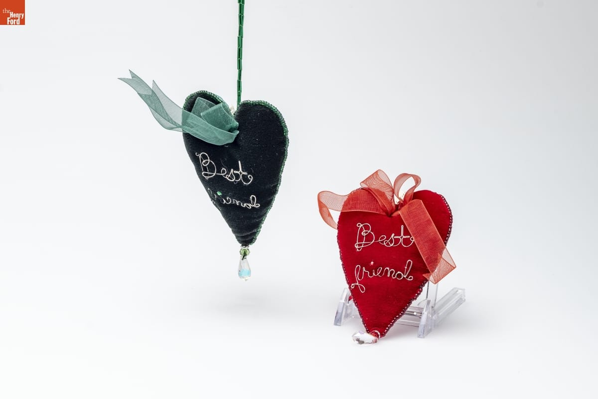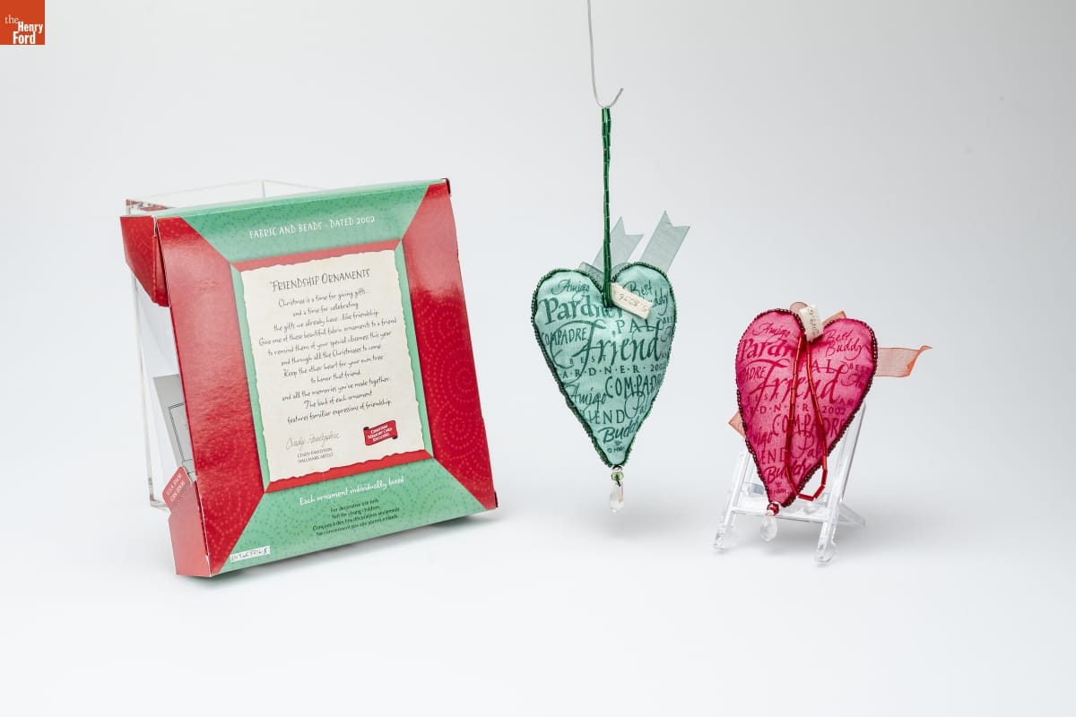 FABRIC AND BEADS - DATED 2002 / FRIENDSHIP ORNAMENTS / Christmas is a time for giving gifts ... / and a time for celebrating / the gifts we already have ... like friendship. / Give one of these beautiful fabric ornaments to a friend / to remind them of your special closeness this year / and through all the Christmases to come. / Keep the other heart for your own tree / to honor that friend / and all the memories you've made together. / The back of each ornament / features familiar expressions of friendship. / CINDY PAWLYSHN / HALLMARK ARTIST / CHRISTMAS / MEMORY CARD / ENCLOSED / Each ornament individually boxed / For decorative use only. / Not for young children. / Concues a des fins decoratives seulement. / Ne conviennent pas aux jeanes enfants.
