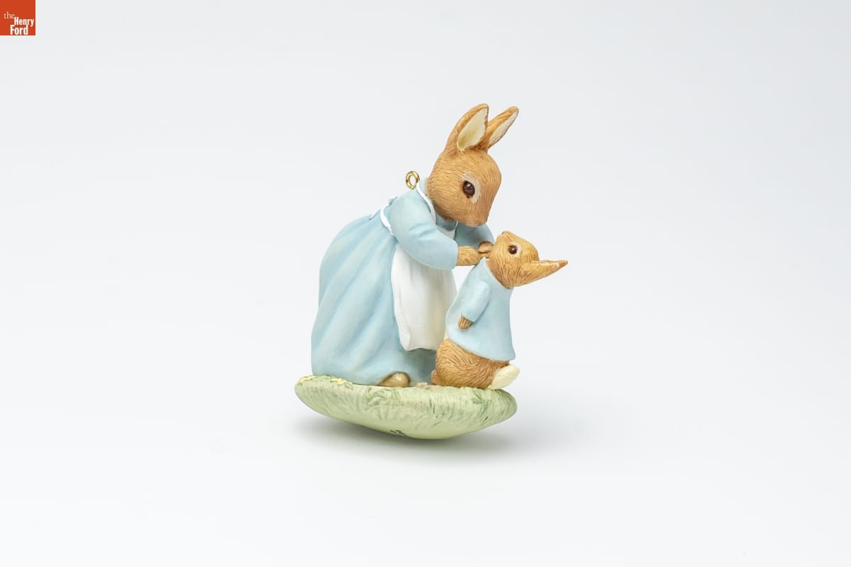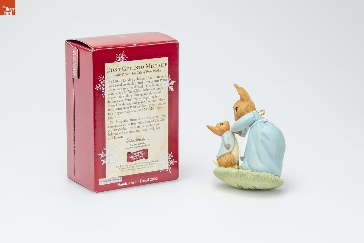 DON'T GET INTO MISCHIEF / Beatrix Potter, The Tale of Peter Rabbit / In 1902, a London publishing house put out a / book based on an illustrated letter Beatrix Potter / had written to a friend's child. One hundred / years later, The Tale of Peter Rabbit continues / to entertain children throughout the world. / In this scene, Peter's mother is getting him / dressed for the day and giving him some play- / time instructions Peter will later ignore, leading / to a dangerous chase around Mr. McGregor's / garden. / This Keepsake Ornament celebrates the 100th / anniversary of the first publication of The Tale / of Peter Rabbit. It remains one of the most / beloved and enduring stories any child has / ever known. / LaDene Votruba / Hallmark Keepsake Artist / CHRISTMAS / MEMORY CARD / ENCLOSED / For decorative use only. Not for young children. / Concue a des fins decoratives seulement. / Ne convient pas aux jeanes enfants. / Handcrafted - Dated 2002