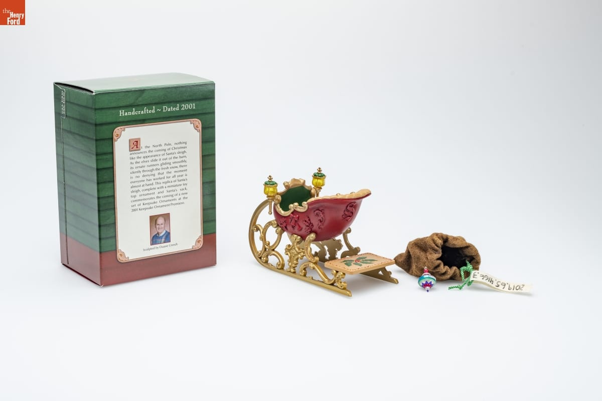Handcrafted - 2001 / At the North Pole, nothing / announces the coming of Christmas / like the appearance of Santa's sleigh. / As the elves slide it out of the barn, / its ornate runners gliding smoothly, / silently through the fresh snow, there / is no denying that the moment / everyone has worked for all year is / almost at hand. This replica of Santa's / sleigh, complete with a miniature toy / top ornament and Santa's sack, / commemorates the coming of a new / set of Keepsake Ornaments at the / 2001 Keepsake Ornament Premiere. / Sculpted by Duane Unruh