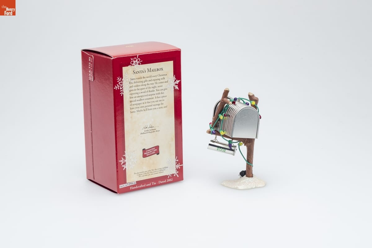 SANTA'S MAILBOX / Santa travels the world every Christmas / Eve, delivering gifts and enjoying milk / and cookies along the way. He comes and / goes in the quiet of the night, never / expecting a word of thanks. You can give / him an unexpected surprise with this / special mailbox ornament. It has a piece / of notepaper in it that you can use to leave your own personal message for / Santa. Maybe he'll leave you a note, too! / Linda Sickman / Hallmark Keepsake Artist / CHRISTMAS / MEMORY CARD / ENCLOSED / For decorative use only. Not for young children. / Concue a des fins decoratives seulement. / Ne convient pas aux jeanes enfants. / Handcrafted and Tin - Dated 2002