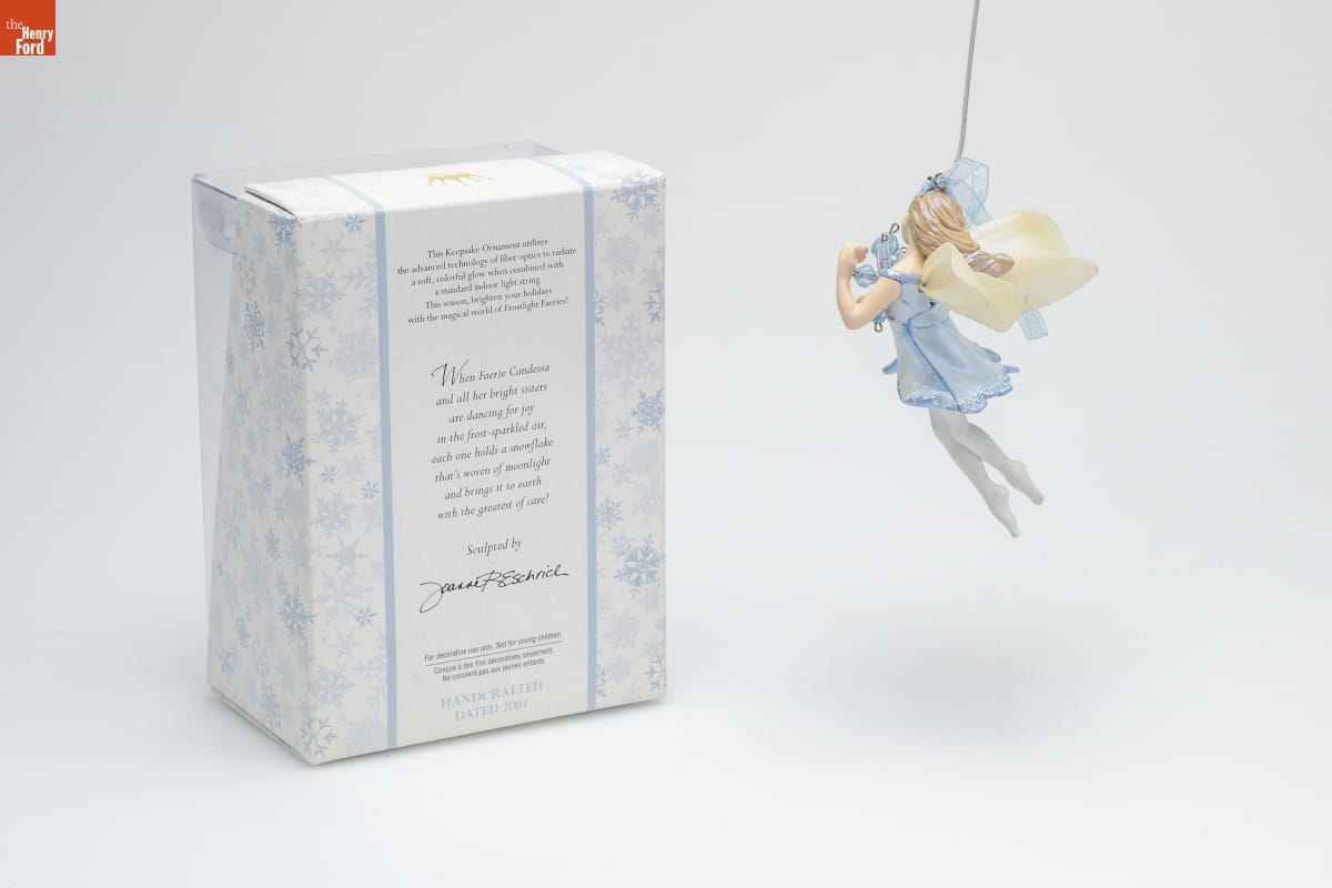 This Keepsake Ornament utilizes / the advanced technology of fiber optics to radiate / a soft, colorful glow when combined with / a standard indoor light string. / This season, brighten your holidays / with the magical world of Frostlight Faeries! / When Faerie Candessa / and all her bright sisters / are dancing for joy / in the frost-sparkled air, / each one holds a snowflake / that's woven of moonlight / and brings it to earth / with the greatest of care! / Sculpted by / Joanne Eschrich / For decorative use only. Not for young children. / Concue a des fins decoratives seulement. / Ne convient pas aux jeunes enfants. / HANDCRAFTED / DATED 2001