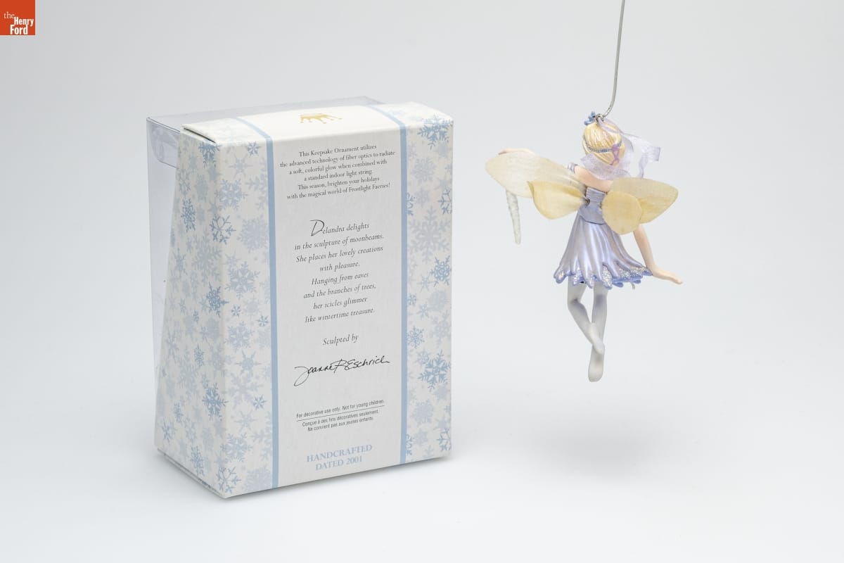 This Keepsake Ornament utilizes / the advanced technology of fiber optics to radiate / a soft, colorful glow when combined with / a standard indoor light string. / This season, brighten your holidays / with the magical world of Frostlight Faeries! / Delandra delights / in the sculpture of moonbeams. / She places her lovely creations / with pleasure. / Hanging from eaves / and the branches of trees, / her icicles glimmer / like wintertime treasure. / Sculpted by / Joanne Eschrich / For decorative use only. Not for young children. / Concue a des fins decoratives seulement. / Ne convient pas aux jeunes enfants. / HANDCRAFTED / DATED 2001