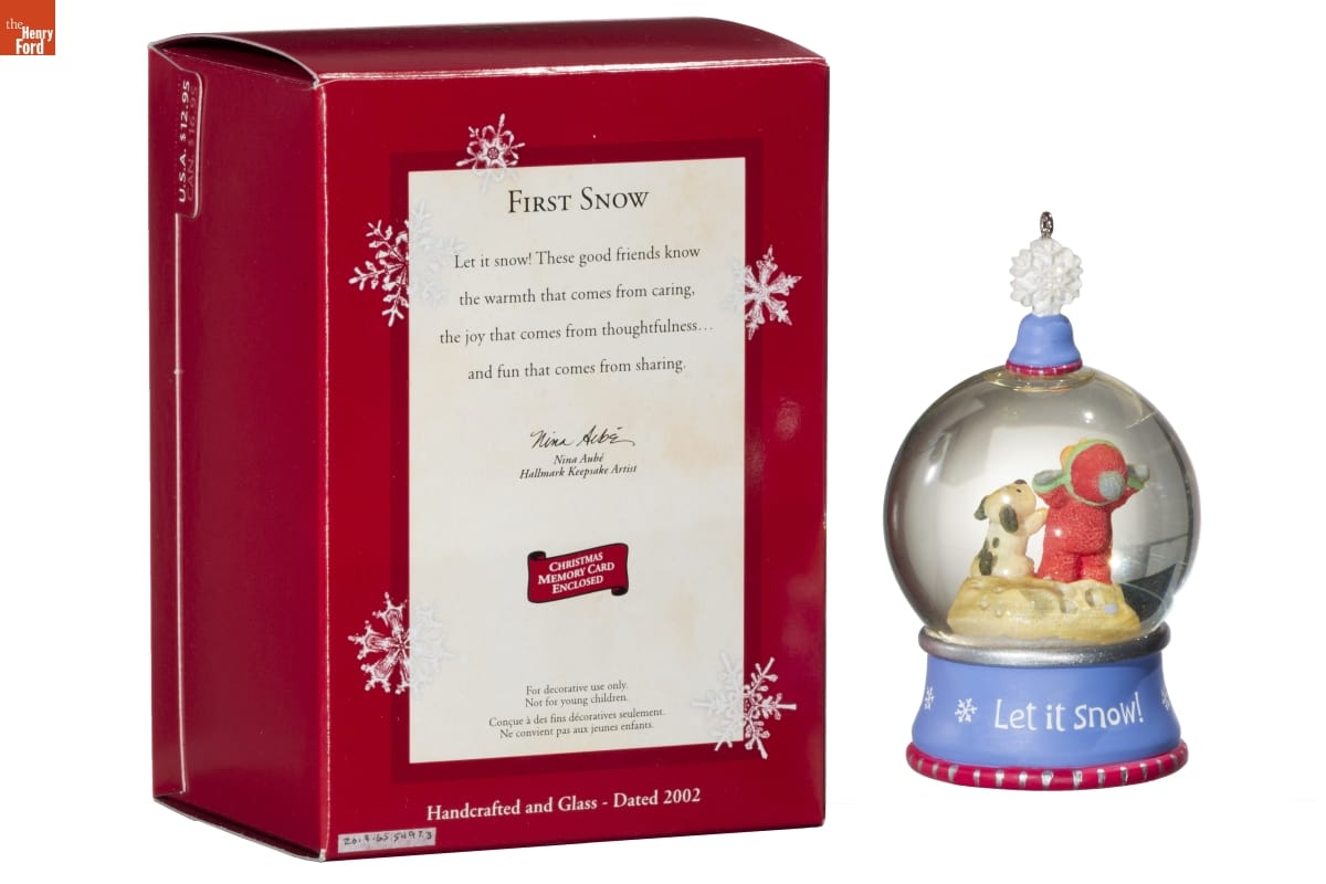 FIRST SNOW / Let it snow! These good friends know / the warmth that comes from caring, / the joy that comes from thoughtfulness ... / and fun that comes from sharing. / Nina Aube / Hallmark Keepsake Artist / CHRISTMAS / MEMORY CARD / ENCLOSED / For decorative use only. / Not for young children. / Concue a des fins decoratives seulement. / Ne convient pas aux jeanes enfants. / Handcrafted and Glass - Dated 2002